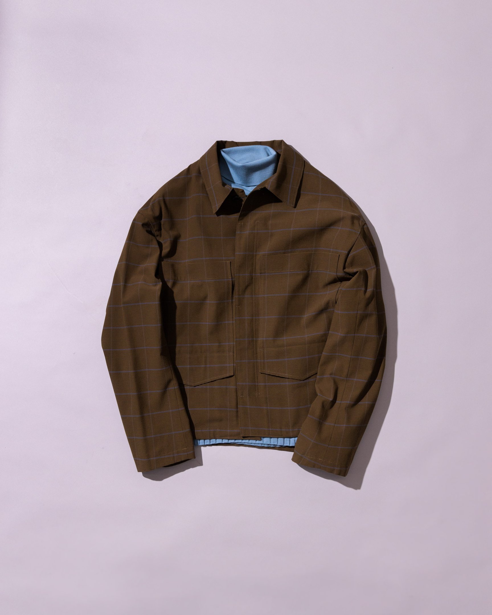 シャツのようなライトな質感のブルゾンは「ウジョー(UJOH)」のもの。袖丈が長く、ドロップショルダーのためルーズな印象ながらも、メリハリを感じるショート丈が今っぽさを演出。大きな胸ポケットの存在感を強調させる比翼仕立ては、ブランドらしいこだわりを感じます。チェック柄に使用されているライトブルーと同じ色味のインナーを合わせると、一気にこなれ感が生まれます。