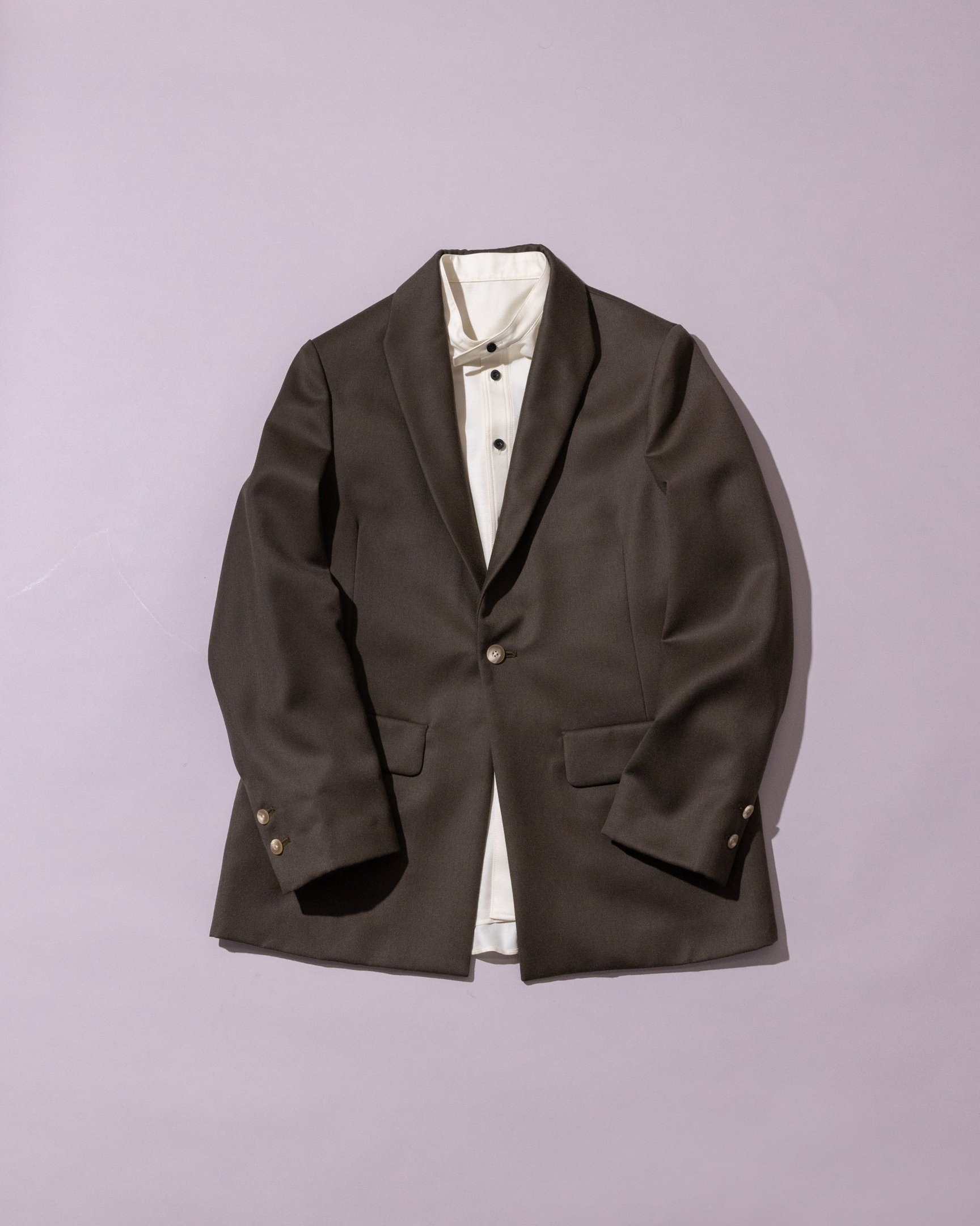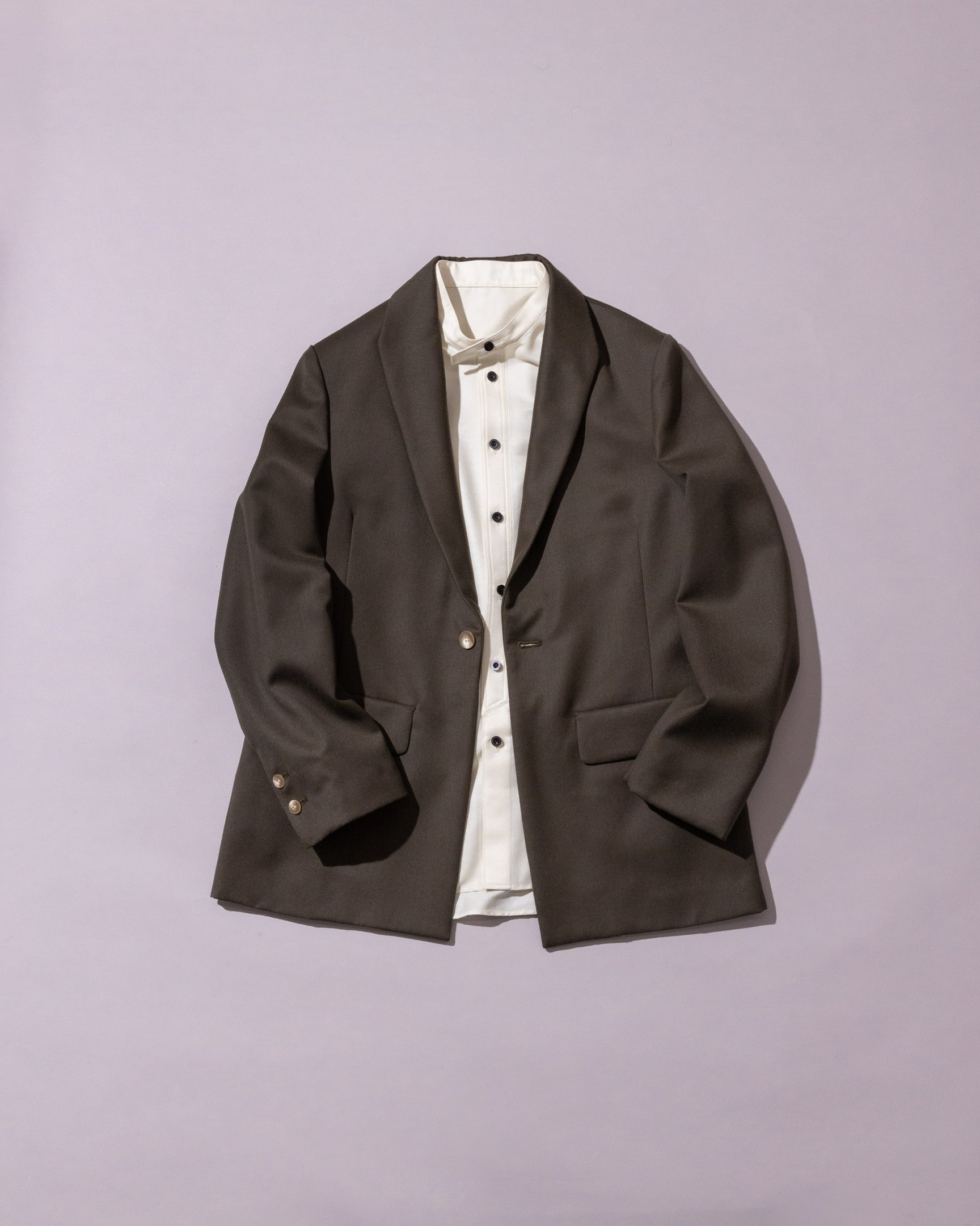 2020年にスタートした新進気鋭ブランド「イレニサ(IRENISA)」からは、アーミーグリーンのシングルジャケットをご紹介。ジャストなサイズ感ですが、身頃やアームに程よくゆとりを取り入れているので着脱がスムーズで動きやすいです。シンプルなデザインの中に高いパターン技術が盛り込まれており、同じサイズを185cmの男性が着ても155cmの女性が着ても綺麗に収まります。淡い色のバンドカラーシャツやモックネックのトップスを合わせてコントラストを楽しむ着こなしがおすすめ。