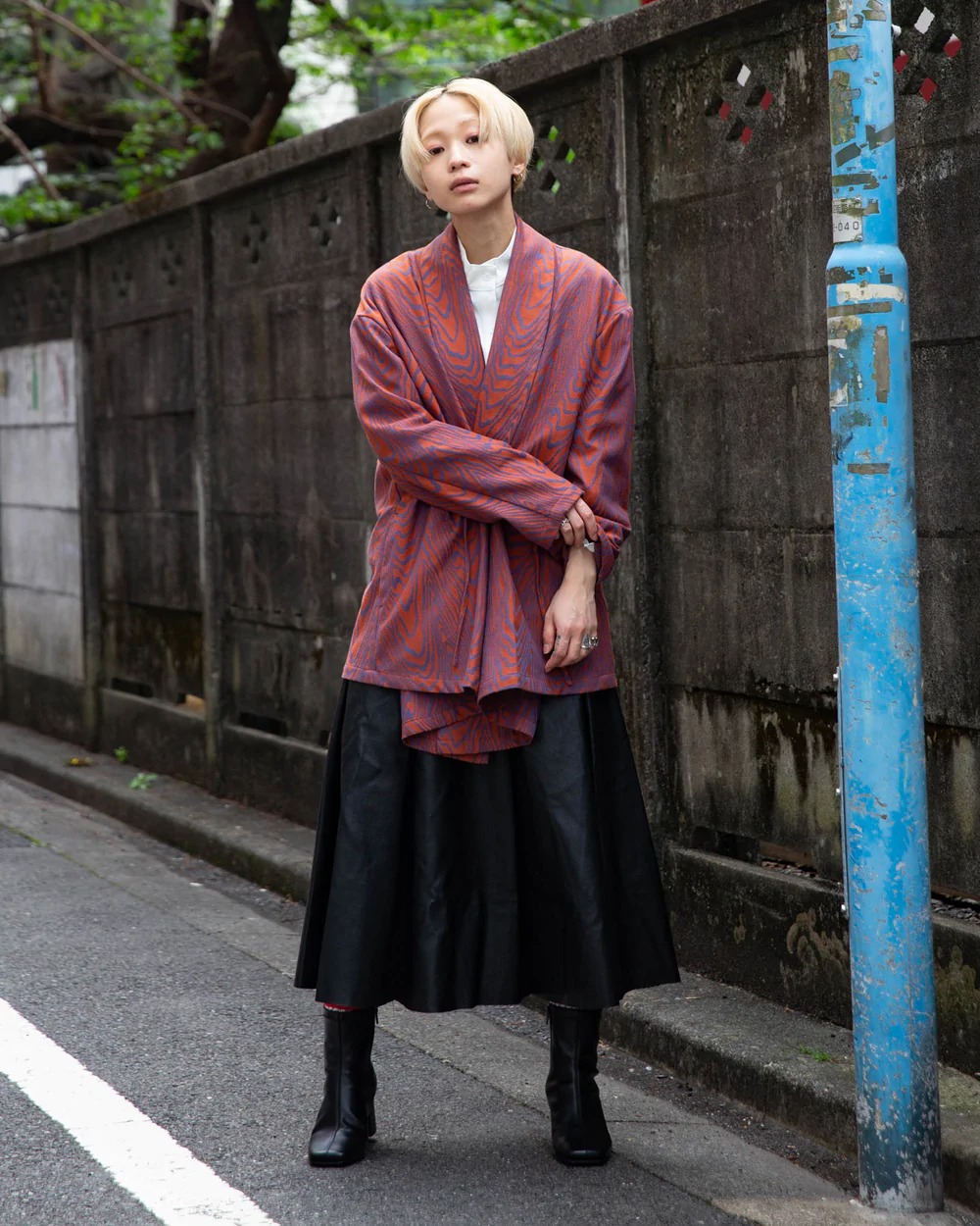 サイケデリックな柄が目を惹くガウンジャケットは「ミオズモ―キー(MIOSMOKEY)」から。フロントにあるストラップでウエスト絞ったり、ラフに着流したりとアレンジしやすいアイテムです。生地感は落ち感のある柔らかな風合いで、季節の変わり目に活躍すること間違いなし。キレイめブラウスと合わせて、ジャケットを主役にしたスタイリングはいかが?