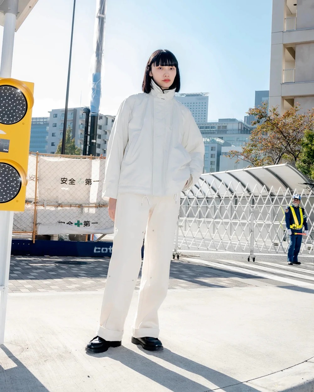 最初にご紹介するのが、デッキジャケットをベースにデザインし、大人っぽく着られるようにアップデートした「エイトン(ATON)」のニドムウェザーデッキジャケット。保温性のある中綿を高密度な生地の内側に入れている為、コットンのアウターとは思えないほどの暖かさが特徴です。オーバサイズシルエットで、衿元のボアは着脱可能。外すことで春先のアウターとしても愛用できます。「タナカ(TANAKA)」のホワイトデニムと合わせれば、ミリタリーテイストのホワイトコーデに。衿はスタンドするとモードっぽさが加わりオススメです!