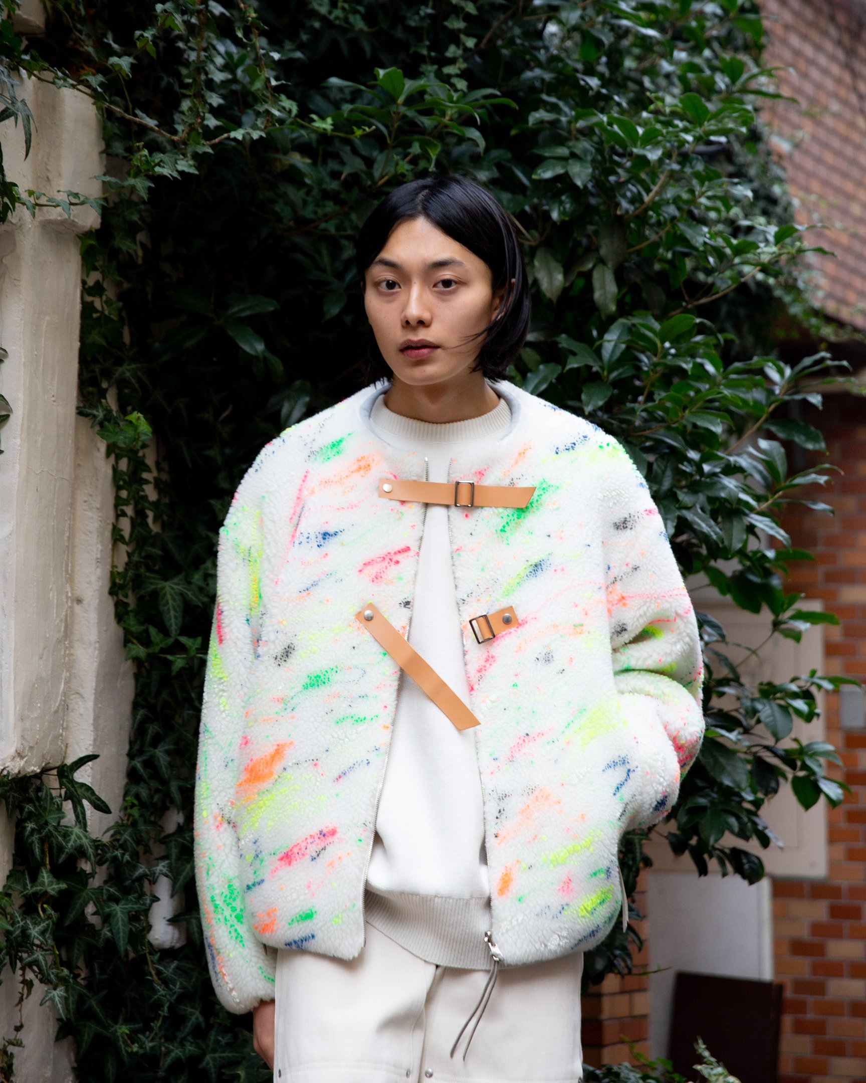最後にご紹介するのは、「タナカ(TANAKA)」のアイテム。リバーシブルになっているボアジャケットは表はポップなペイント柄、裏地はシンプルなデザインになっています。ボア側の牛革のデタッチャベルトのおかげで、カジュアルな雰囲気が引き締まった印象に。オーバサイズシルエットなので、ユニセックスで着用することができます。ホワイトカラーのデニムやニットに合わせて、ジャケットを主役にしたスタイリングはいかが?