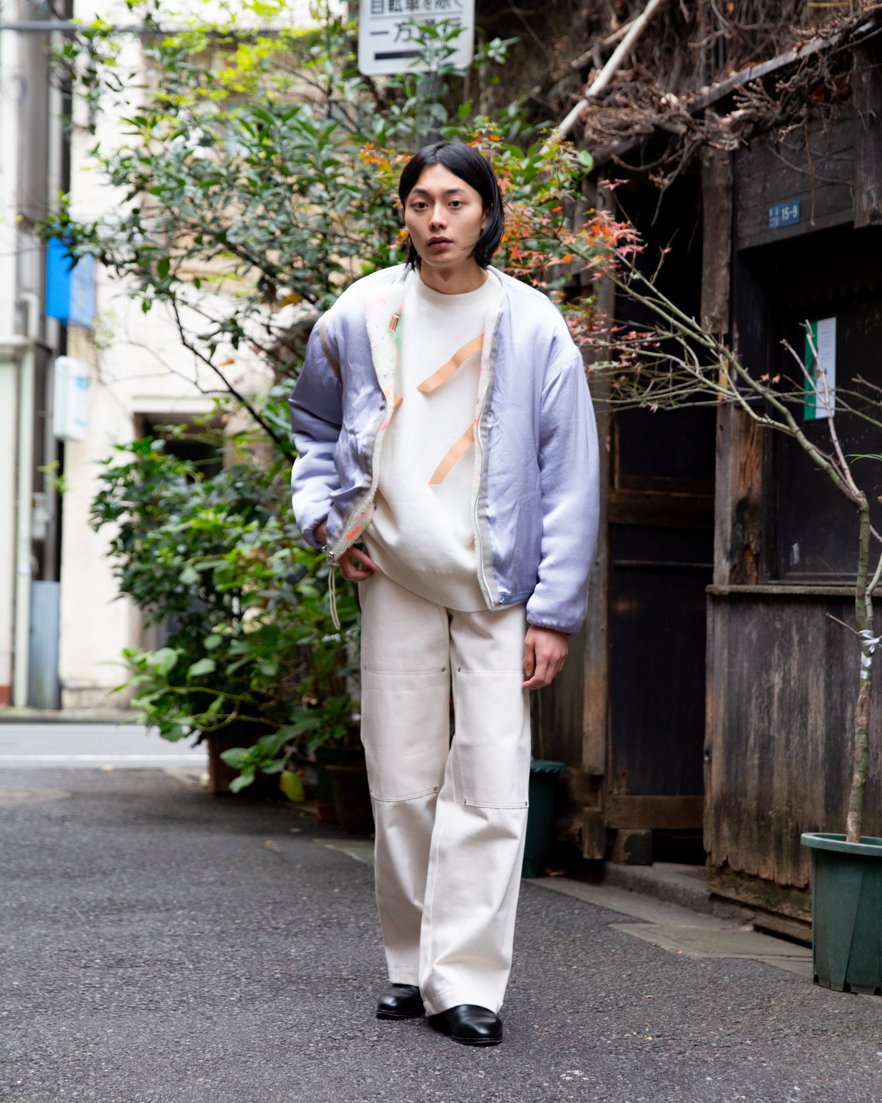 「ヨシオクボ(yoshiokubo)」の凧上げから着想を得た今シーズンのコレクションから、ボア素材と織り生地の切り替えブルゾンをご紹介。スポーツカイト(凧を大空に飛ばすスポーツ)のカラーリングを元に、モダンっぽさを感じるデザインになっています。着用感は、ハリ感を残しつつもフリースの柔らかい生地感でリラックスした着心地に。同ブランドのジップテープパンツと合わせるとテックっぽいコーデになってオススメ。スカートを合わせる場合はツルッとした素材のものを選ぶと、メリハリが出ます。同じ形でブラックのシンプルなタイプもあるので併せてチェックしてみてください。