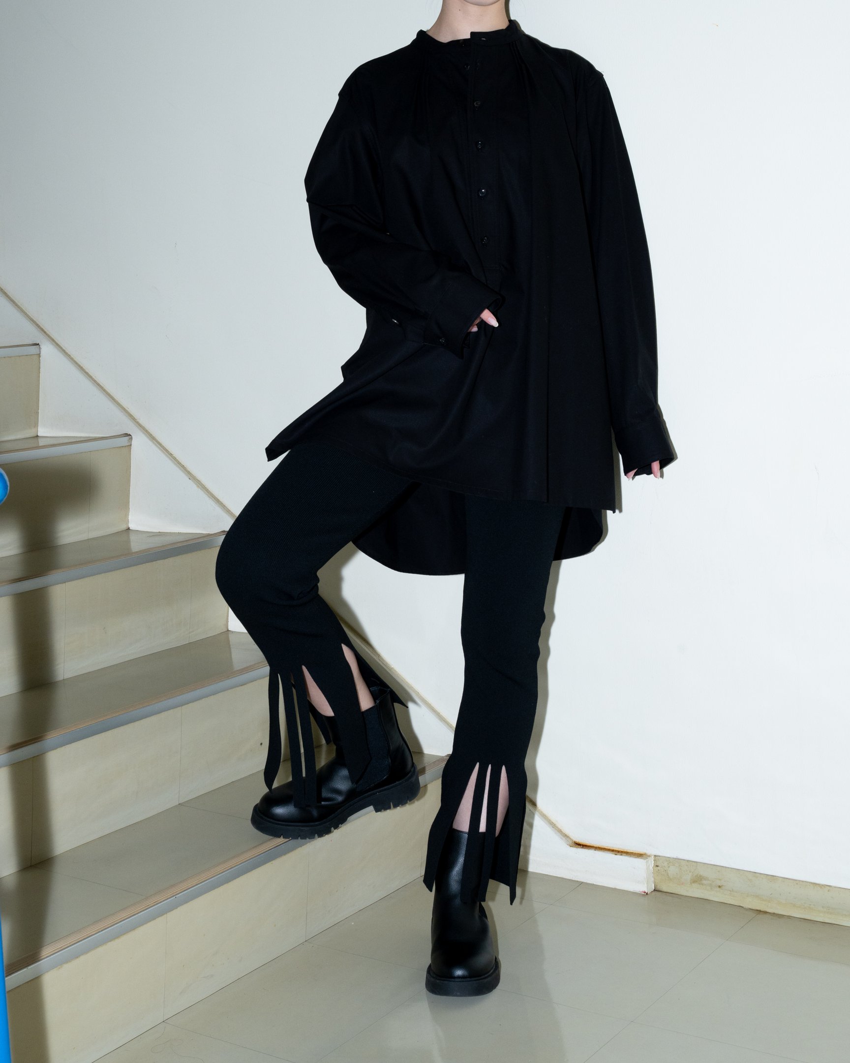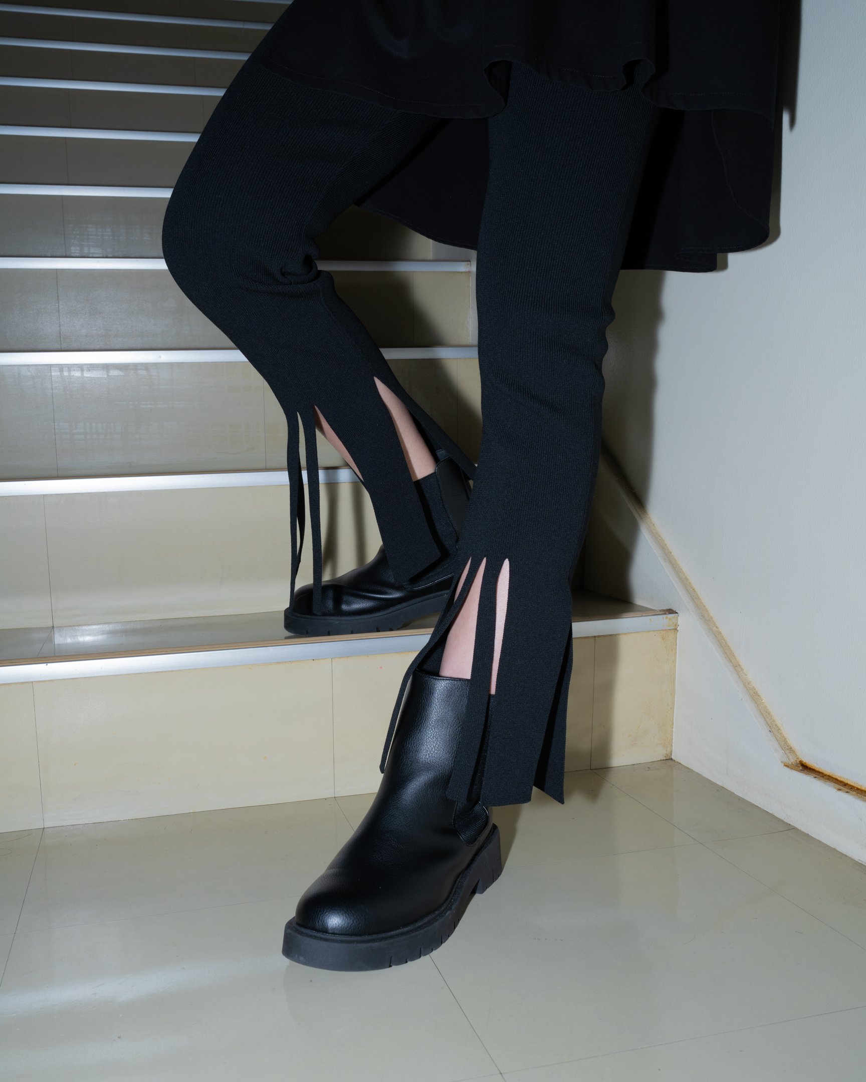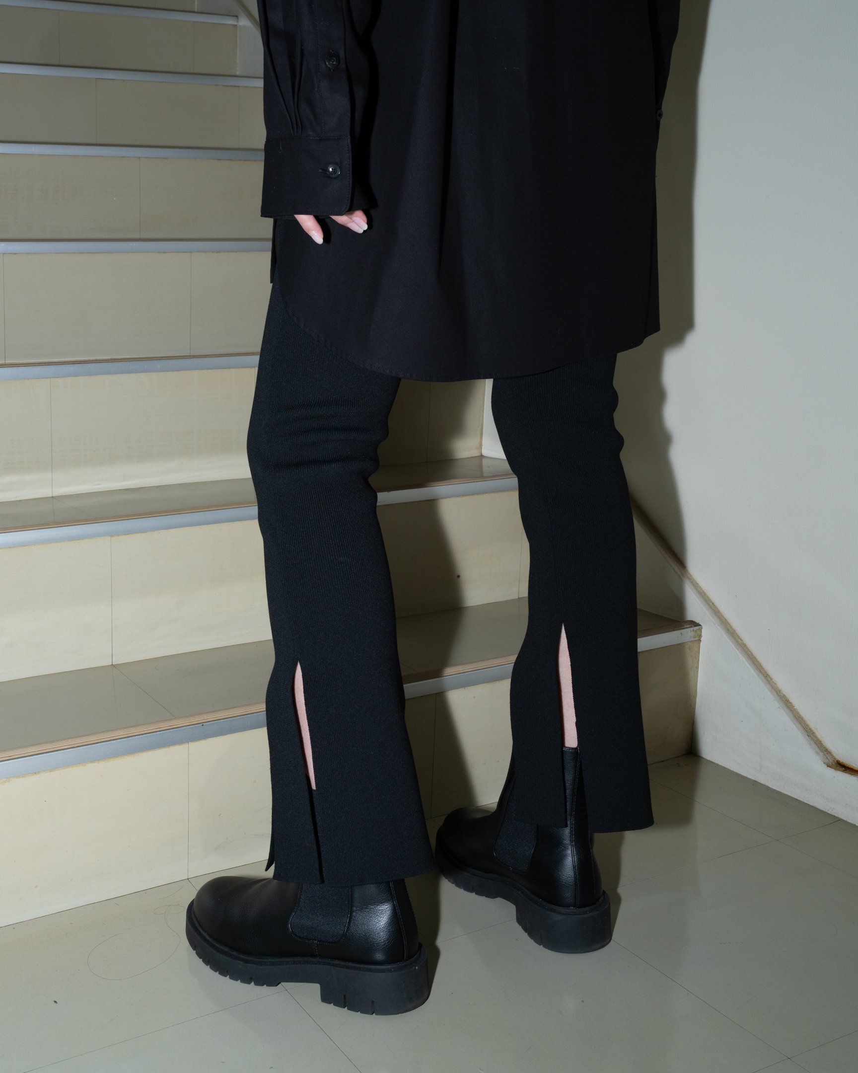 前裾に大胆に施されたスリットがモードな着こなしを実現してくれる「オダカ(ODAKHA)」のニットトラウザーズ。腿から膝下にかけて優しくフィットするシルエットでレギンスのようにも穿きこなせるので、スカートやドレスの下、ヒップが隠れるセーターやジャケットと合わせるのも◎。足元はブーツを合わせることで、スリッドのヘルシーなアクセントが際立ち、メリハリあるスタイリングが完成します。