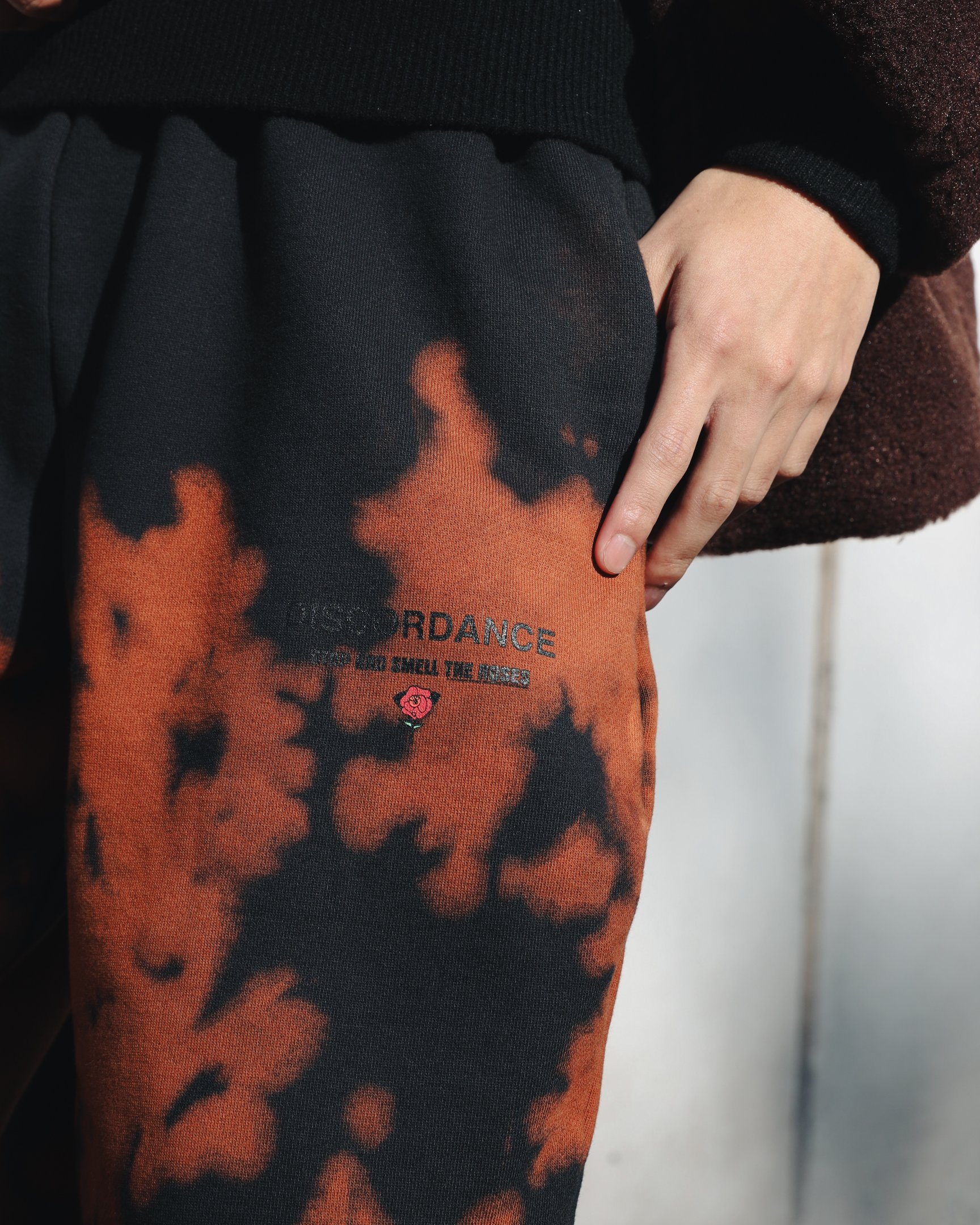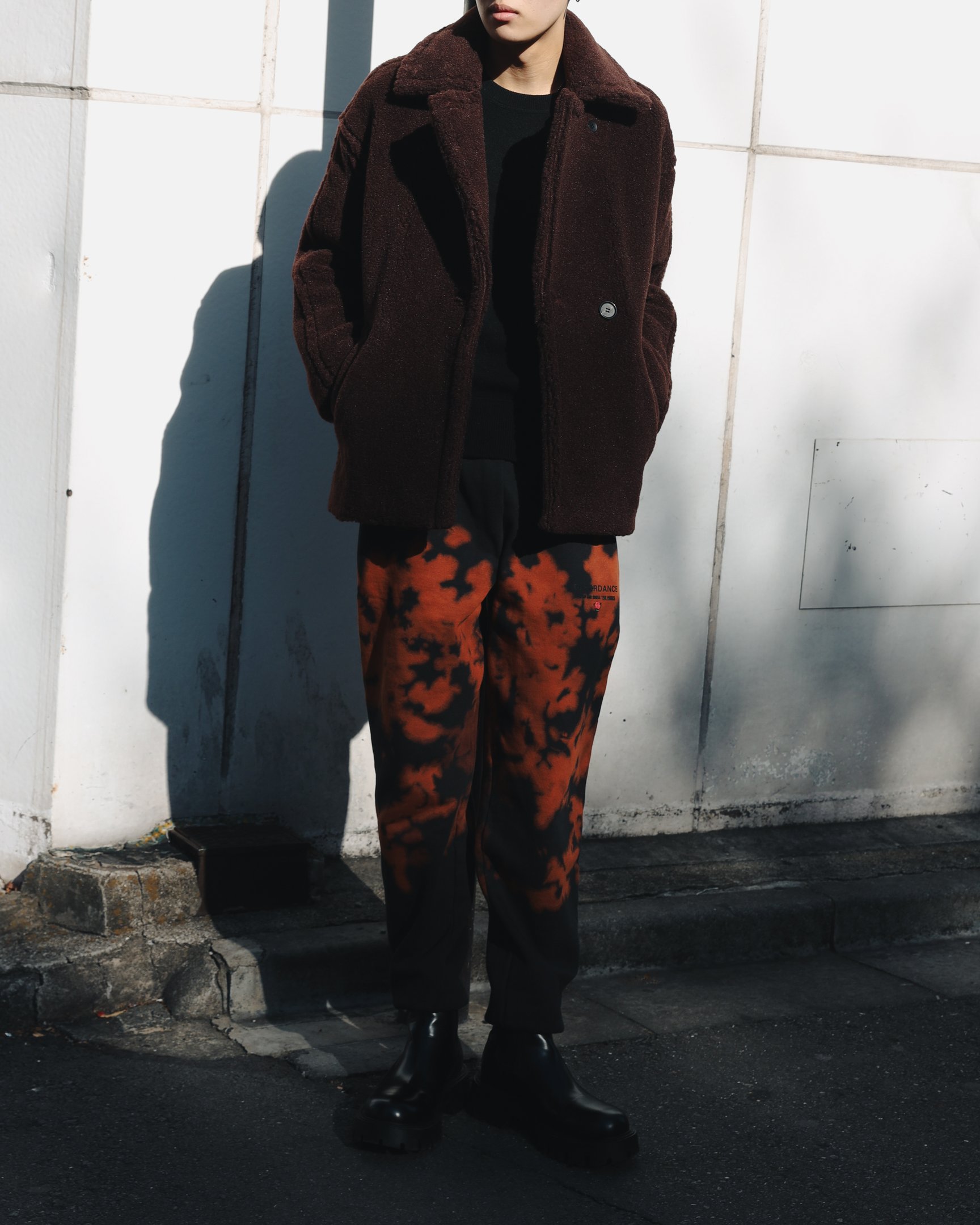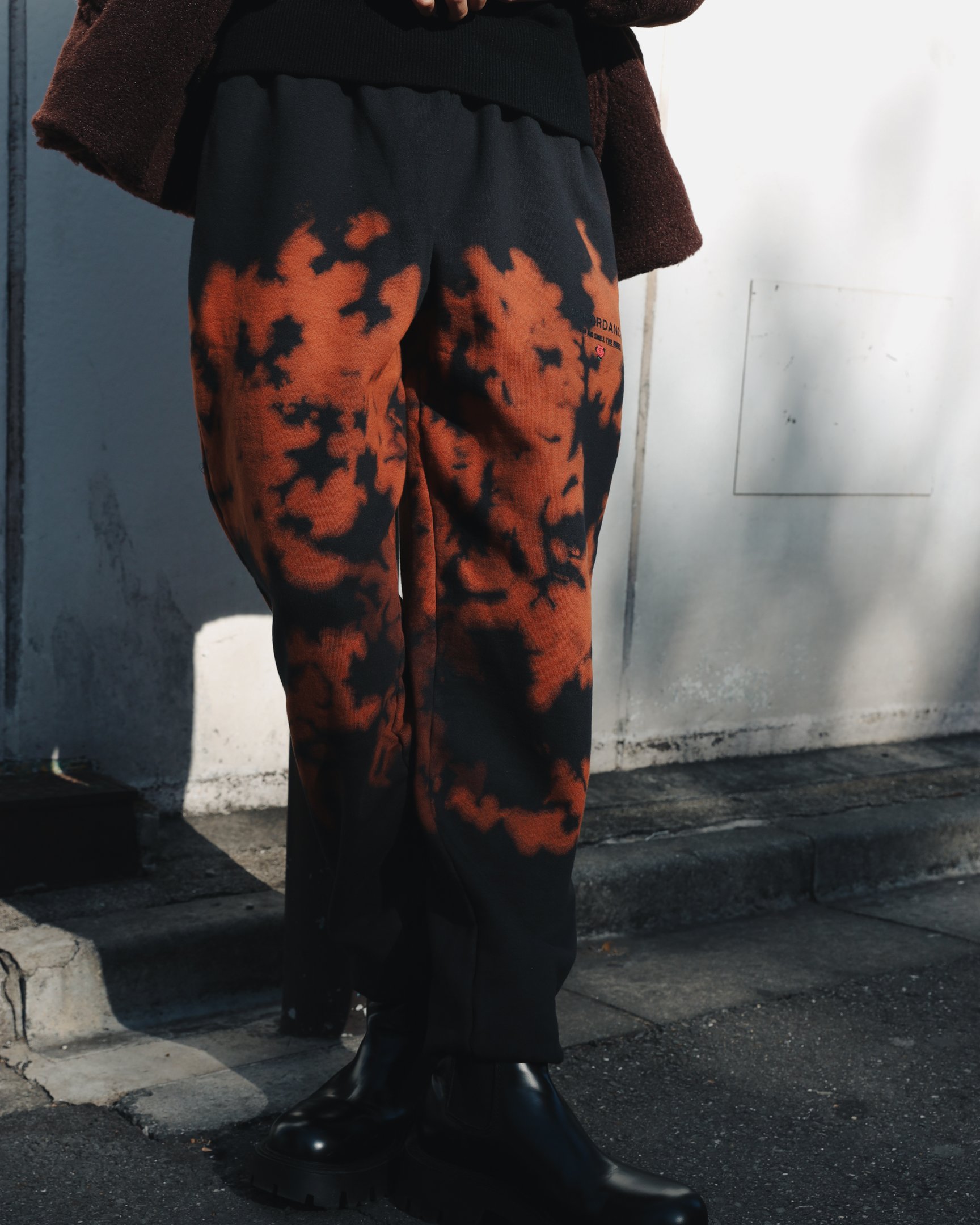 ハンドダイによるムラ感のある染めを味わえる「チルドレン オブ ザ ディスコーダンス(Children of the discordance)」のスウェットパンツは、ありがちなマルチカラーのタイダイ柄ではなく、ブラックと渋みのあるオレンジの2色使いにすることで大人なストリートムードを演出してくれる一本です。足元をすっきり見せてくれるテーパードシルエットでスマートに穿くことができ、ルーズな印象に寄りすぎないのが魅力的。ボアコートやトレンチコート、ライダースジャケットなど上品なアウターと合わせたメリハリあるスタイリングが◎。
