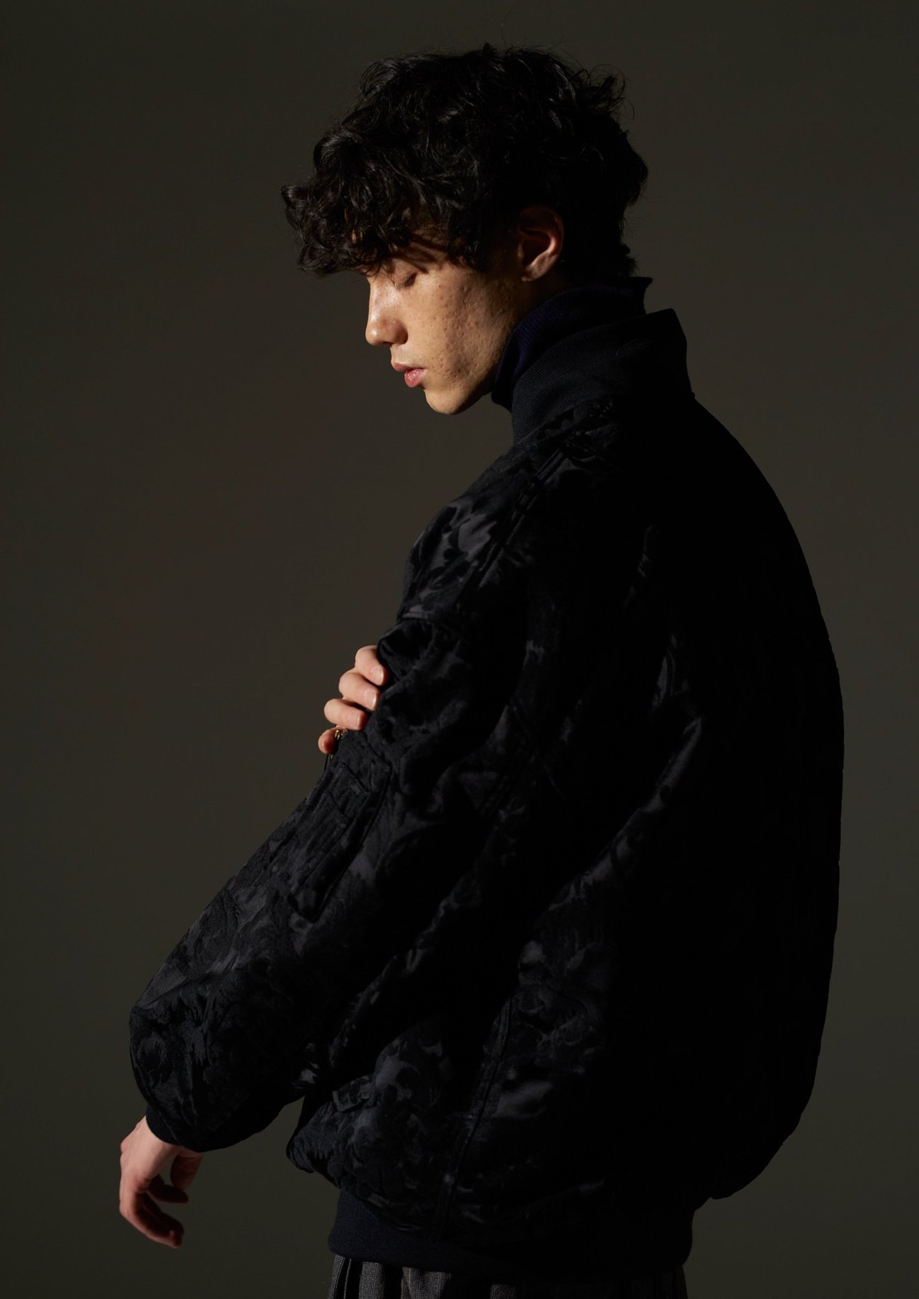 繊細で気品あるフラワージャカードを全面に施した、「アンスクリア(INSCRIRE)」の凛としたボンバージャケット。リバーシブル仕様の裏面はネックタグをワンポイントにしたワントーンのナイロンで構築し、ミニマムなルックもお手の物。すっきりとしたネックラインで、タートルニットとの合わせもハンサムに決まります。