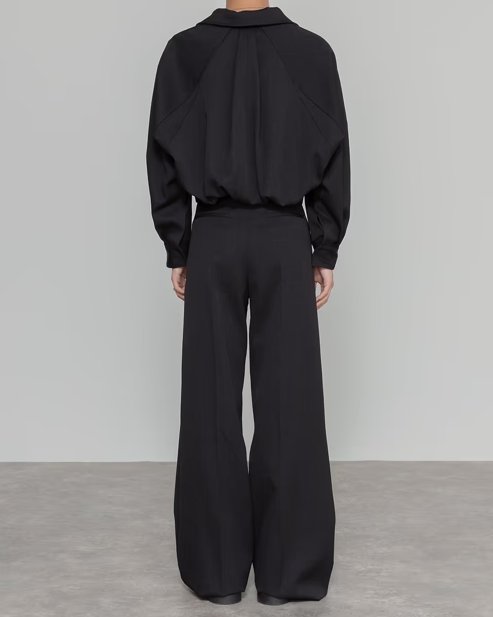 短めの着丈と、ボリューミーな後ろ姿が特徴的な「カナコ サカイ(KANAKO SAKAI)」のボンバージャケット。品のある艶感とブラックの深みを味わえる、高密度に織り上げたギャバジン生地の風合いを活かしたエレガントなアウターです。ミリタリーに寄りすぎない、モダンで洗練されたネックラインに心惹かれます。