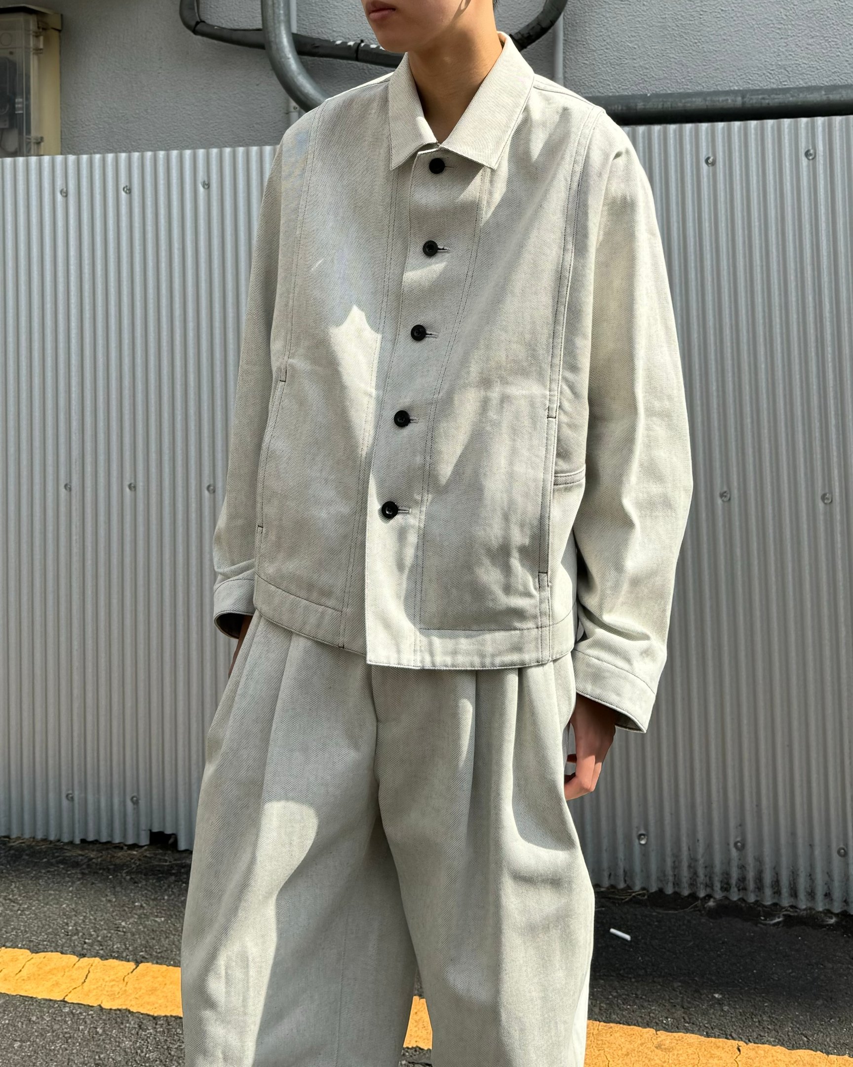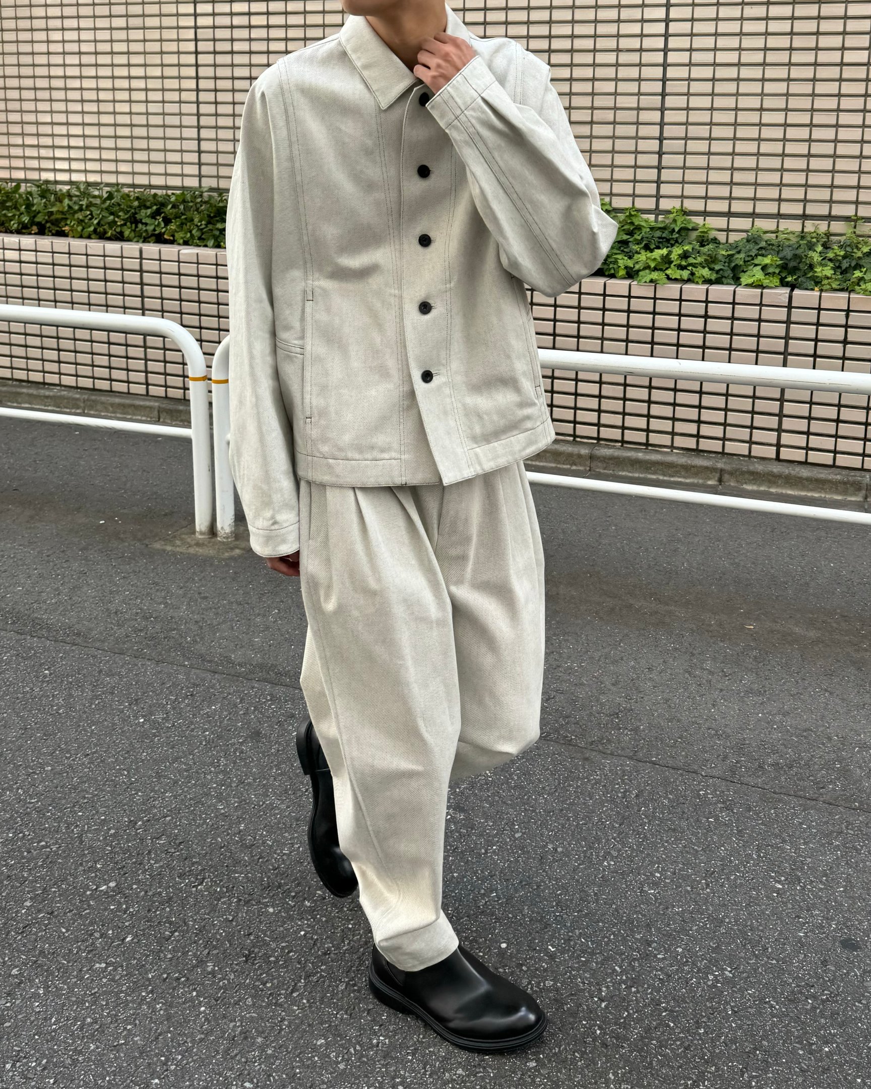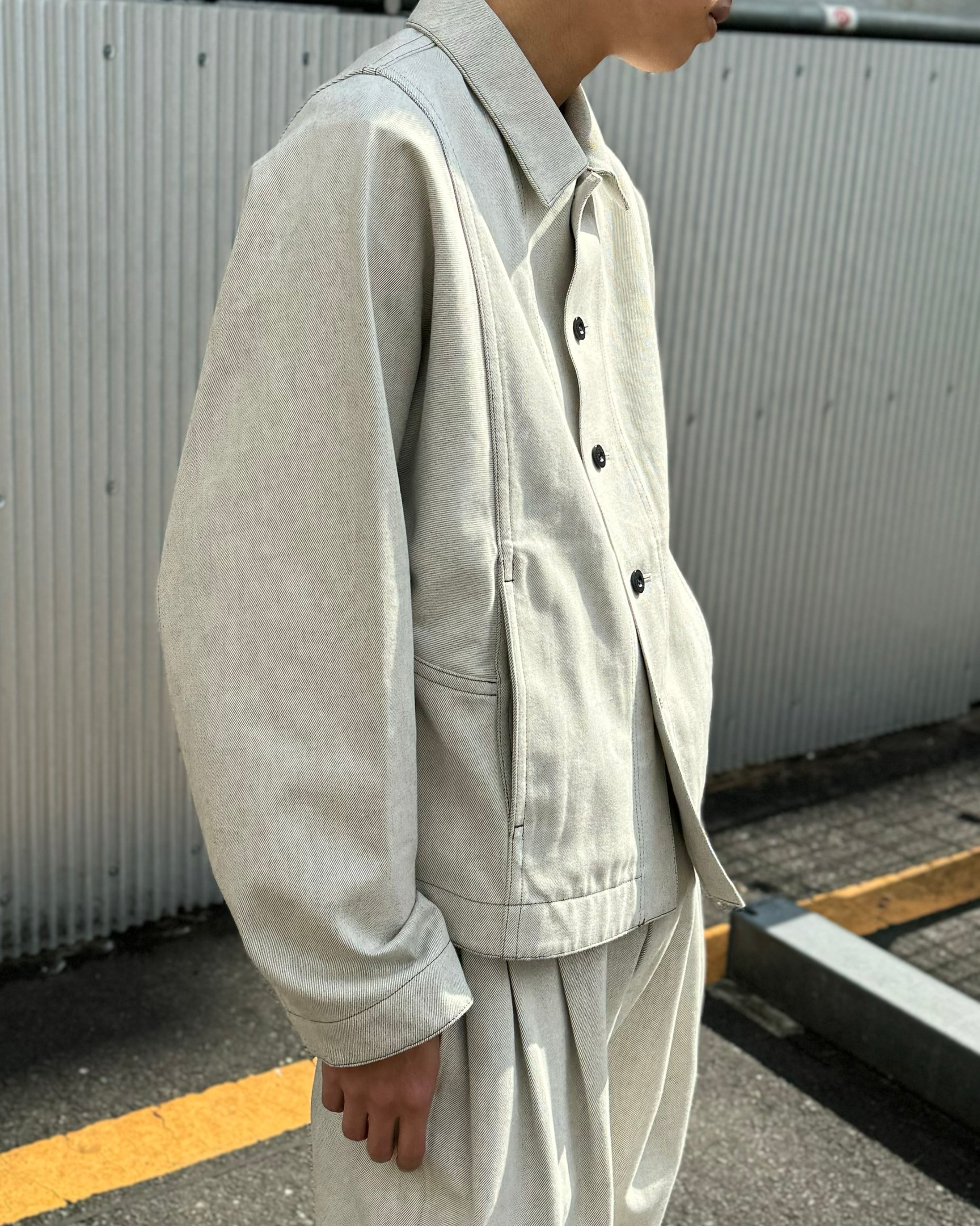 生地の重なりを省いた、「イレニサ(IRENISA)」のシンプルなホワイトデニムブルゾン。着ぶくれしない一重仕立てのデニムジャケットは、オーバーサイズコートの中に仕込んでもスマートに着こなせる軽やかさが魅力的。生成りと黒の糸で織った岡山産の生地が奥行きを醸す、大人顔のデニムジャケットです。
