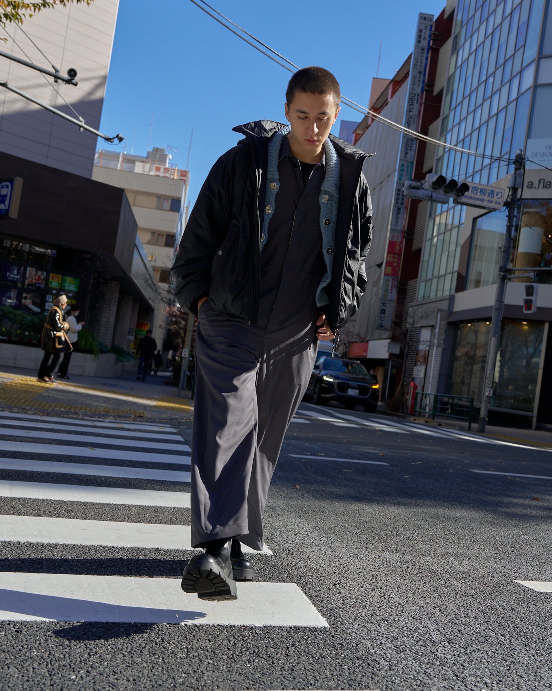 今季注目のスクールライクなスタイリングを叶えてくれる「オーバーコート(OVERCOAT)」のダッフルコートは、クラシカルなデザインを踏襲しながら、ブランドらしい独創的な素材使いとパターンワークで差別化した一着。ネイビーやキャメルなどのベーシックな色味で作られることが多いダッフルコートを、ダークグリーンをベースに蛍光イエローの糸がアクセントを効かせた生地を用いて、モダンなイメージにアップデート。1800年代に狩猟や漁師の仕事着として使われていた生地と同じものという背景もあり、その防風性や防寒性は折り紙付きです。古き良きクラシックなデザインや生地を採用している一方で、現代的なアプローチに基づいたブランドらしい独自のパターンワークも光ります。一般的なダッフルコートに見られる肩回りの装飾性を排除した独自のドルマンスリーブ構造は立体的なシルエットを演出してくれ、中に厚手のトップスを着込んでも肩周りの動きを損なわない快適な着心地を実現。クラシカルな要素をベースに現代的なテイストを織り交ぜ、モダンに昇華した一着です。