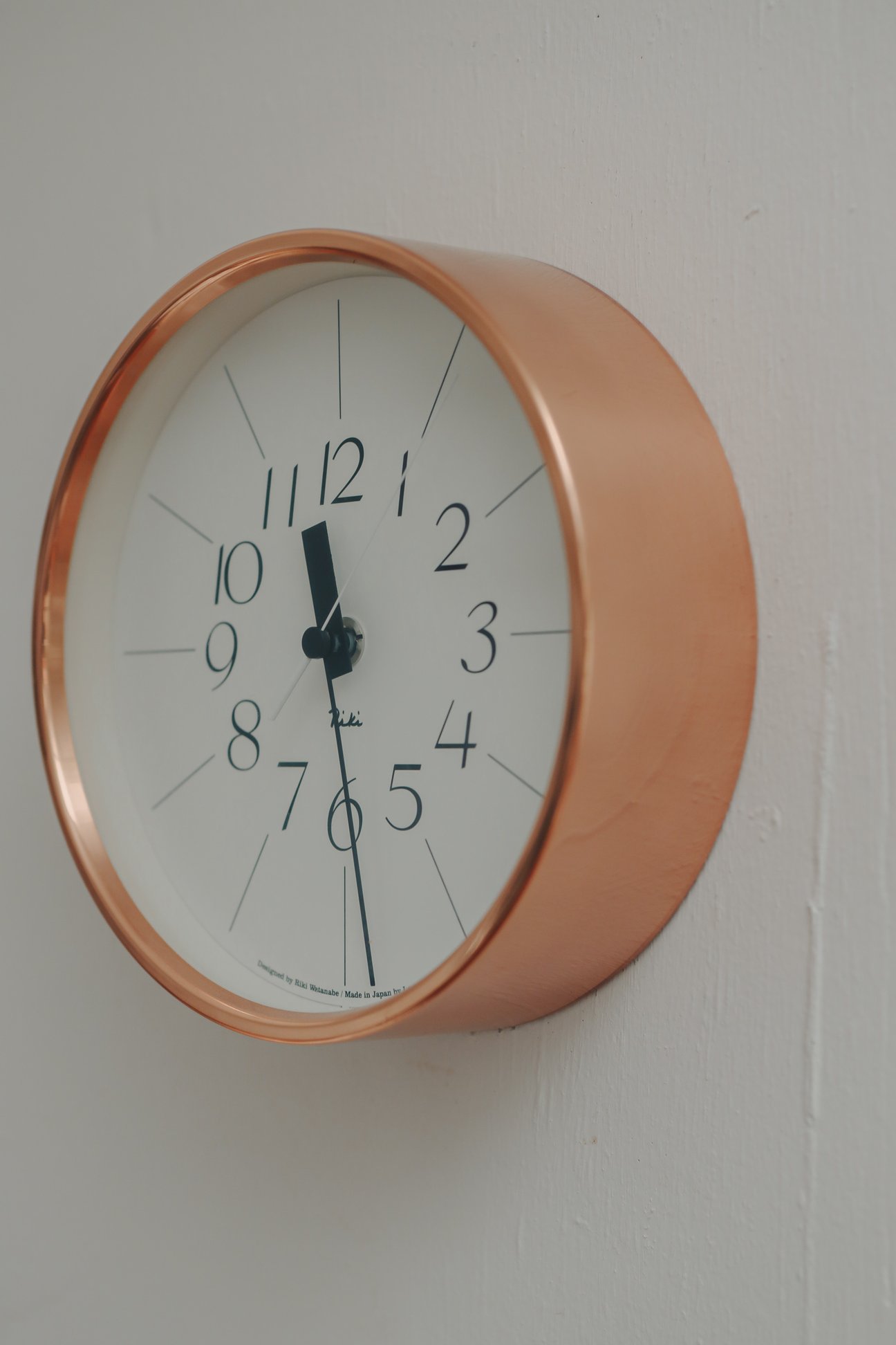 フロアランプと並べられているのは、重厚感のある銅の素材感が魅力の壁掛け時計。シンプルかつオーソドックスなデザインで人気を博すリキクロックを銅のフレームに変更した特別なアイテム。