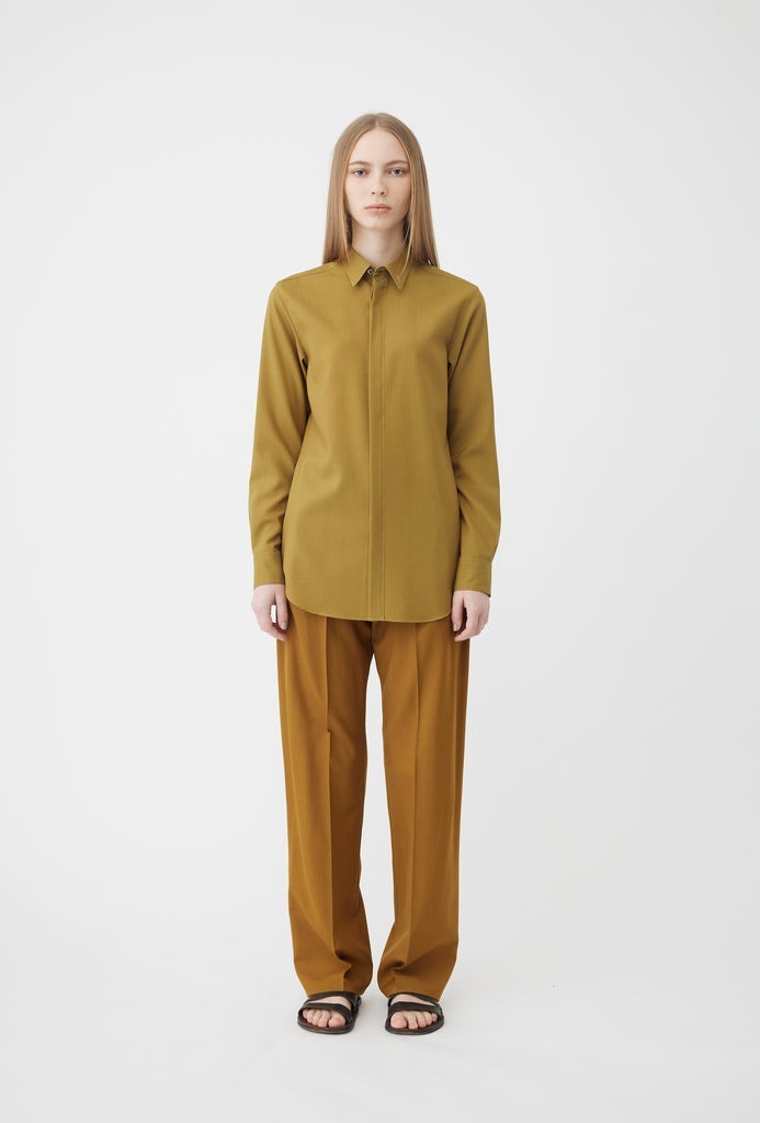 鮮やかなマスタードカラーがアクセントに、「オーバーコート」のウールシャツ