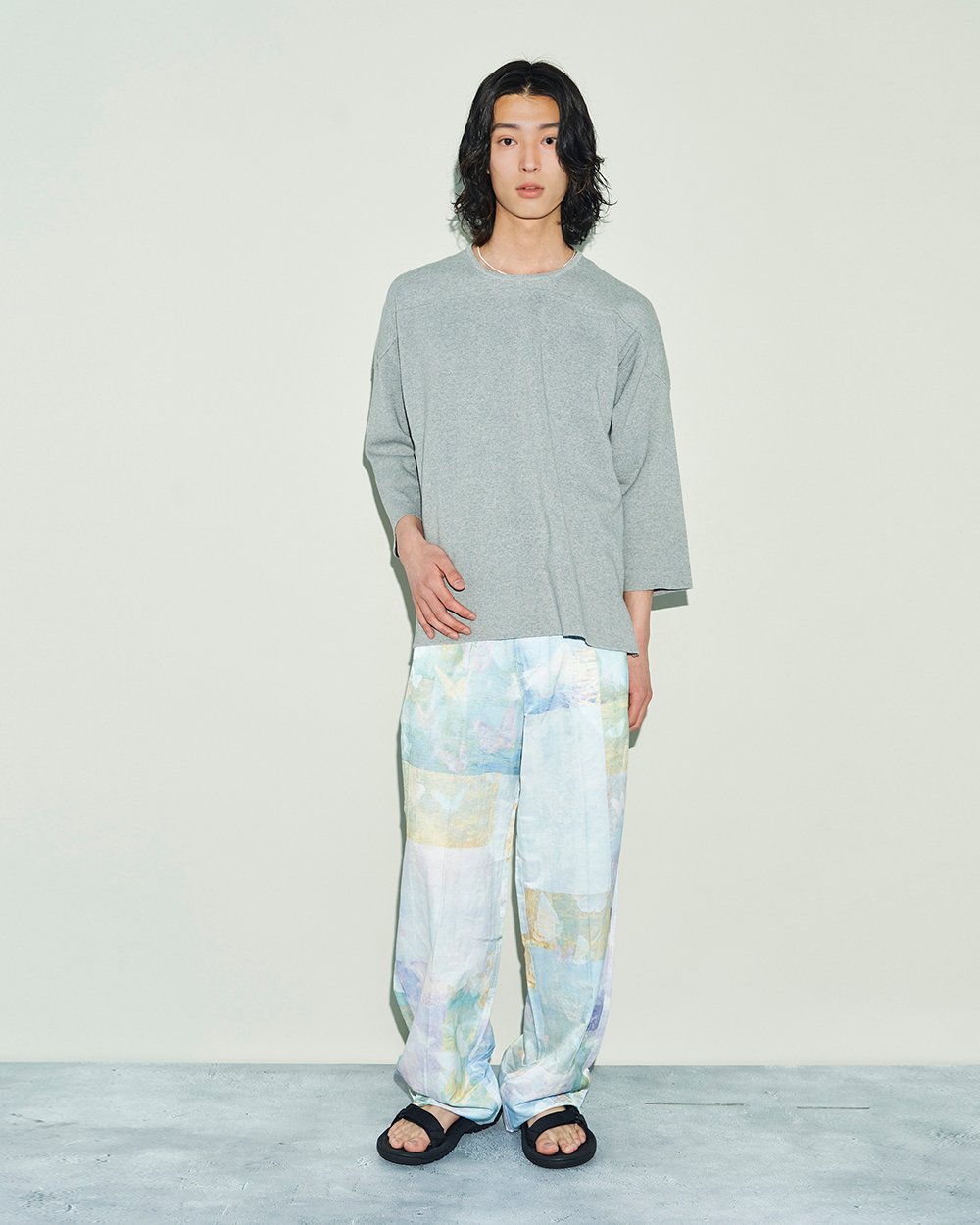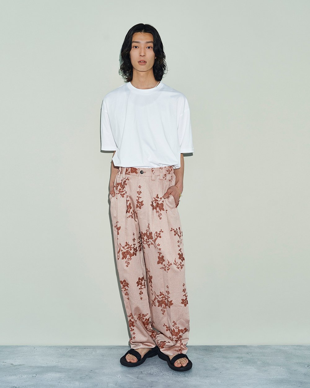 アート作品のような蝶柄のグラフィックが目を惹くトラウザーは「タナカ(TANAKA)」から。光沢感のあるコットンシルク素材が、カジュアル過ぎず上品な魅力を放つ1本です。ワイドなシルエットなので、シンプルなTシャツとルーズに着こなすのが◎。グラフィックの色味を拾ってワントーンコーデを楽しんでも良し。