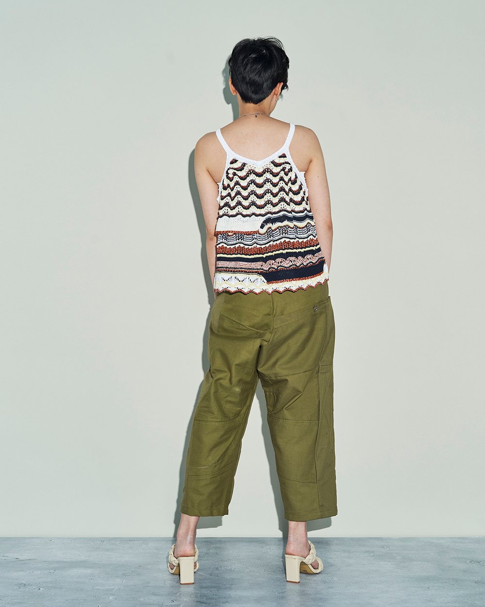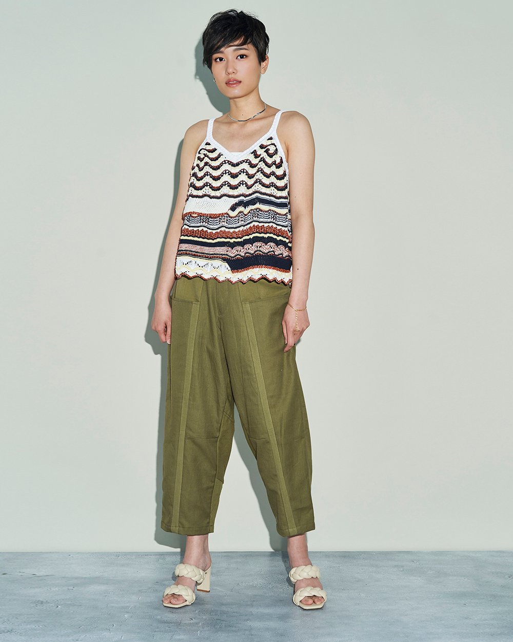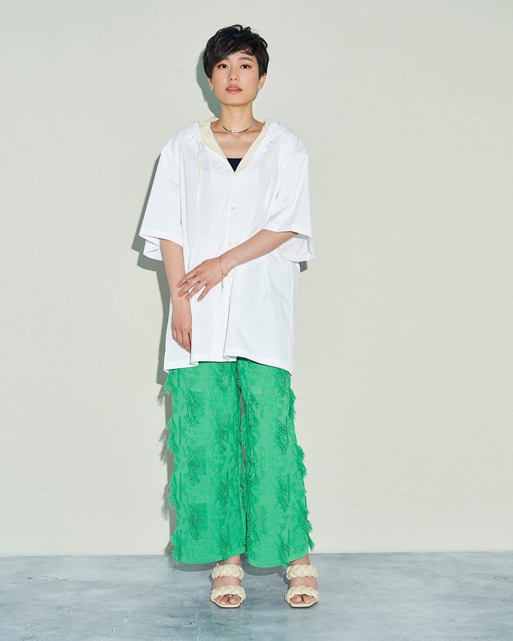 花火をイメージしたカットワークと発色の良いグリーンカラーが印象的なボトムスは「マラミュート(malamute)」から。歩くと揺れるフリンジがチャーミングです。ドライタッチで通気性の良い和紙の糸を使っているので、気温の高い日でも快適に穿くことが可能。軽やかな印象のホワイトのシャツを合わせて、重心を下に持ってくるスタイルがおすすめです。