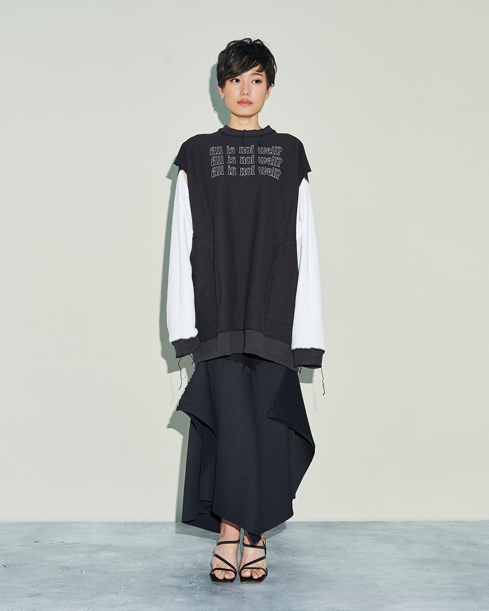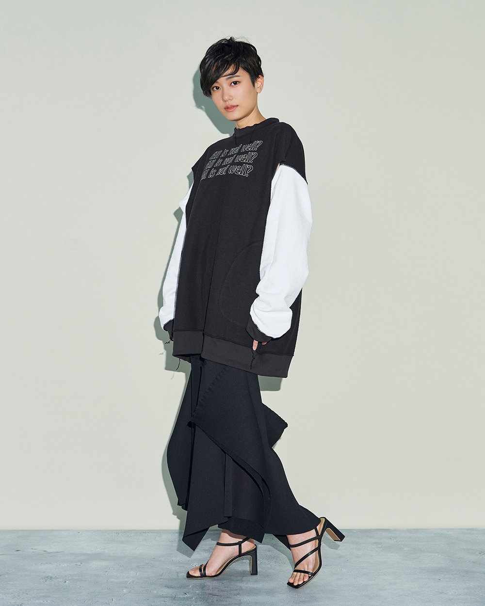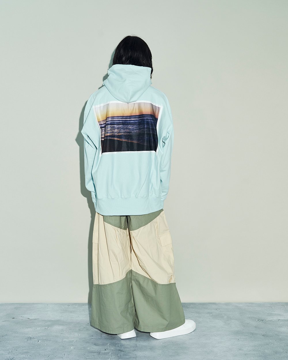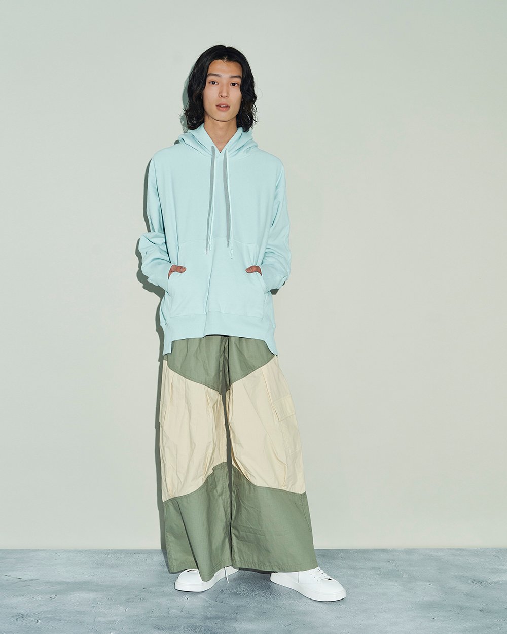 大胆な配色が目を惹く「コトハヨコザワ(kotohayokozawa)」のカーゴパンツは、1980年代にレイヴダンスで着用されていたパンツをベースにデザインしたアイテム。腰から筒のように太くダボっとしたワイドなシルエットがポイントです。明るいカラーのフーディーと合わせたY2Kの雰囲気が漂うスタイリングが今っぽい。