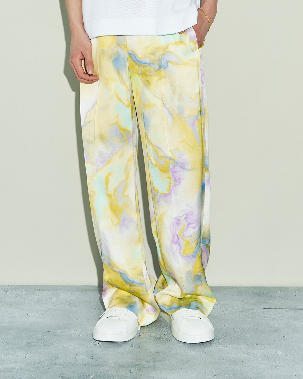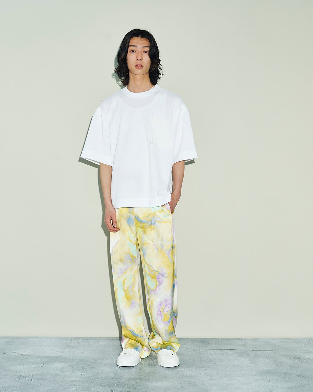 光沢感のある素材が華やかなパンツは「チノ(CINOH)」の定番アイテム。ウエストゴムで程よいヌケ感がありつつも、フロントのピンタックがカジュアルになりすぎないバランス感を演出してくれます。ストアでは品のあるエクリュと、淡い色合いのマーブル柄の2タイプを販売中。ワークシャツやゆったりとした白Tを合わせて、上品カジュアルな着こなしを楽しんでみて。