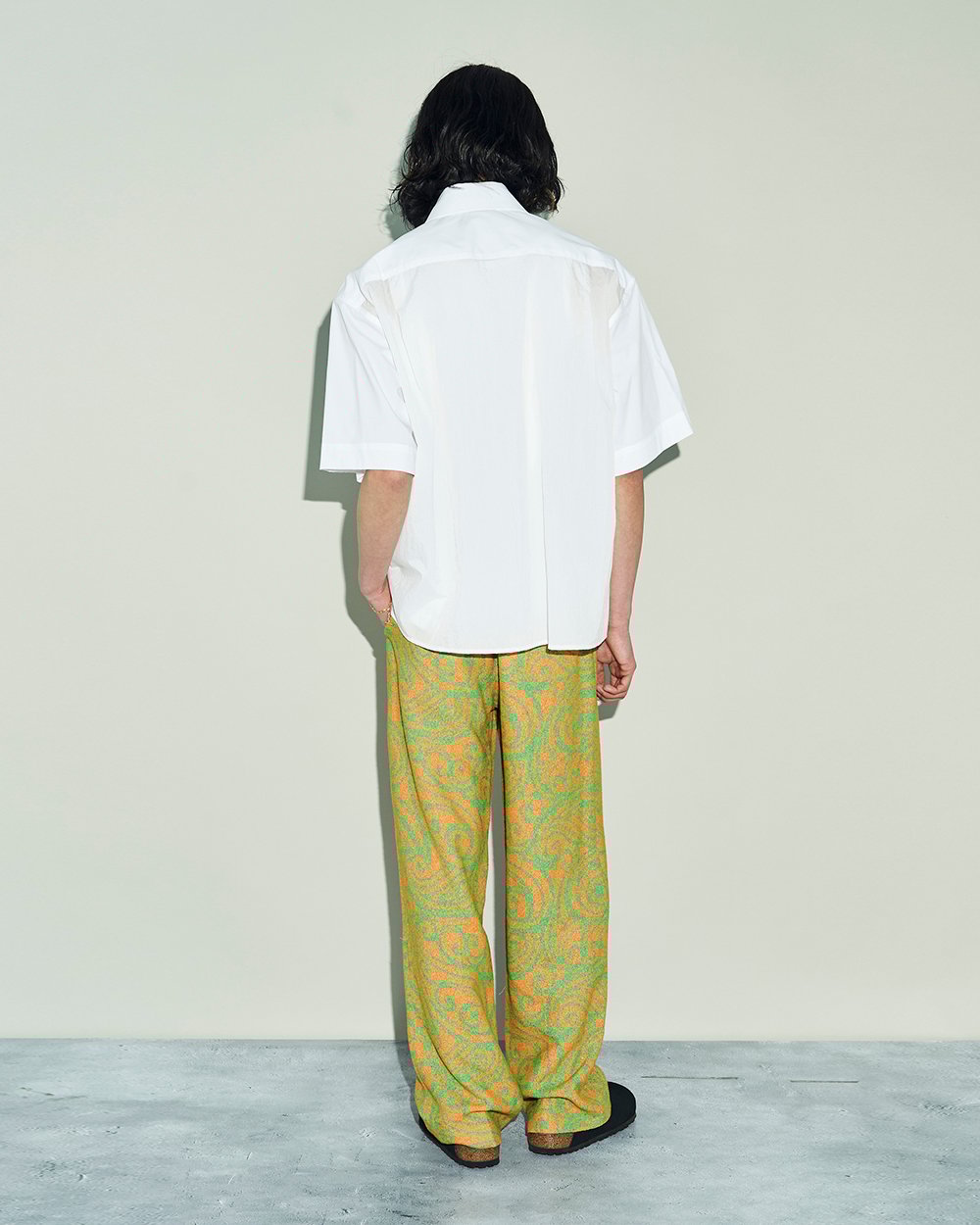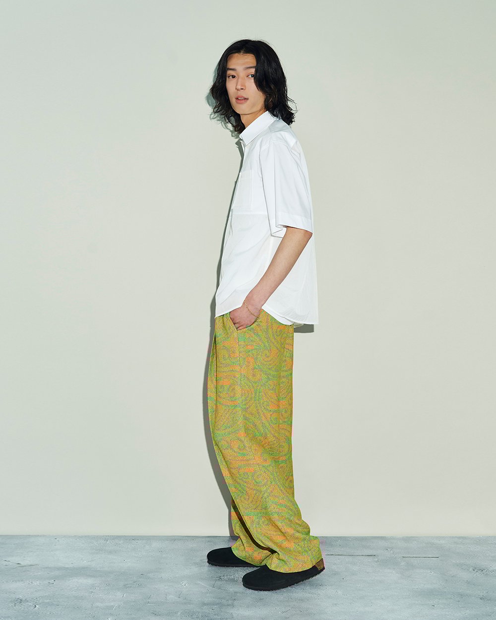 「アンスクリア(INSCRIRE)」からは、夏らしさが感じられるオレンジとグリーンのペイズリー柄パンツをご紹介。上質なビスコース素材をベースにシルクが加えられており、肌触りが良く柔らかな穿き心地です。センターラインが施されているので、シンプルな白シャツと合わせた綺麗めなルックが◎。Tシャツとビーサンを合わせたラフな休日スタイルもサマになります。