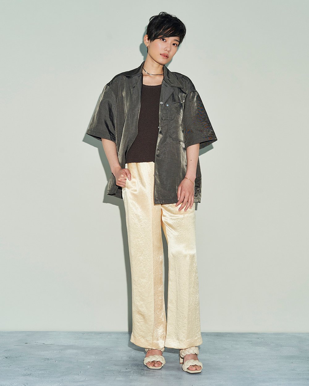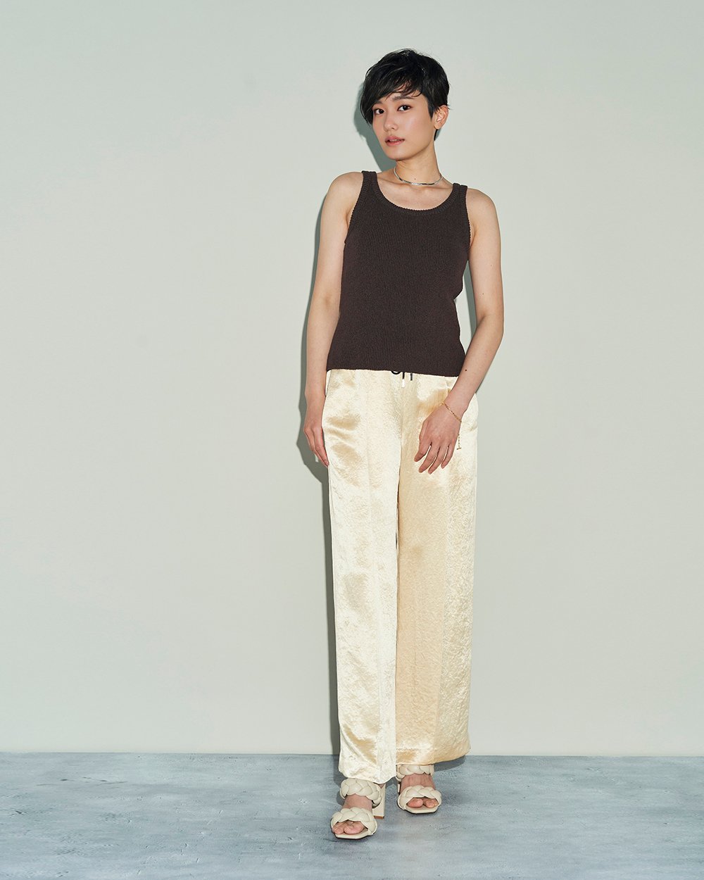 華やかだけど楽チンな「チノ」のサテンパンツ