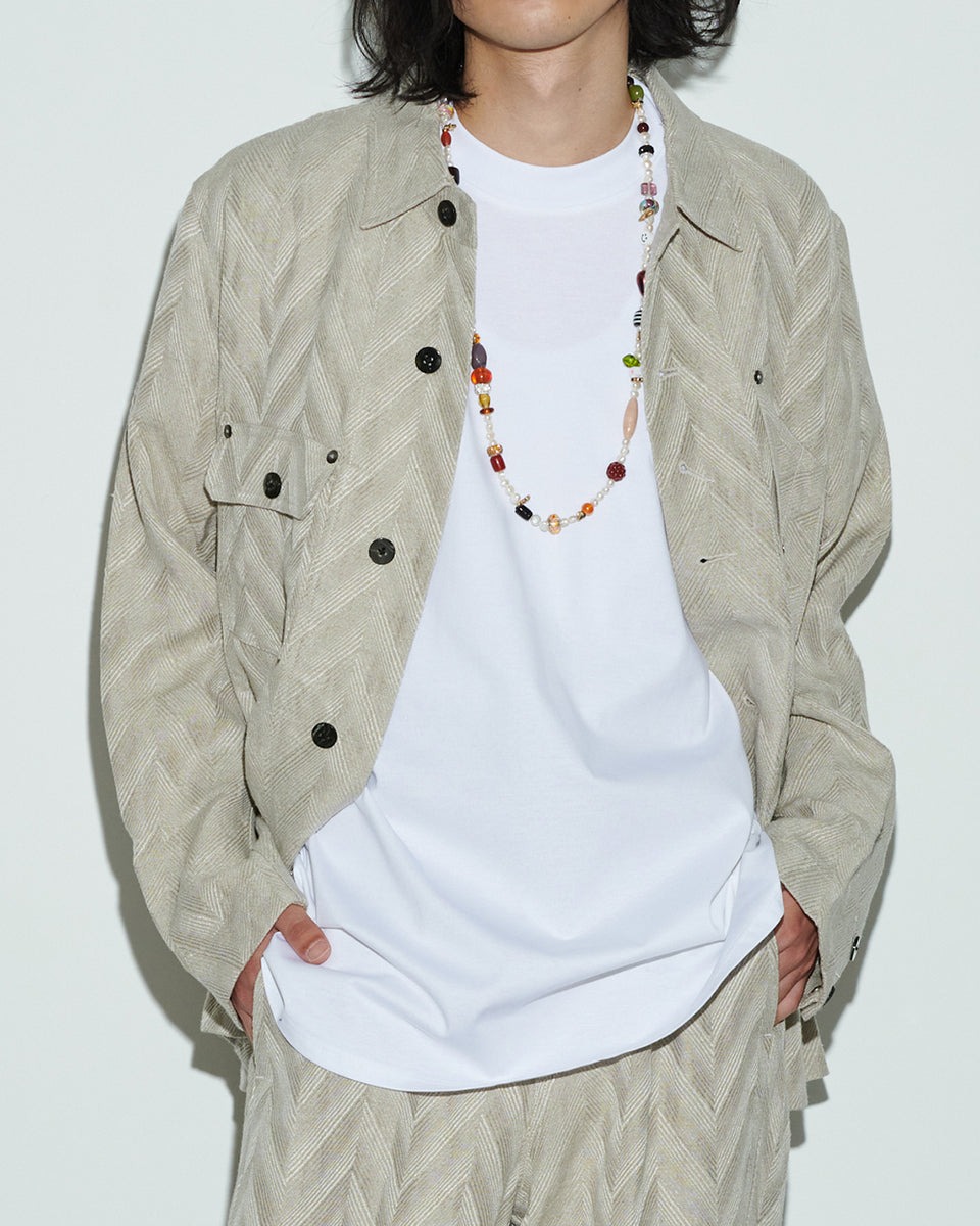 リネン素材をヘリンボーン柄で仕上げたパンツとジャケットのセットアップは、ヨウジヤマモトとユニクロで経験を積んだデザイナーによる「タナカ(TANAKA)」から。ワークジャケットのラフで機能的なデザインをベースに、ヘリンボーン柄に仕上げることで上品な表情に。通気性の良いリネン素材なので夏にさらっと着られるセットアップです。インナーにはシンプルな白Tやタンクトップを合わせるのが◎。