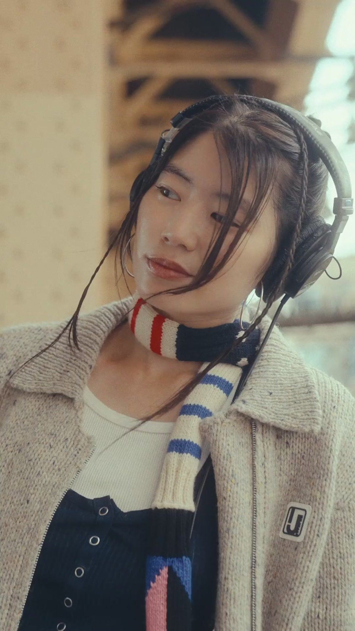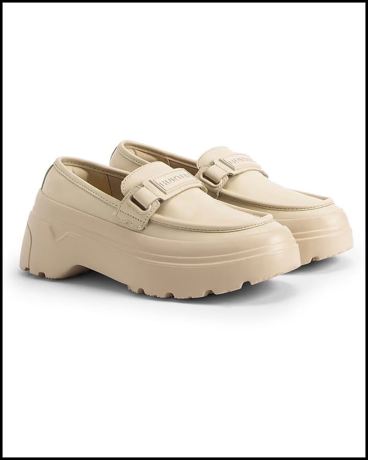 春の到来を予感させる、淡いベージュを基調にしたスタイリング。ヘッドホンやカラフルなスカーフなどパーソナリティを感じさせる小物使いでエッセンスをプラスし、足元にはアイコニックなローファーで軽やかに。チャンキーなソールのローファーは、弾むように軽快に、どこまでも運んでくれる。さりげなく存在感を放つ同色のロゴも足元のポイント。