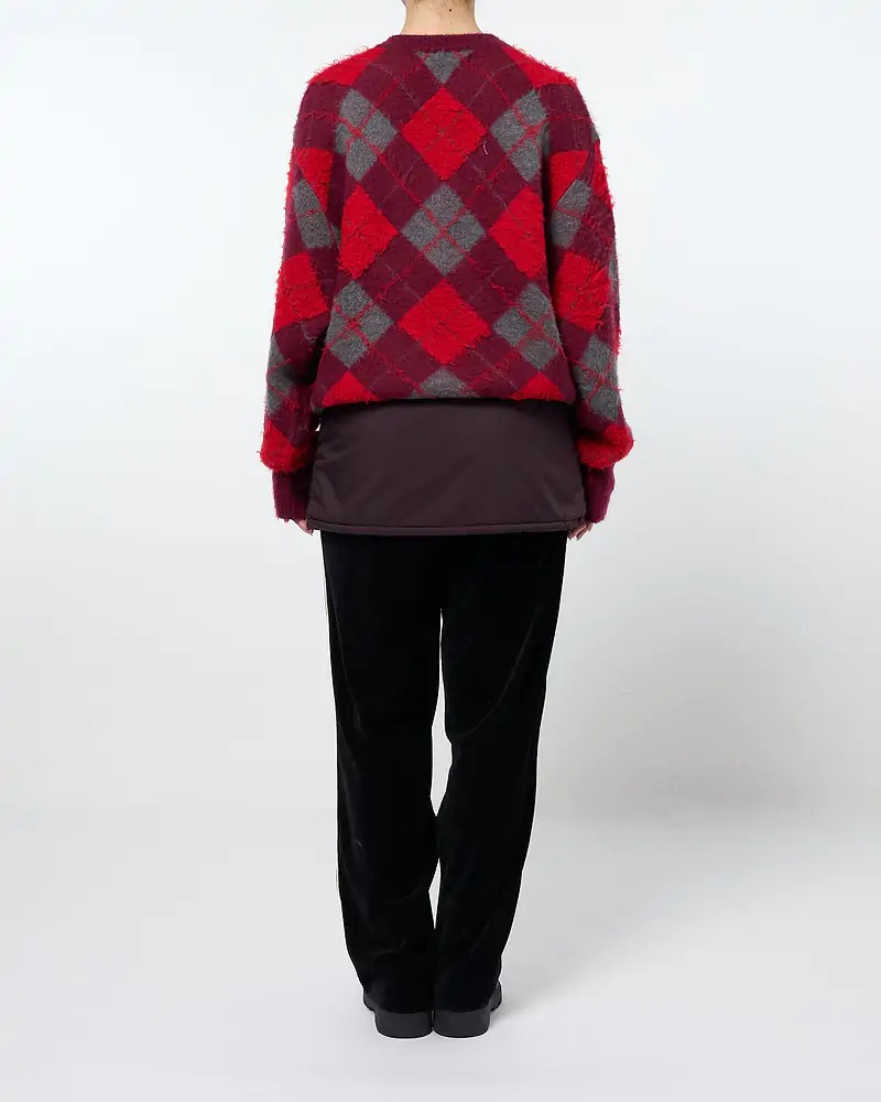 今年の秋冬もボトムスのレイヤードスタイルには注目したいところ。腰に巻きつけてボトムスとのレイヤードを楽しめるミニスカートを主役に、秋冬のムードにマッチするバーガンディをメインカラーに据えたスタイリング。しっとりしたベロアのトラックパンツと艶のあるナイロンのミニスカートのレイヤードで、素材感のコントラストも演出し、スタイリングのポイントとしても◎。