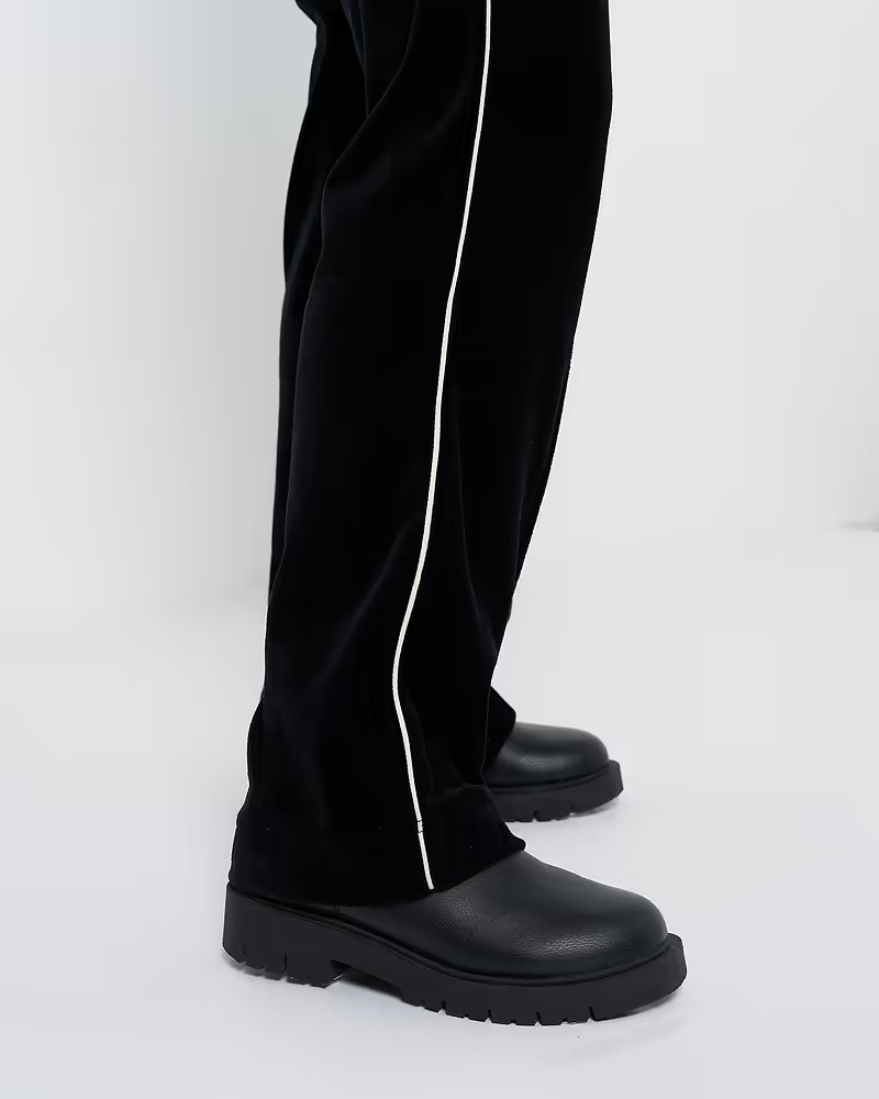 鈍い光沢感としっとりとした質感が特徴的なベロア素材を用いたトラックパンツは、ブラックのボディに映えるホワイトのサイドラインとシルエットにメリハリをプラスすることができる足元のジップがポイント。トップスやシューズを変えるだけで、カジュアルにもエレガントにも振れる着こなしの幅の広さと、モダンなストレートシルエットが魅力的な一本です。