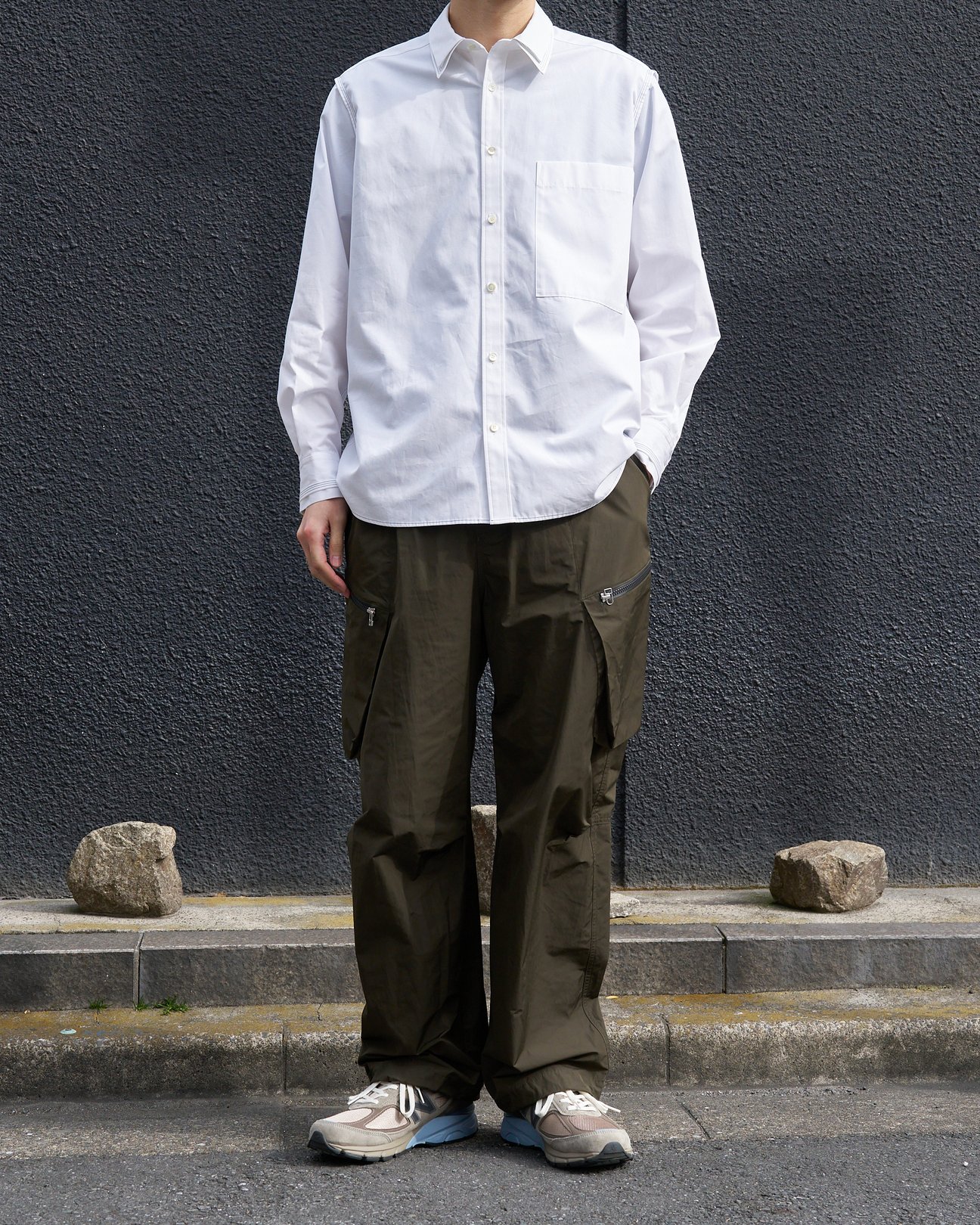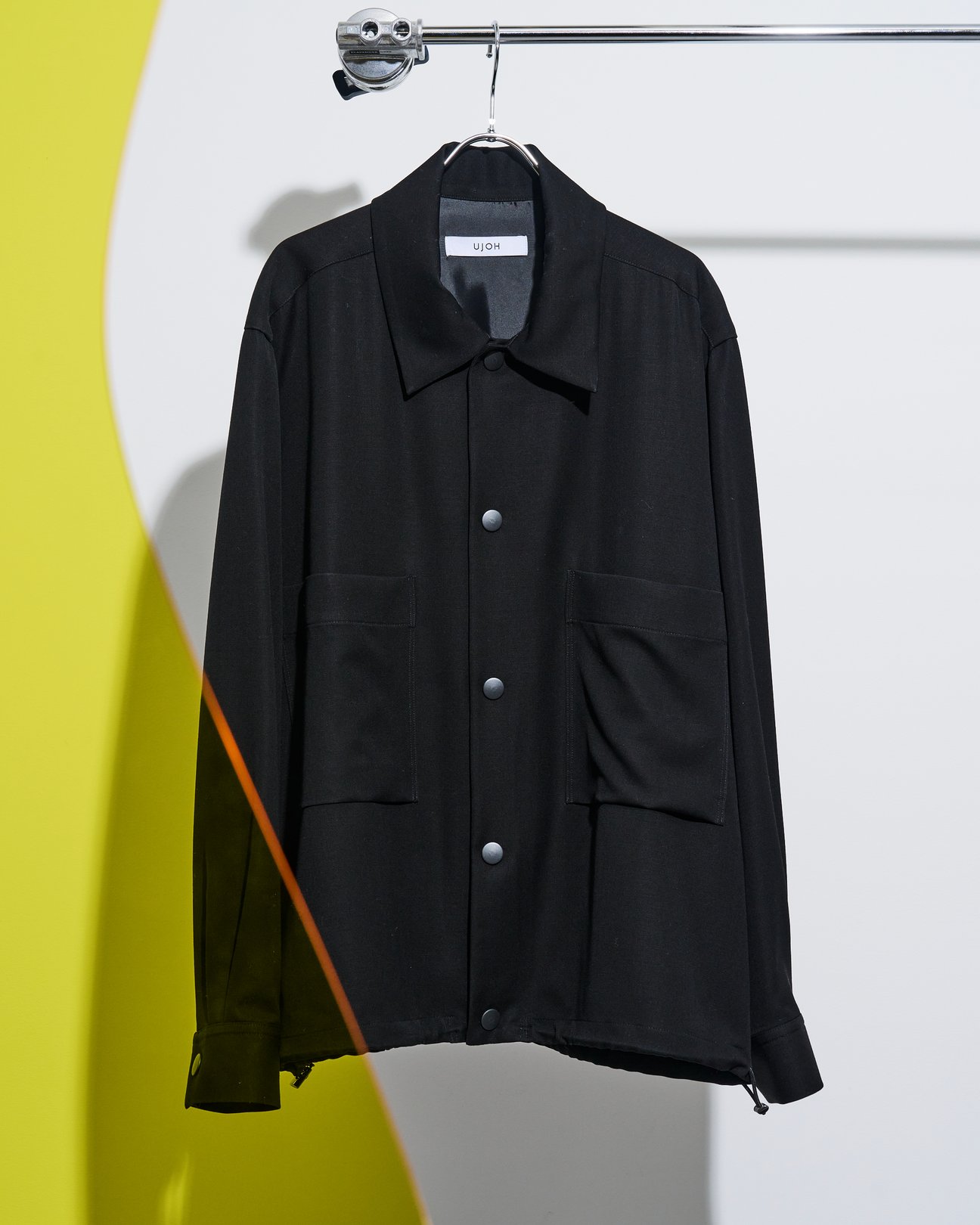 シルエットを調整できる裾のドローコードや立ち襟で着用できるチンストラップなどを搭載し、コーチジャケット感覚で着こなせるシャツは「ウジョー」から。スナップボタンまでブラックに統一されたソリッドな佇まいで、ストリートライクなスタイルからドレッシーな着こなしまで幅広くマッチします。