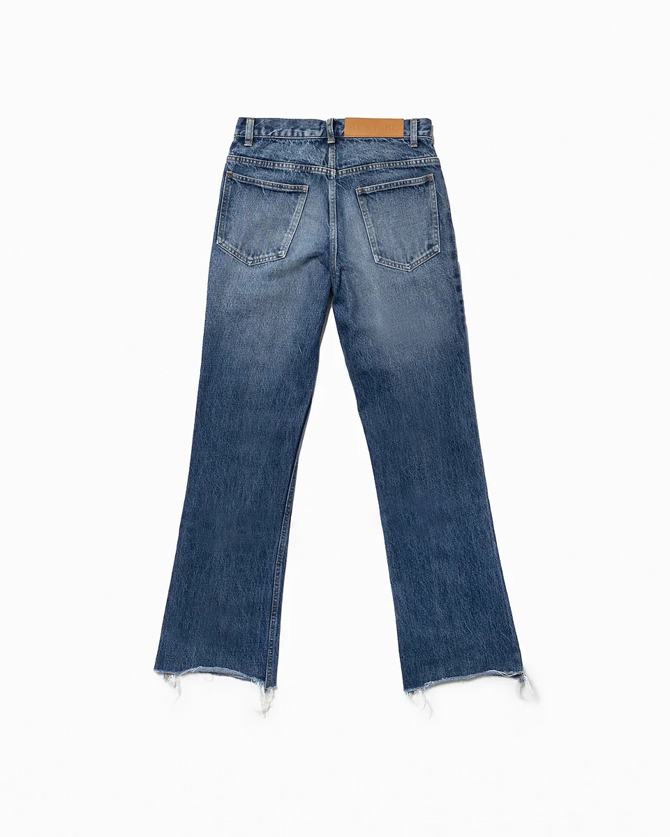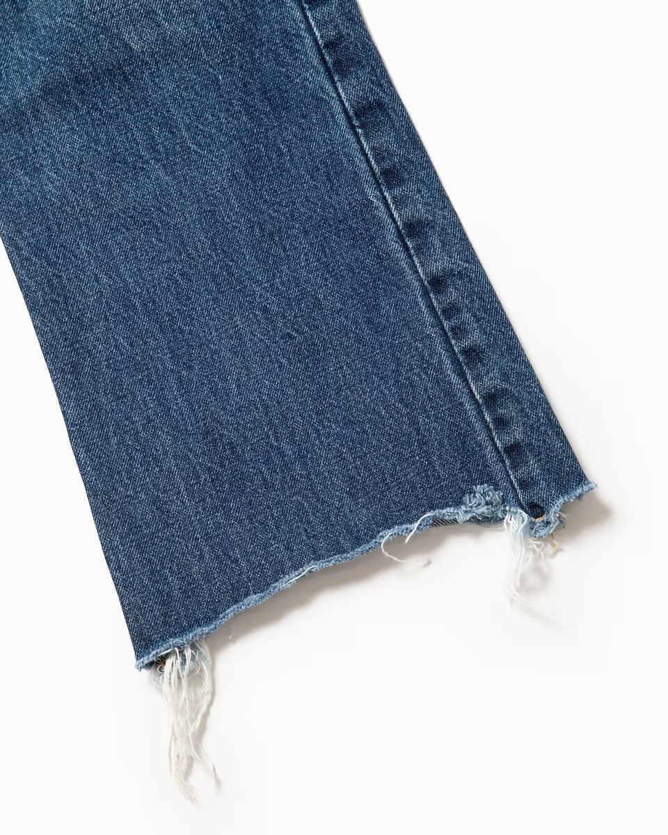 程よい色落ちが特徴的な14オンスのデニム地を採用した、ランダムカットの裾が目を惹くセミフレアタイプで、女性が気になる太ももやO脚、ヒップなどの悩みを隠せる計算されたパターンで構成。ハイウエストによるスタイルアップ効果にも期待大な、シーズンごとにマイナーチェンジを繰り返す見逃せない理想的なアイテムです。
