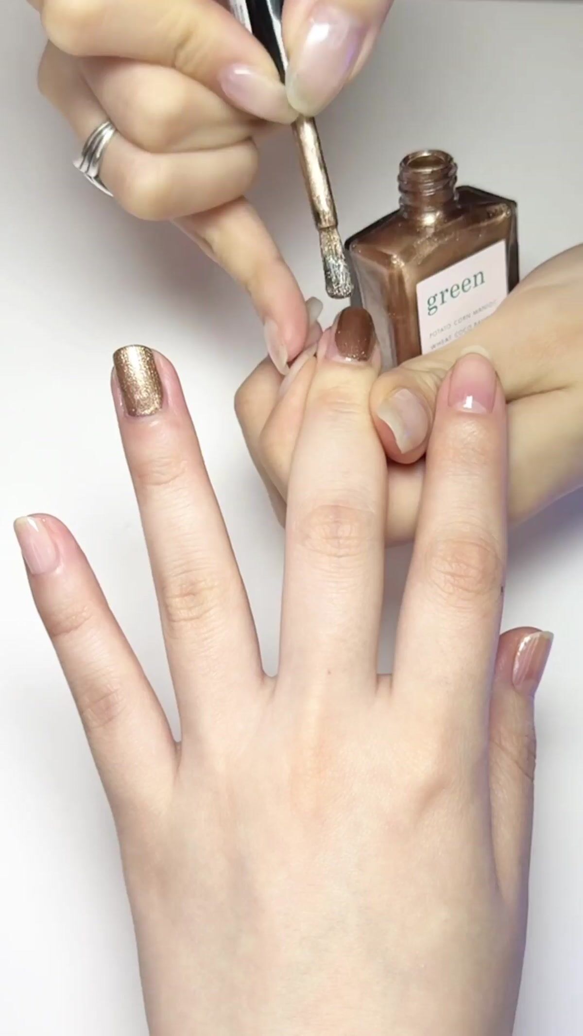 マットとツヤを織り交ぜ鉱物をモチーフにしたフレンチネイル。ウィメンズは全体をブロンズカラー→マットコートの順で仕上げた後、再度爪先にブロンズカラーを重ねることで柔らかいニュアンスをプラス。メンズは爪全体にブラックカラーの上にマットコートを施し、爪先はツヤタイプのトップコートを重ねています。