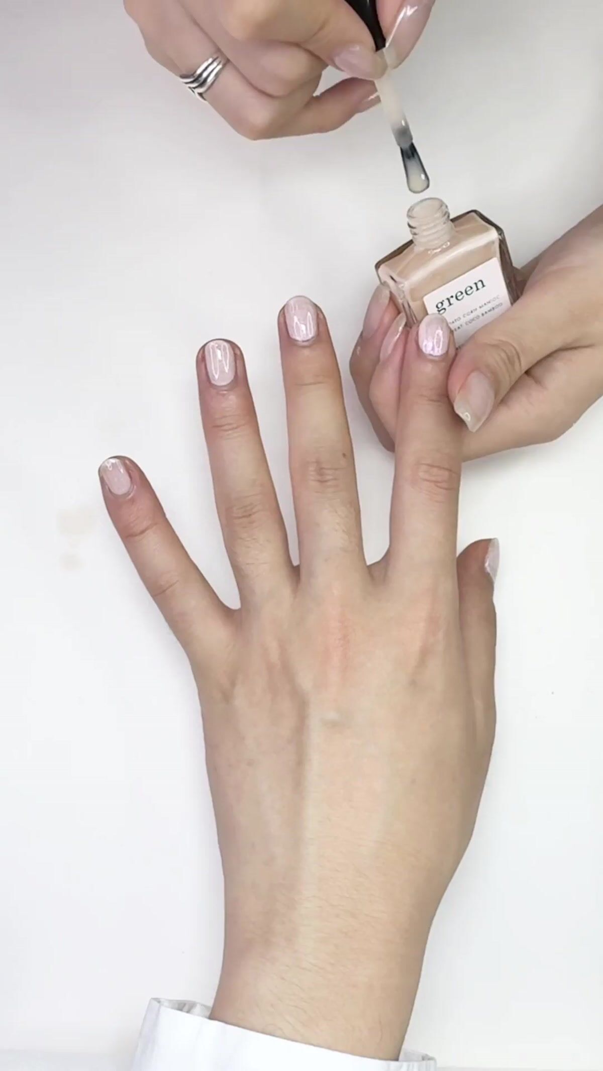 曲線的なリングに着想を得て、ウェーブを意識したネイルデザインに。ベージュをベースカラーにすることで淡いメインカラーの発色がアップするそう。またメンズネイルの場合、肌色の面積を増やすことで関節の印象を中和できるとか。