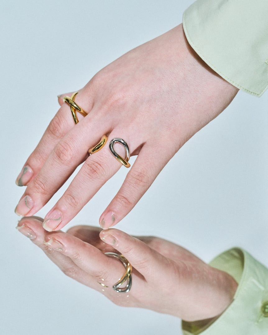 相反する要素を織り交ぜたアイコニックなデザインと値ごろ感のある価格帯で人気を博している「ソワリー(Soierie)」から、「コネクトループイヤカフリング」「モイストドロップリング」「フィーグブレスレット」をピックアップ。立体的なフォルムで程よいボリューム感のあるリングには、シンプル且つアート性のあるネイルデザインで、肌の質感を生かした華やかな手元を演出してみて。