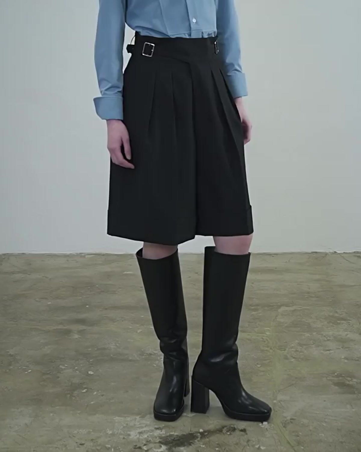 キュロットのようなワイドなシルエットがグルカショーツの最大の特徴。もも周りにゆとりがないシルエットのショーツは脚が太く見えてしまいますが、グルカショーツの裾幅は非常に広く設計することでアイコニックなシルエットを描き、ワイドな裾幅とのコントラストで脚を細く見せてくれます。またこのワイドなシルエットは見た目の美しさだけでなく、合わせる靴を選ばないという利点も叶え、ボリュームのあるスニーカーから軽やかなスリッポン、ロング丈のブーツまで、どんな靴でもバランスを取りやすく穿きこなせます。