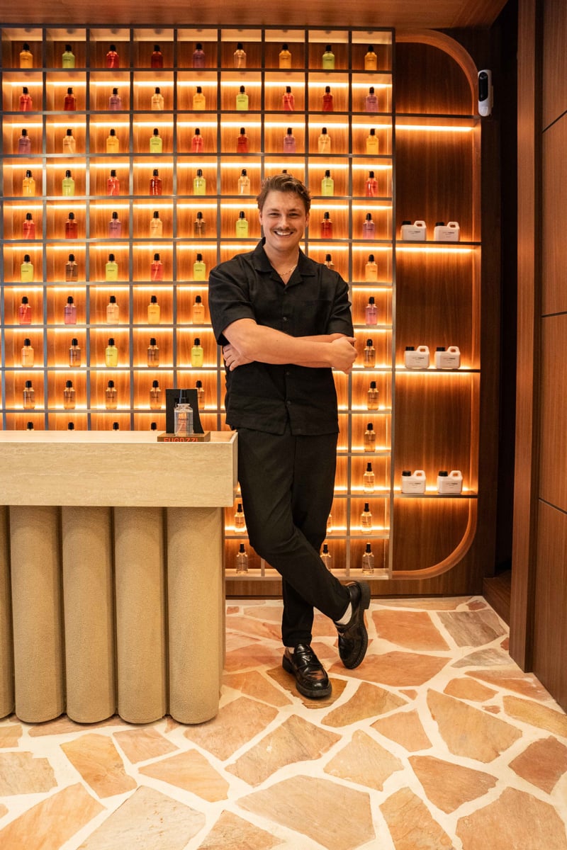 「フレグランスにおいて、ボトルやデザインは退屈なものでいいと思っている」。そう語るのは、オランダ・アムステルダムでブランド「フガッジ(FUGAZZI)」を立ち上げたブラム(Bram)氏だ。2018年にローンチし、ヨーロッパを中心に45ヶ国に販路を広げ、今年アムステルダムにバーを併設した旗艦店をオープンするなど順調に成長するブランドのブラムは、てっきり業界でのキャリアを活かしてビジネスを展開しているのかと思えば、全くの未経験者で、最初のフレグランス作りは「なんでもググった」というから驚きだ。