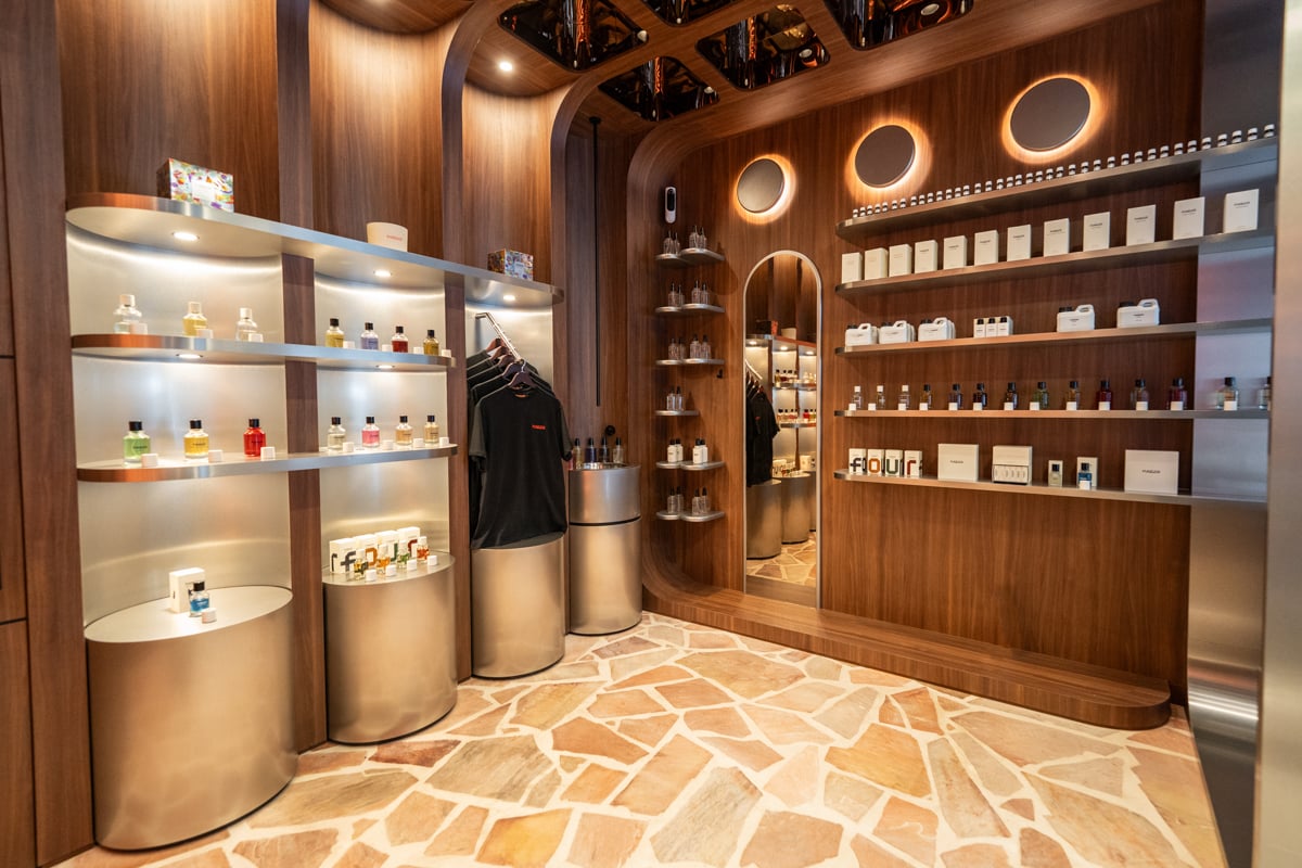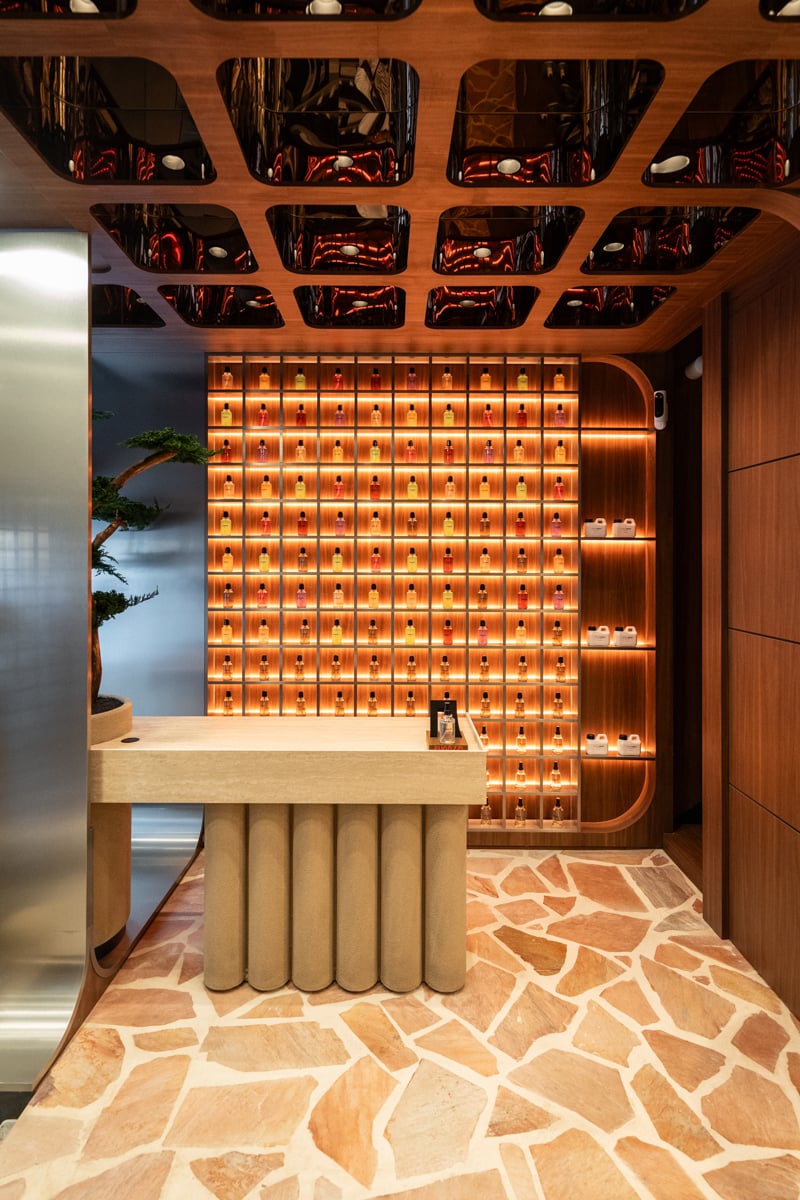 3階建てで、フレグランスショップ、オフィス、バーの複合的な施設にしたんです。1階のショップは落ち着いたウッド調の素材を用いて、ゆっくりと香りを選べる空間をデザインしています。壁一面にボディウォッシュを陳列した”ボディウォッシュ ウォール”も見どころです。2階はオフィスで、モダンなデザインに整えました。3階はバーで、「TOKI(季)」や「HIBIKI(響)」など日本のウイスキーなどもありますよ。自分たちが自由に使えるスペースを持てたことで、より包括的にブランドの世界観やスタイルを発信できるようになりました。先日はDJイベントを開催しましたよ。