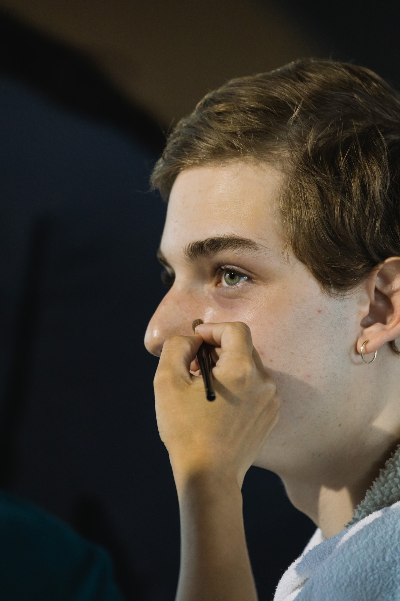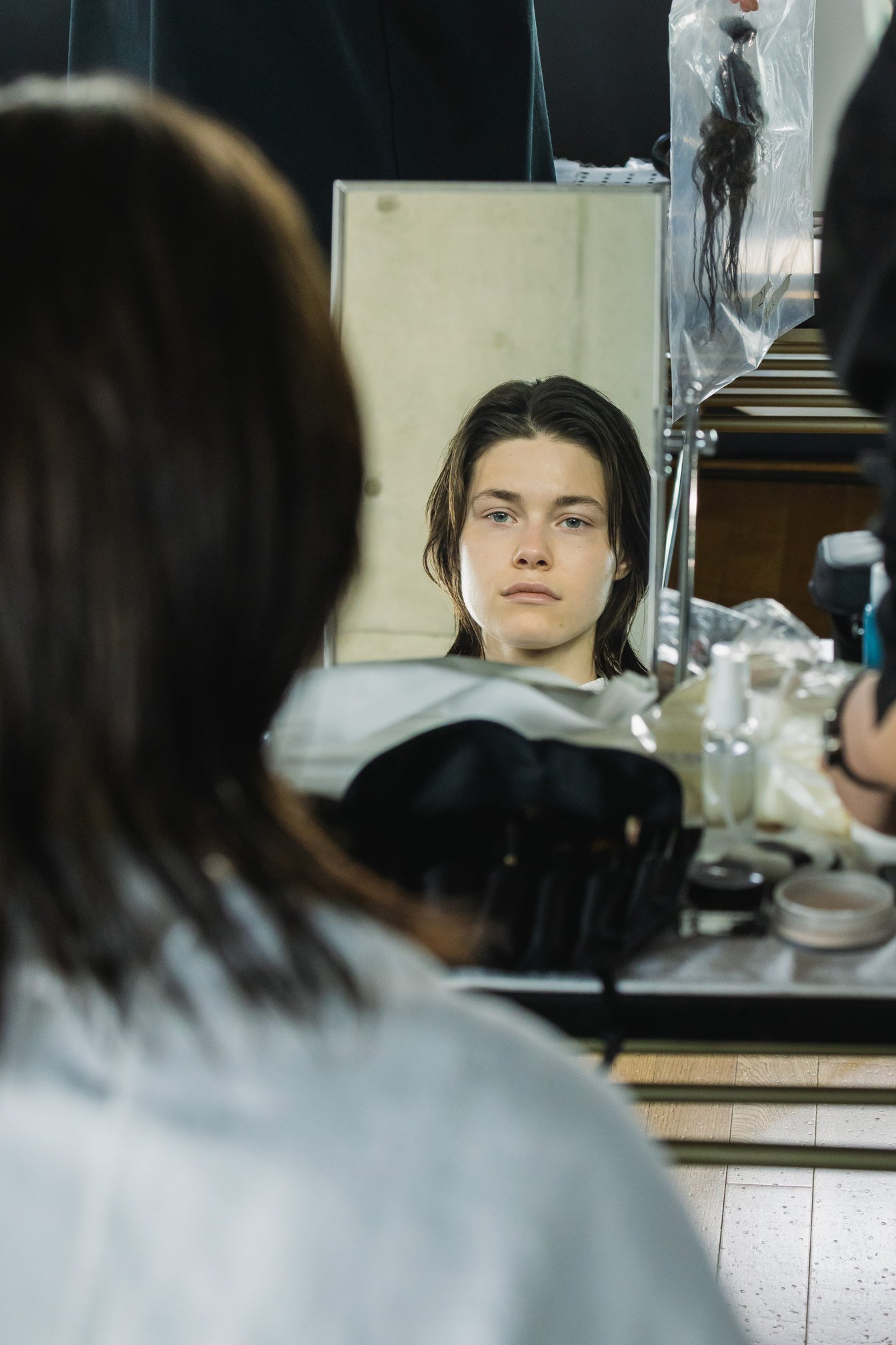 資生堂トップヘアメイクアップアーティストの計良宏文氏のもと、ヘアメイクがスタート。45人のモデルとBiSHメンバーをそれぞれ、「多様性と画一性」をテーマに仕上げていきます。
