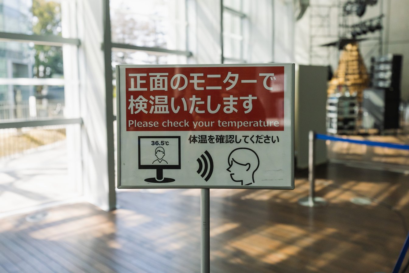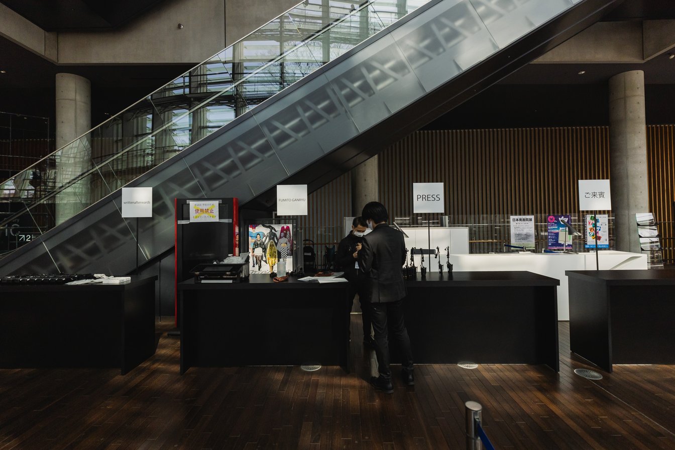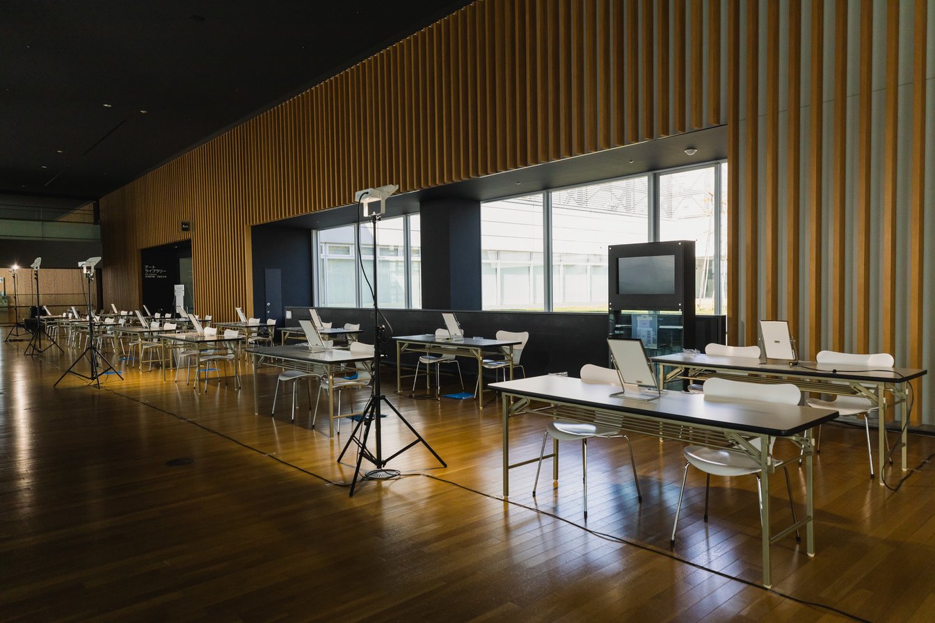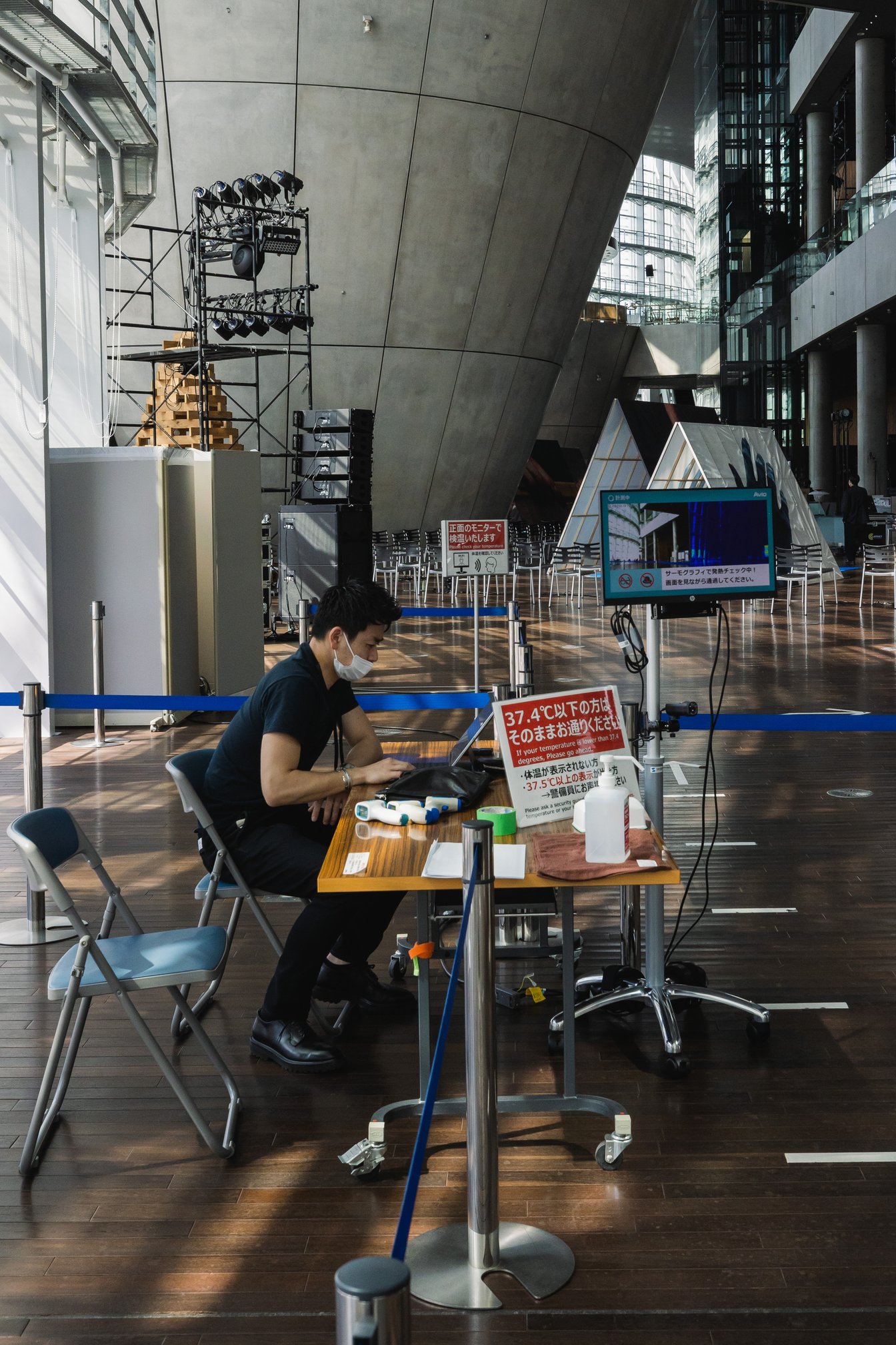 コロナ感染拡大を防ぐため、会場入り口には検温システムとアルコール消毒液。来場者がスムーズに入場できるよう、PRチームが事前にシミュレーションを行います。