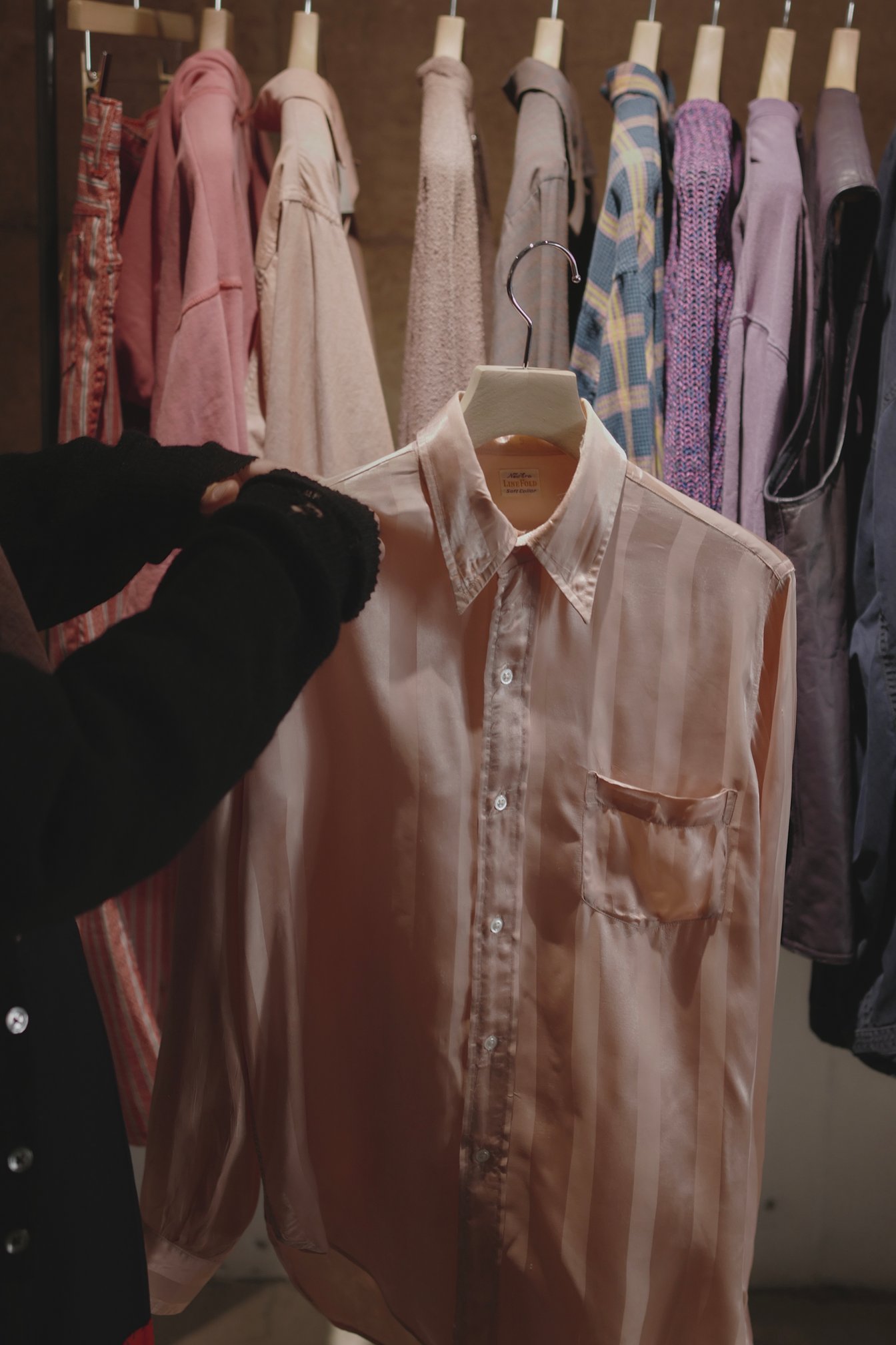 メンズ中心の売り場には新商品も並ぶ。サテン地のドレスシャツはピンクのストライプのデザインで、メンズトラッドの文脈から見るとかなり異色だ。