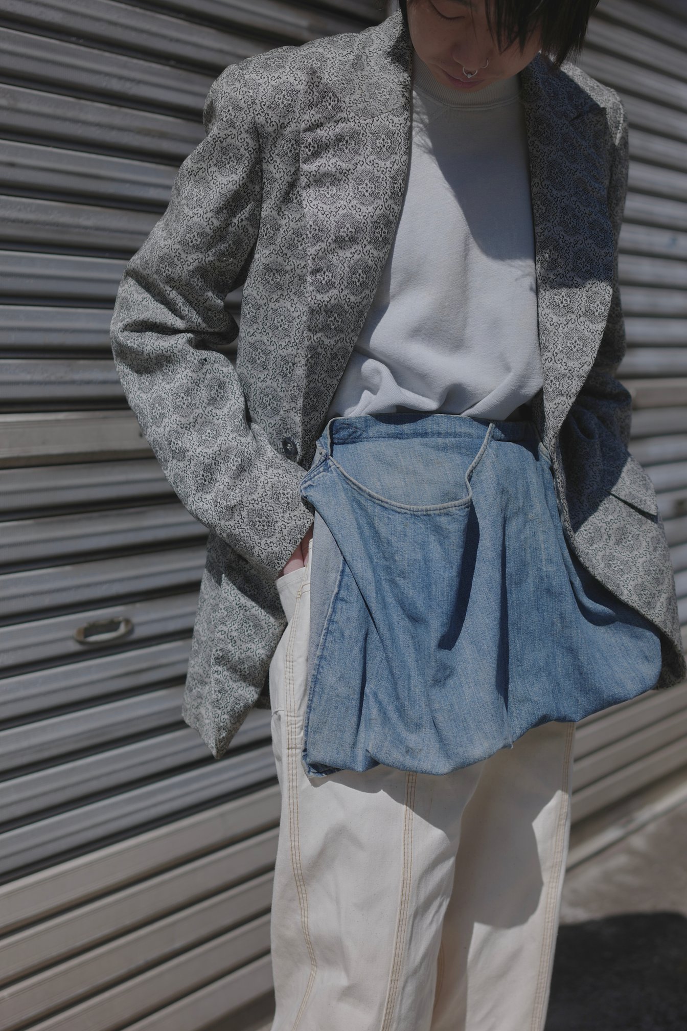 ペイズリー柄のテーラードには、きれいすぎないフレアパンツ デニムのワークエプロンを添えて