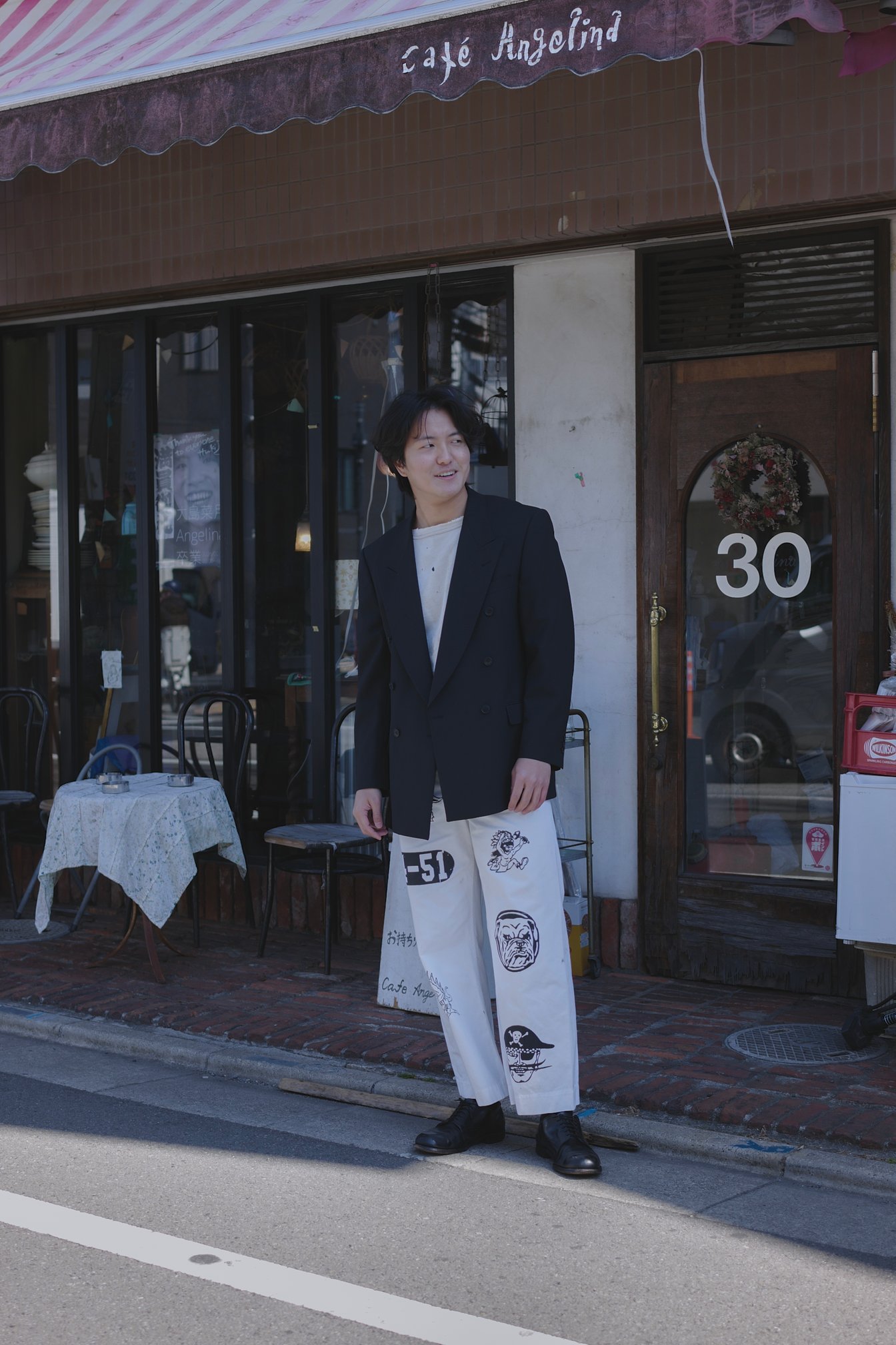 お店を代表するアイテムの1つであるテーラードジャケットを中心にスタイリングを組みました。かっちりしすぎないように各アイテムのニュアンスや、ワークエプロンなどでバランスを取っています。