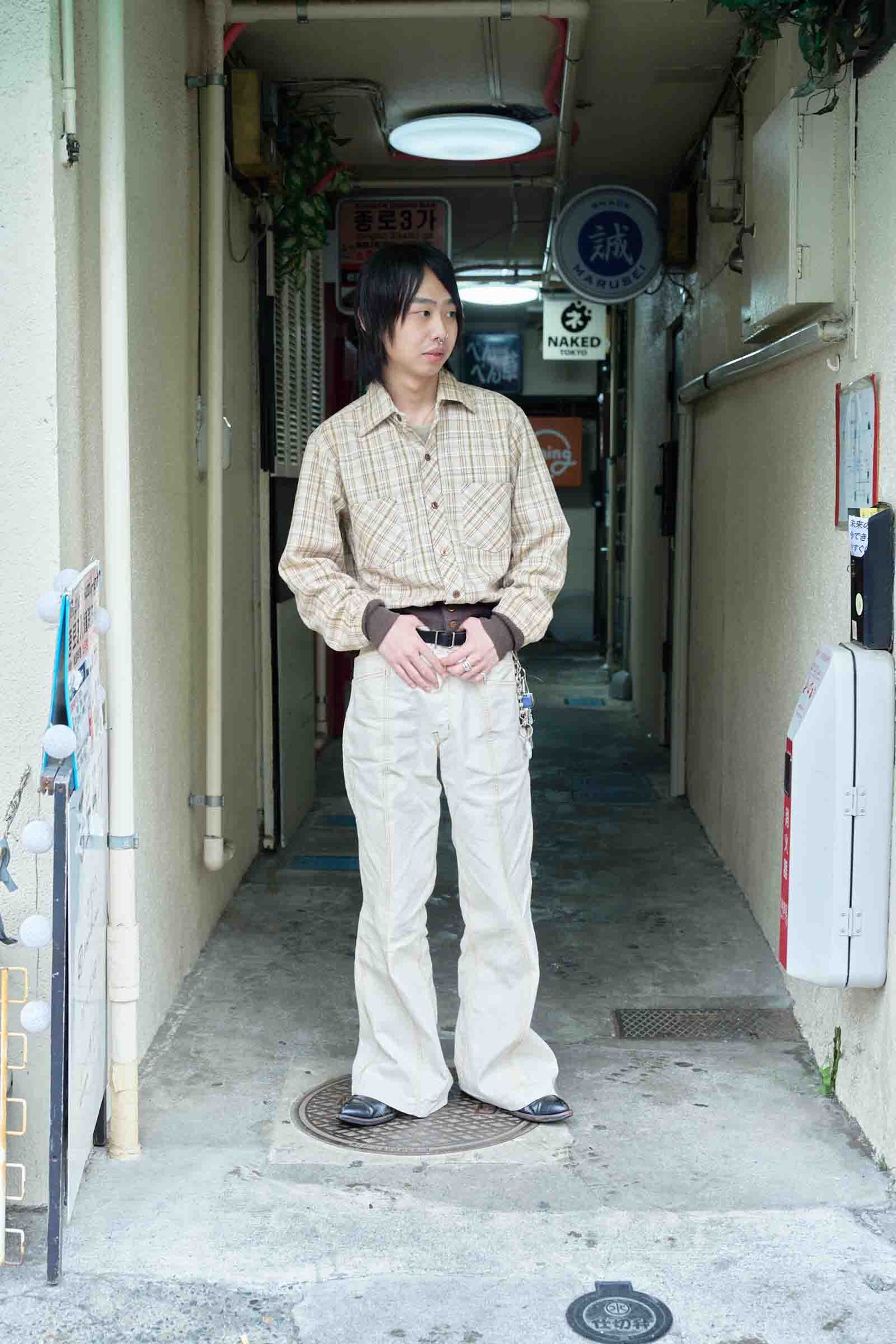 もともと洋服を作りたいという思いもあったというが、その志向は古着屋で働いている中で変化していく。「古着って、誰かが一度手放したものじゃないですか。自分の中では、買う前の状態は“ゼロに近い”ものとして捉えています。それを自分で選んで並べたときに、そこに意味が立ち上がるというか、自分の考えが表現になる感覚があるんです」。自分が着るために服を選ぶ行為とは異なり、店として何を仕入れ、どう並べていくのかを考えることに面白さを見出すようになった。「デザイナーが考えて形にしていくのと、自分が考えて買い付けるのって、やっていることの構造は似ていると思っていて。新しい価値を作っている感覚に近いんですよね」。