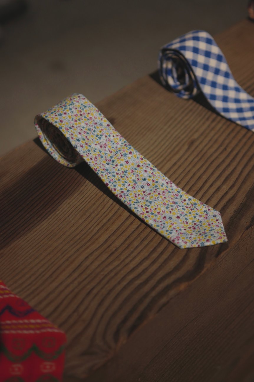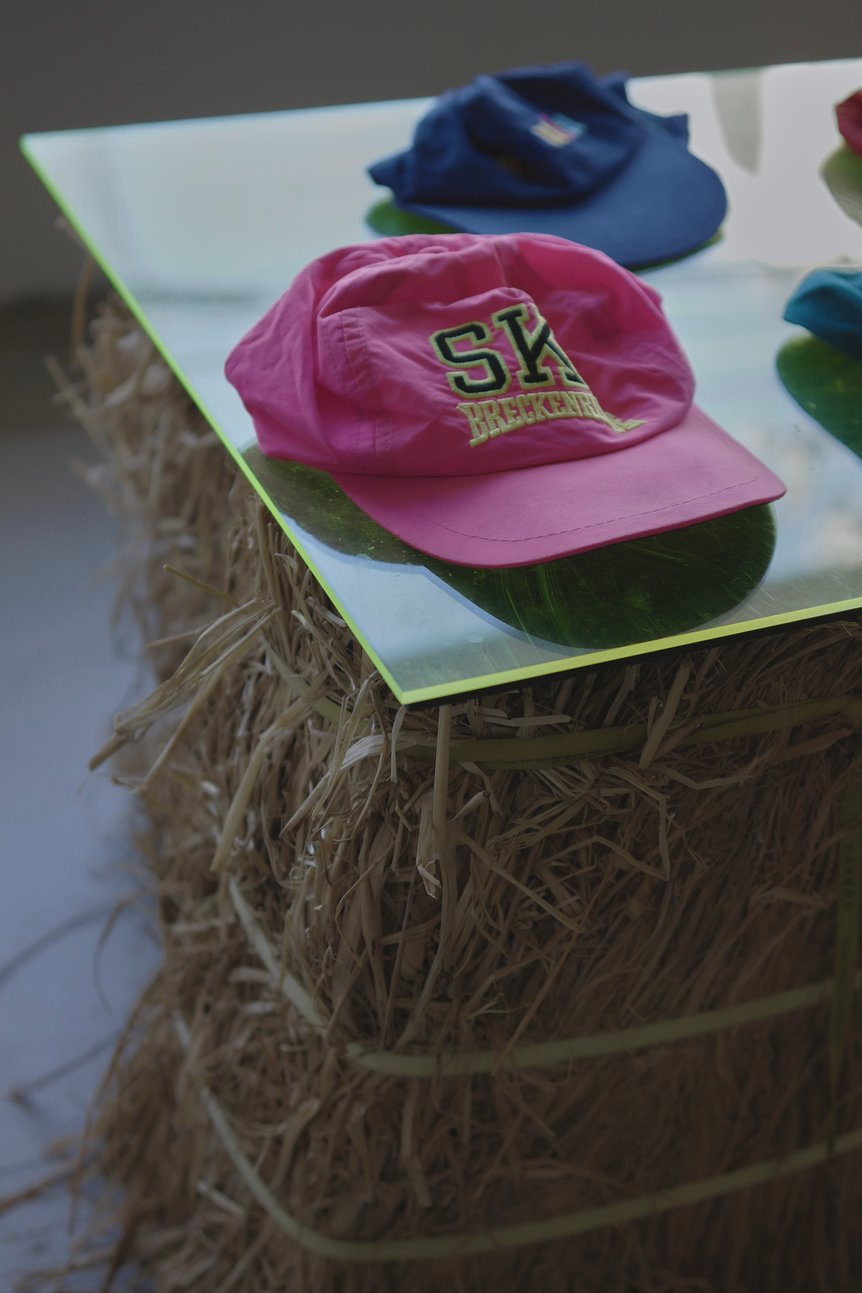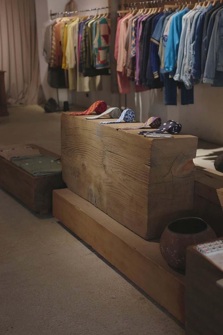 内装には隠されたこだわりが。シューズやネクタイなどが並ぶ木のディスプレイは、100年以上前のアメリカとカナダの国境に架かっていた橋の古材を使用。帽子が陳列されているラミネート板の下にある藁は、稲葉さんの妻の実家が畳屋であることに由来するものだ。複数の場所に分けて置かれている浅間山の花崗岩は、「時間の経過によって出来上がっていく点」が古着と似ており、シンパシーを感じたそう。昔は一箇所にまとめて積み上げていたが、友人に「思想が強そう」と言われたことを機に、今の配置に変わったという。