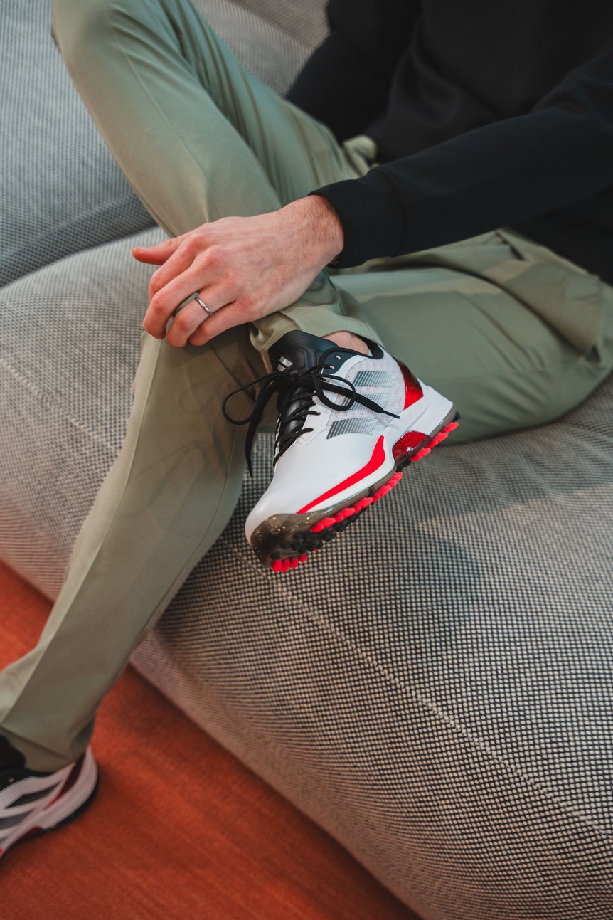 ゴルフシューズだと、踏ん張った時に内部で足が動いたりズレてほしくないから、最も求めることは安定感と高いグリップ力かな。デザインやカラーも無視できないけど、良いパフォーマンスを発揮するために機能性が最優先事項だよ。とはいえ、パフォーマンス性もデザイン性も兼ね備えているのが一番。その点、今日履いている最新ゴルフシューズ「アディゼロ ZG 25(Adizero ZG 25)」は、両方を兼ね備えていて良い感じだね。