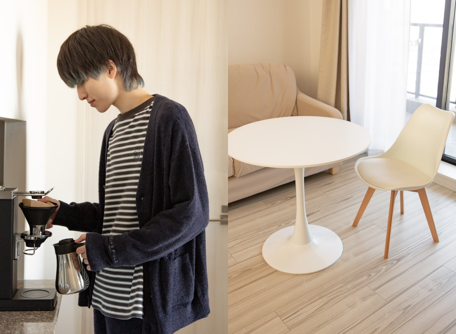 基本的に、モノを置きたくない性格なんです(笑)。とにかくシンプルな部屋が好き。テーブルやチェアをはじめ、必要最低限のお気に入りの家具だけを置くようにしています。フローリングやドアなど白系の木材が使われていて全体的にホワイトを基調とした空間になっているので、インテリアもなるべくホワイト系のものを選ぶことで統一感のある部屋に仕上げています。ルームウェアも空間との調和を意識していて、ミニマルな空間に合うようなシンプルなデザインのアイテムを選ぶことが多いです。お気に入りのスペースは、ゆったり座れるこの大きなソファ。休みの日にはソファでコーヒーを飲みながら、Netflixで映画を見たりしてくつろいでいます。
