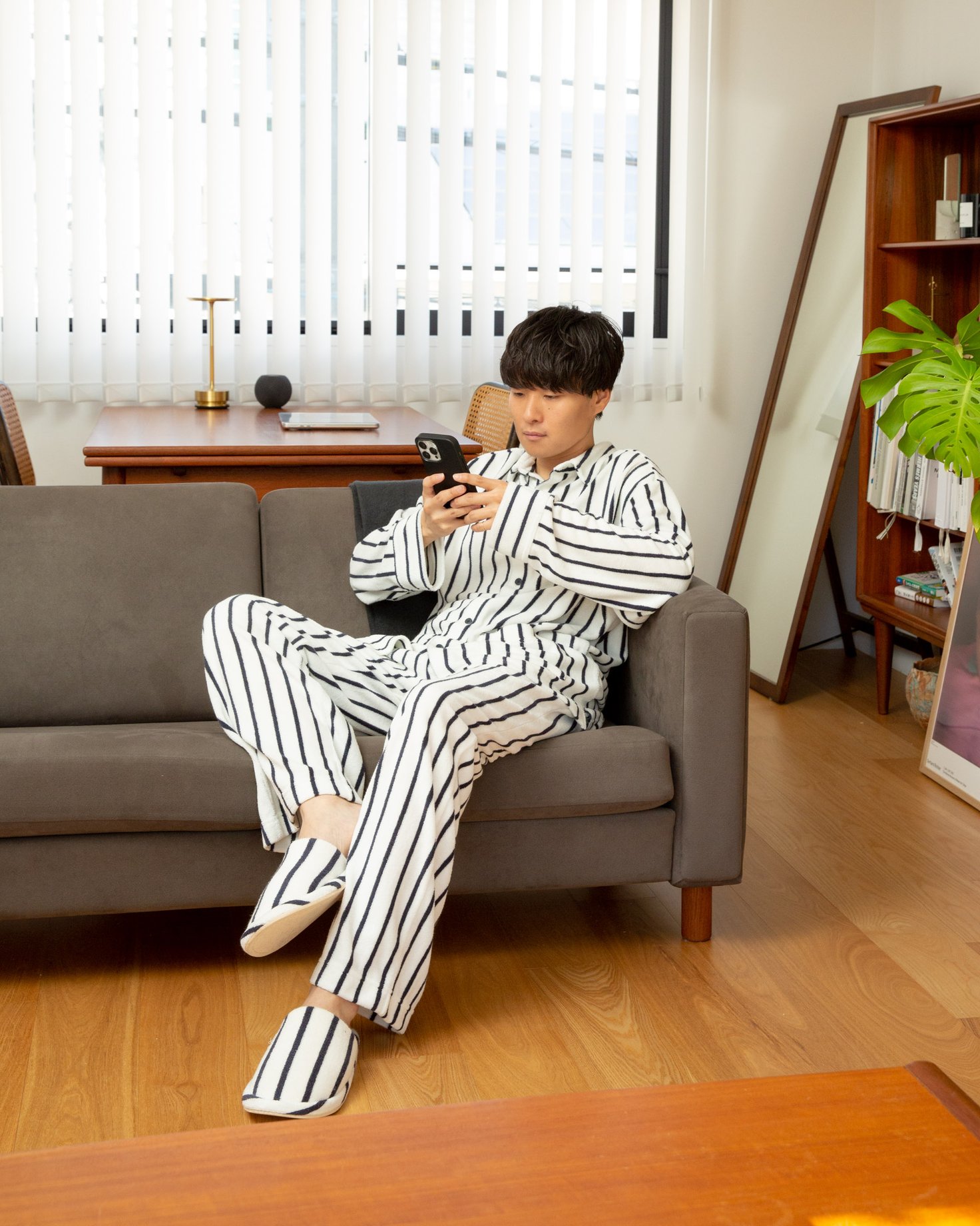 柔らかなパイル地がリラックス感があって心地良いです。まだ少し肌寒さが残る春先にラフに着るのにも丁度良いアイテムですね。トップス、ボトムス、ルームシューズとトータルコーデが楽しめるのも嬉しいポイント。自宅の落ち着いた雰囲気の空間にもマッチしているので気に入っています。上下ストライプのセットアップは普段外で中々着ることが少ないので、ルームウェアとして着てみたいという気持ちがありました。「非日常的な服を楽しむ」「ルームウェアで遊んでみる」という面白さに出会えたアイテムですね。