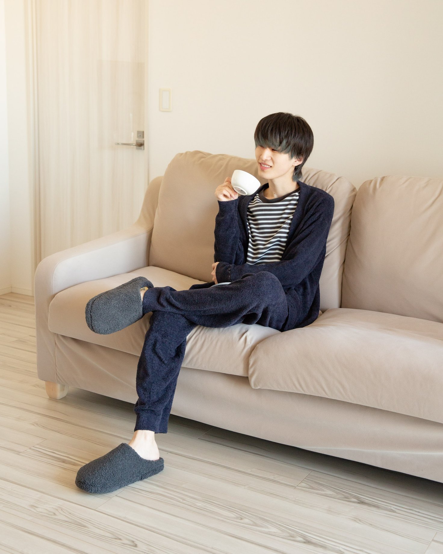 ルームウェアってお家時間の気分を上げてくれるアイテムだと思っていて。なので、部屋にいるからといって適当な格好はあまりしないようにしています。ジェラート ピケ オムのアイテムは普段使いしていて、冬は「スヌーピー」とのコラボルームウェア、夏はジェラート ピケ オムのTシャツやハーフパンツを愛用しています。今回着用した'スムーズィー'素材の新作カーディガンとロングパンツはしっとりとしたなめらかな質感。ジェラート ピケらしい柔らかな肌触りがとても心地良いです。薄手のVネックカーディガンはこれからの季節にさっと羽織れますし、シーズンレスに活躍しそうだなと。