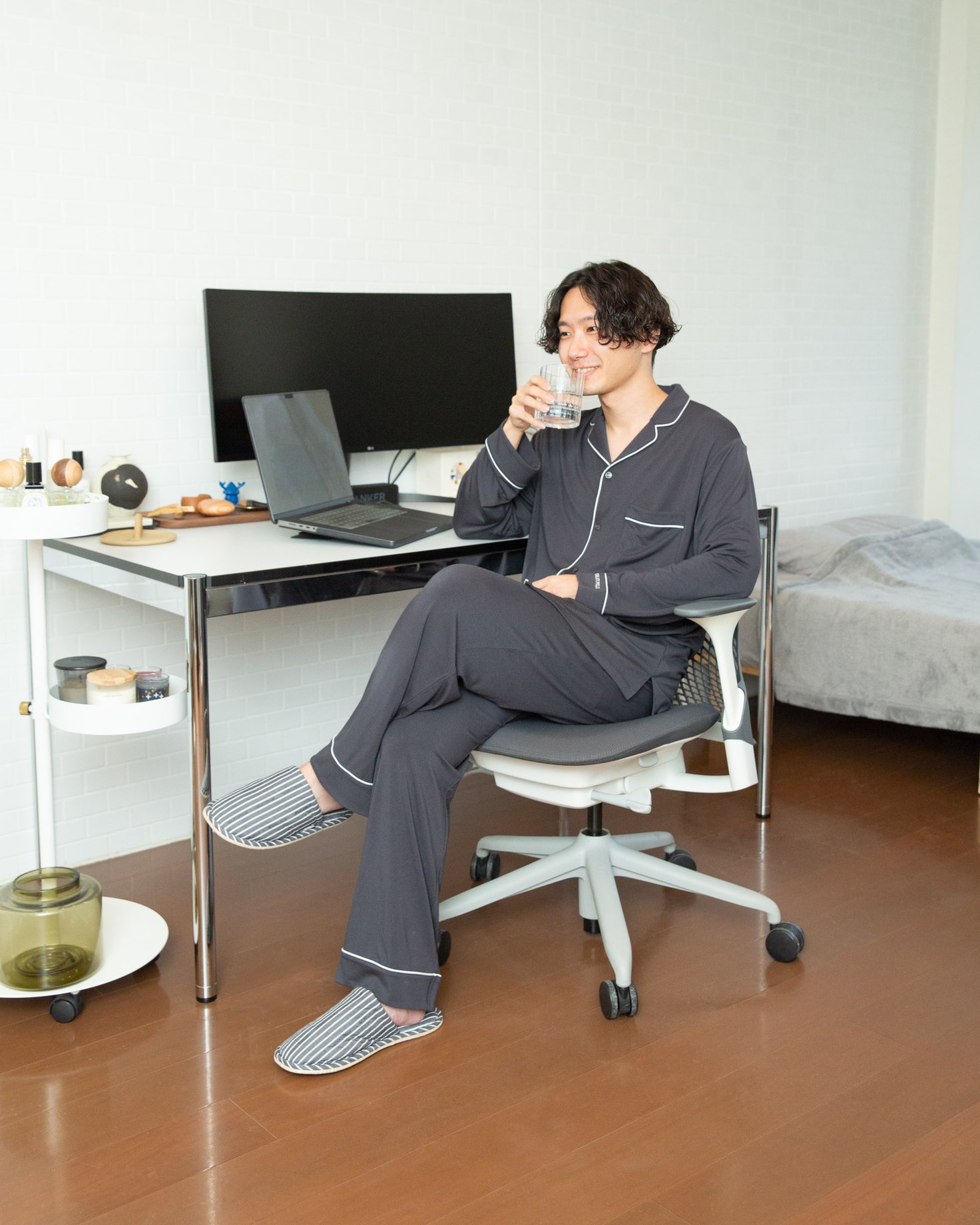 袖を通した瞬間の独特のとろみ感が心地良いですね。家ではなるべく楽な格好でいたいと思いつつ、折角ならルームウェアで普段着とのギャップも楽しみたいと思っていて。このモダールパジャマシャツはシンプルでベーシックなデザインながら、シックな大人の雰囲気があります。部屋の雰囲気に合うデザインのルームウェアを探していたので、モノトーンにまとめた部屋の雰囲気と落ち着いたダークグレーの色味がマッチしていて気に入っています。