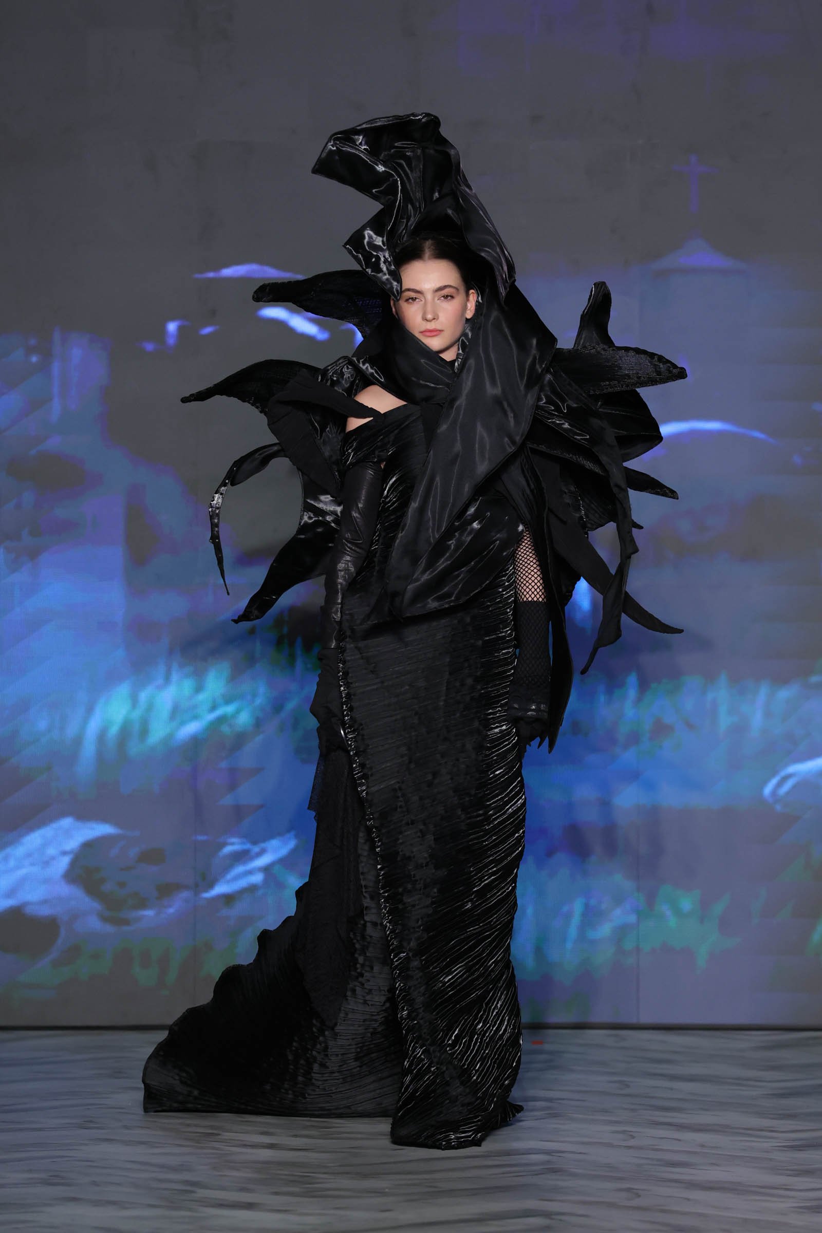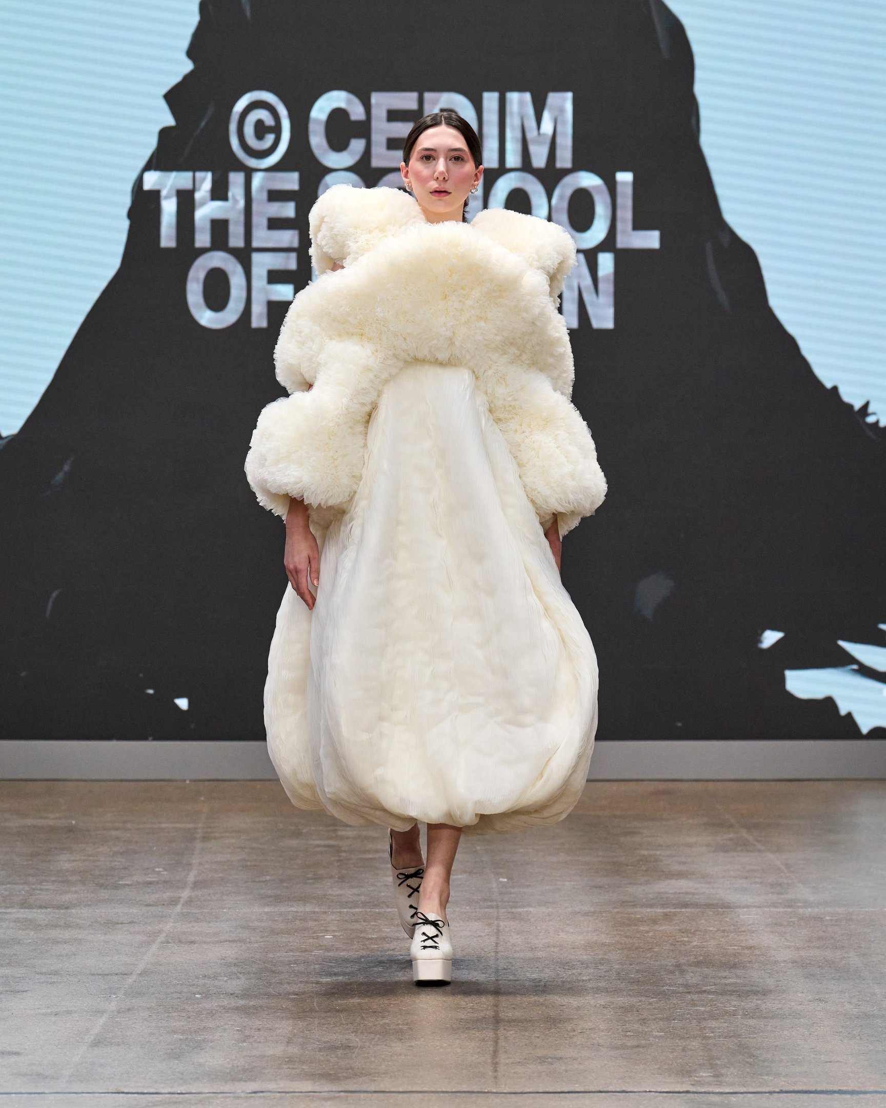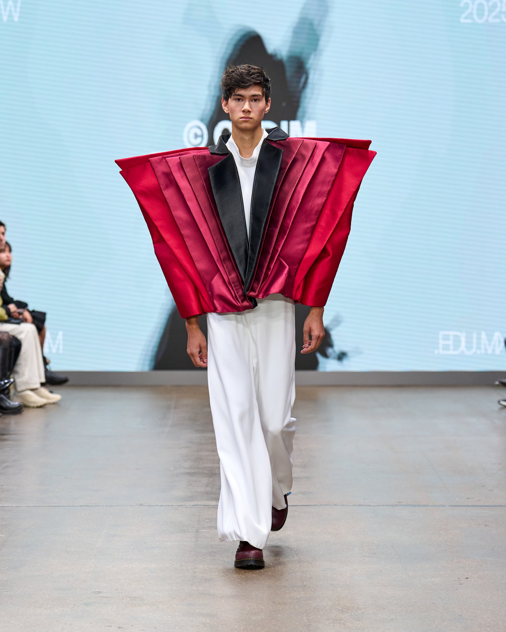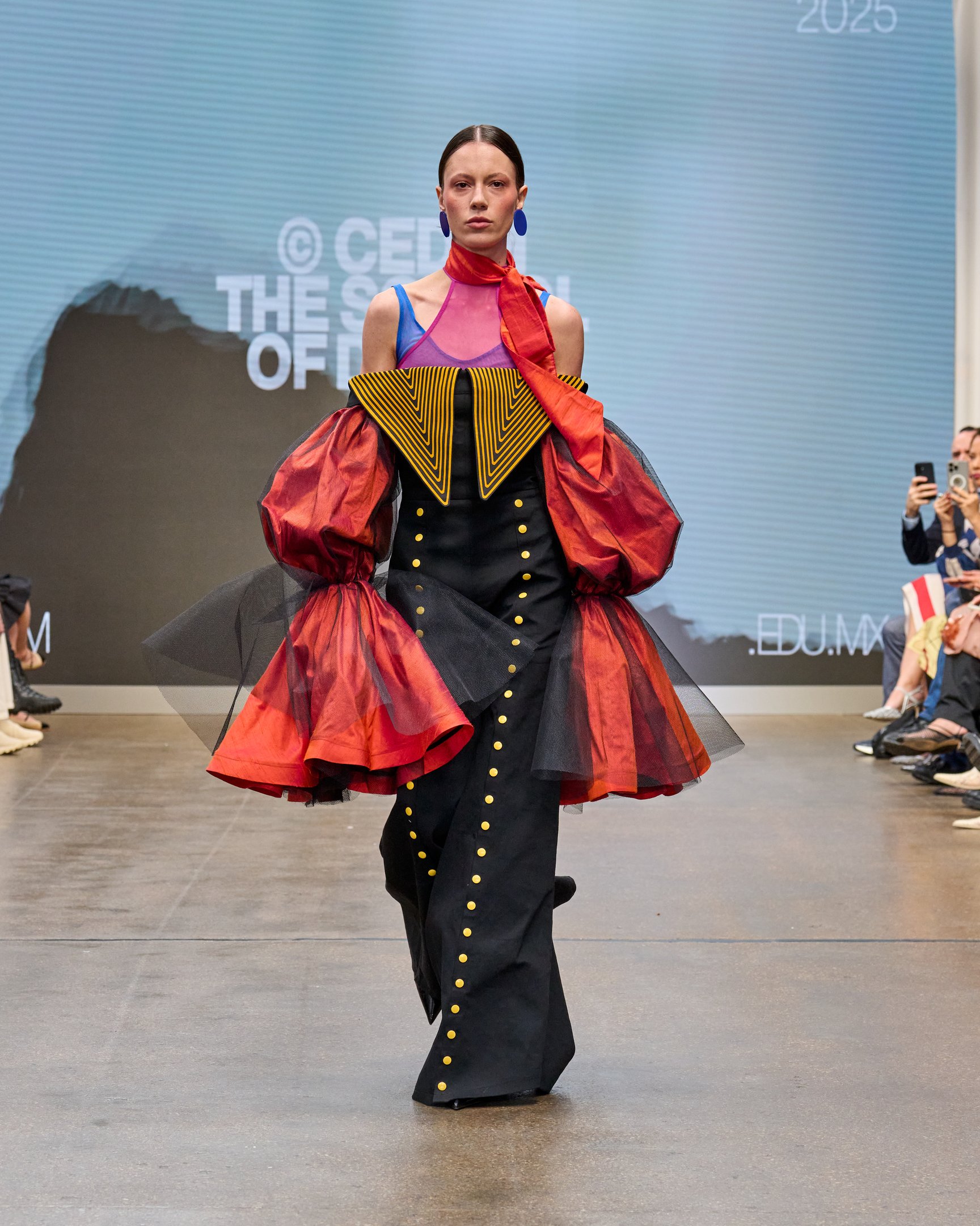 メキシコのデザインスクール「CEDIM」は、7人の新進デザイナーによる共同コレクション「PLAY」を発表。幼少期の遊びや身体感覚を手がかりに、創造の原点を多面的に探る試みが目を惹く。ランウェイでは、誇張されたボリュームで衝動を可視化したルックや、布を連ねて記憶の堆積を表現したドレスなど、多彩なアプローチが並んだ。遊びを「再生」や「抵抗」の視点から捉え直した解釈が造形に落とし込まれ、複数デザイナーの集合体でありながら一貫したテーマ性を保っている。異なる表現と一貫した視点が共存し、新世代による想像力の広がりを感じさせるコレクションとなった。