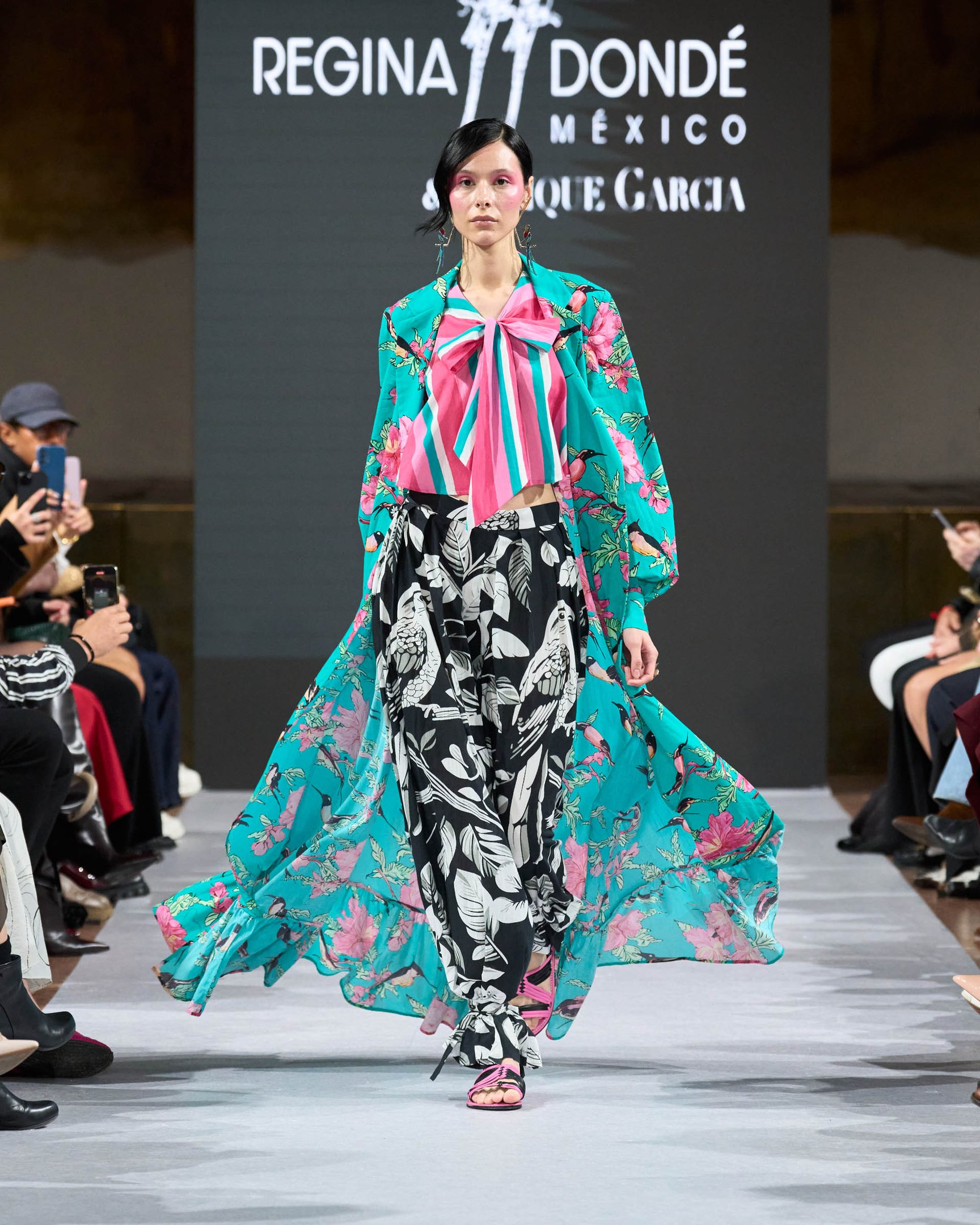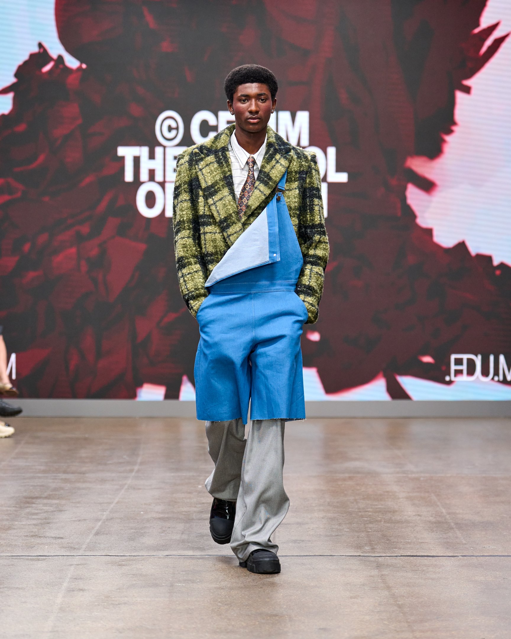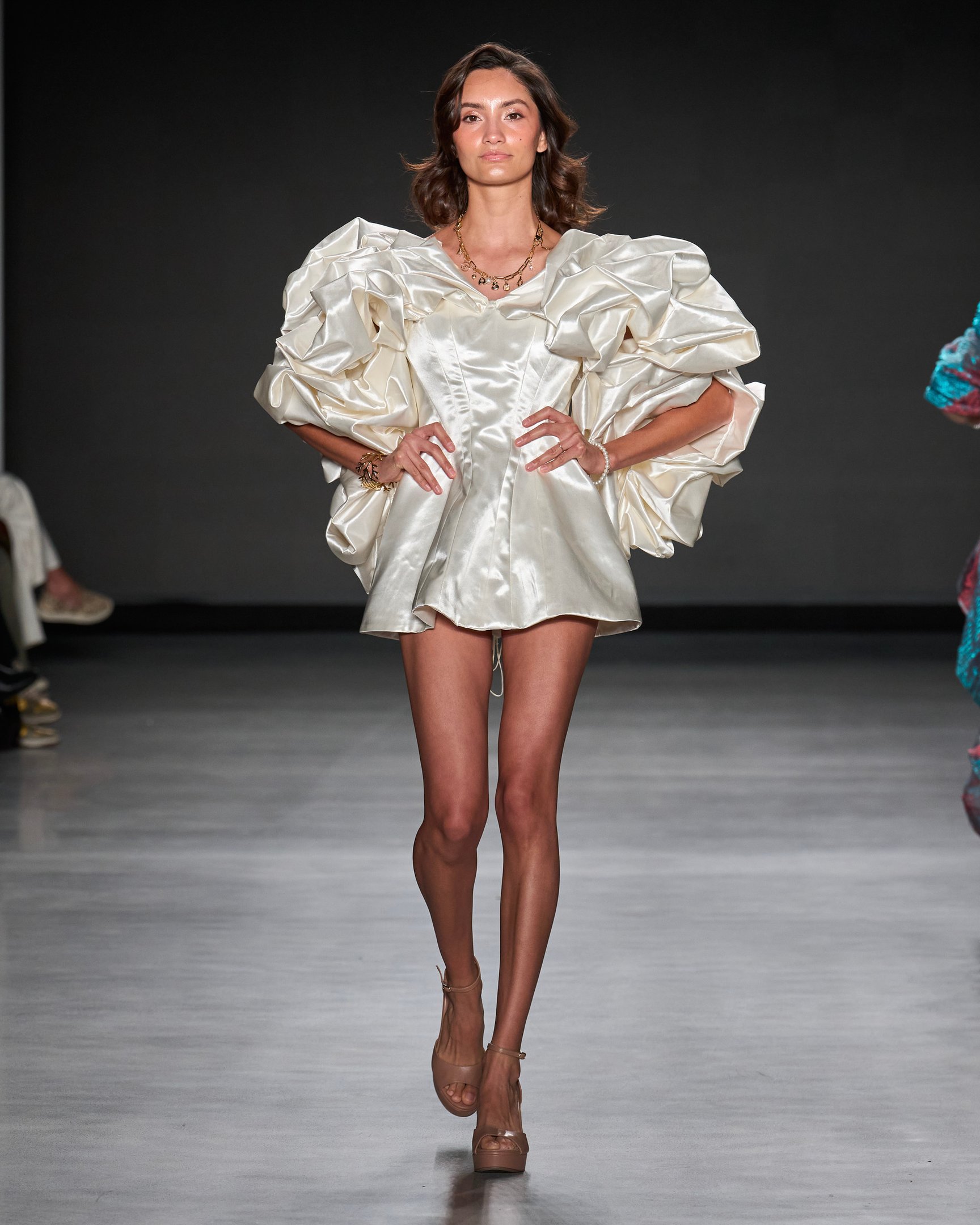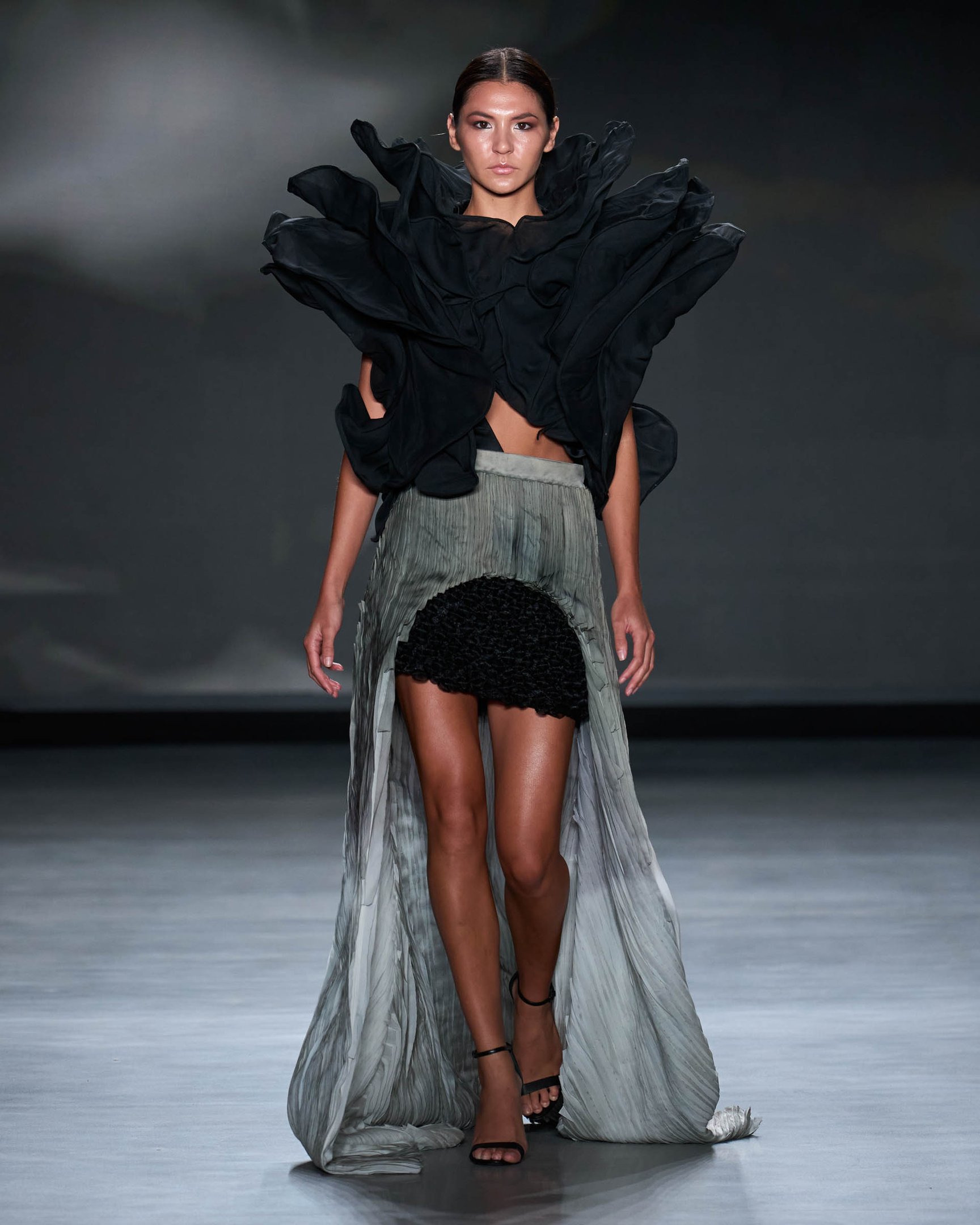 メキシコのデザインスクール「CEDIM」は、7人の新進デザイナーによる共同コレクション「PLAY」を発表。幼少期の遊びや身体感覚を手がかりに、創造の原点を多面的に探る試みが目を惹く。ランウェイでは、誇張されたボリュームで衝動を可視化したルックや、布を連ねて記憶の堆積を表現したドレスなど、多彩なアプローチが並んだ。遊びを「再生」や「抵抗」の視点から捉え直した解釈が造形に落とし込まれ、複数デザイナーの集合体でありながら一貫したテーマ性を保っている。異なる表現と一貫した視点が共存し、新世代による想像力の広がりを感じさせるコレクションとなった。