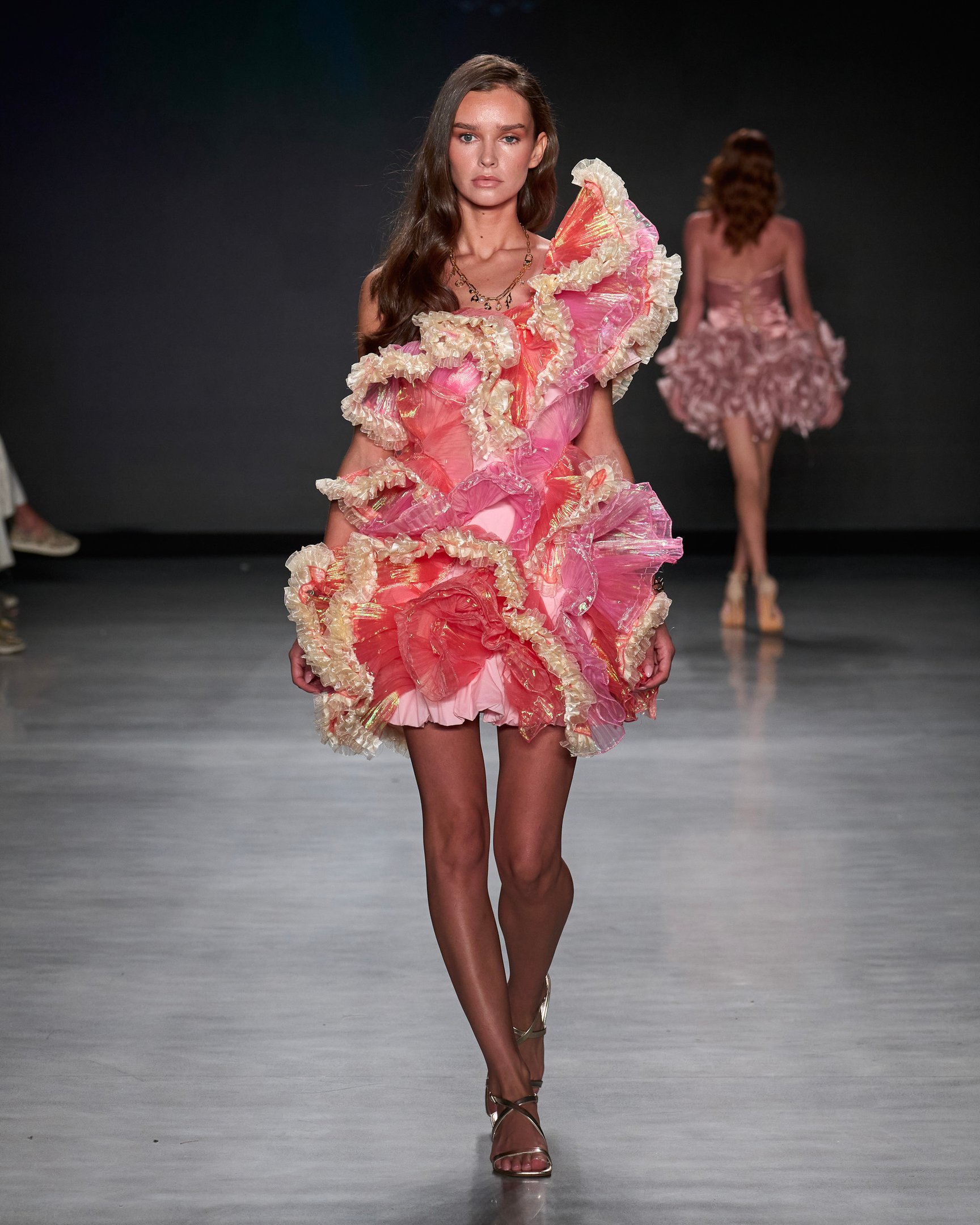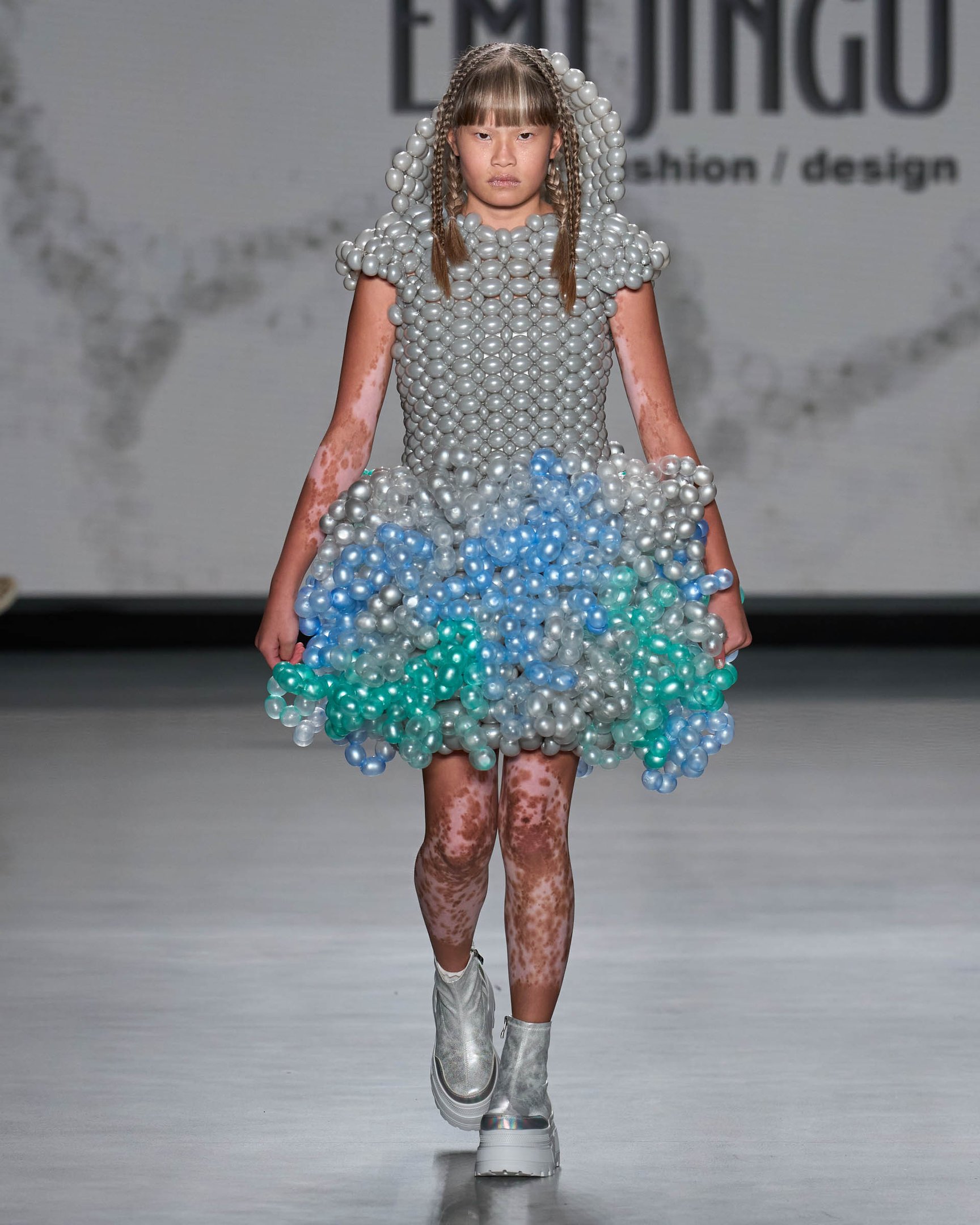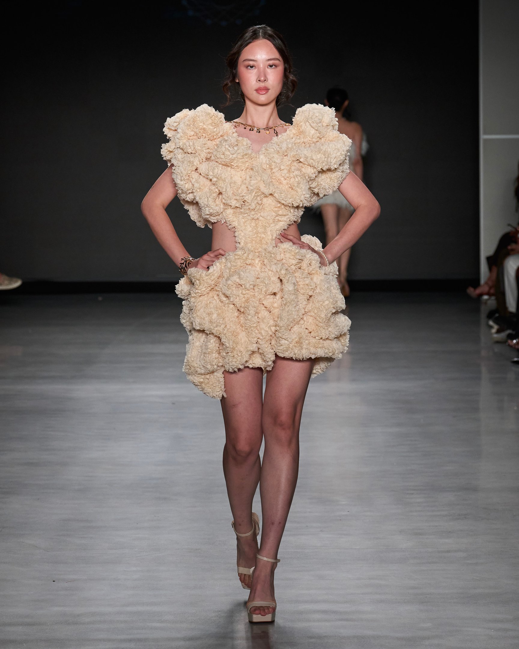「Recolored」と題し“再生”をテーマに、内に秘めたエネルギーを立体的なフォルムへと昇華したアシュリン・ソー。サンゴ礁から着想を得た色彩と質感のグラデーションは、ダイナミックなボリュームとともに躍動し、生命の息吹を感じさせる。14歳でデビューを果たした若きデザイナーが描くのは、社会的な圧力や同調によってすり減った感情の解放。壊れやすいものを慈しみ、自分らしさを肯定するようなメッセージがショー全体に息づいている。
