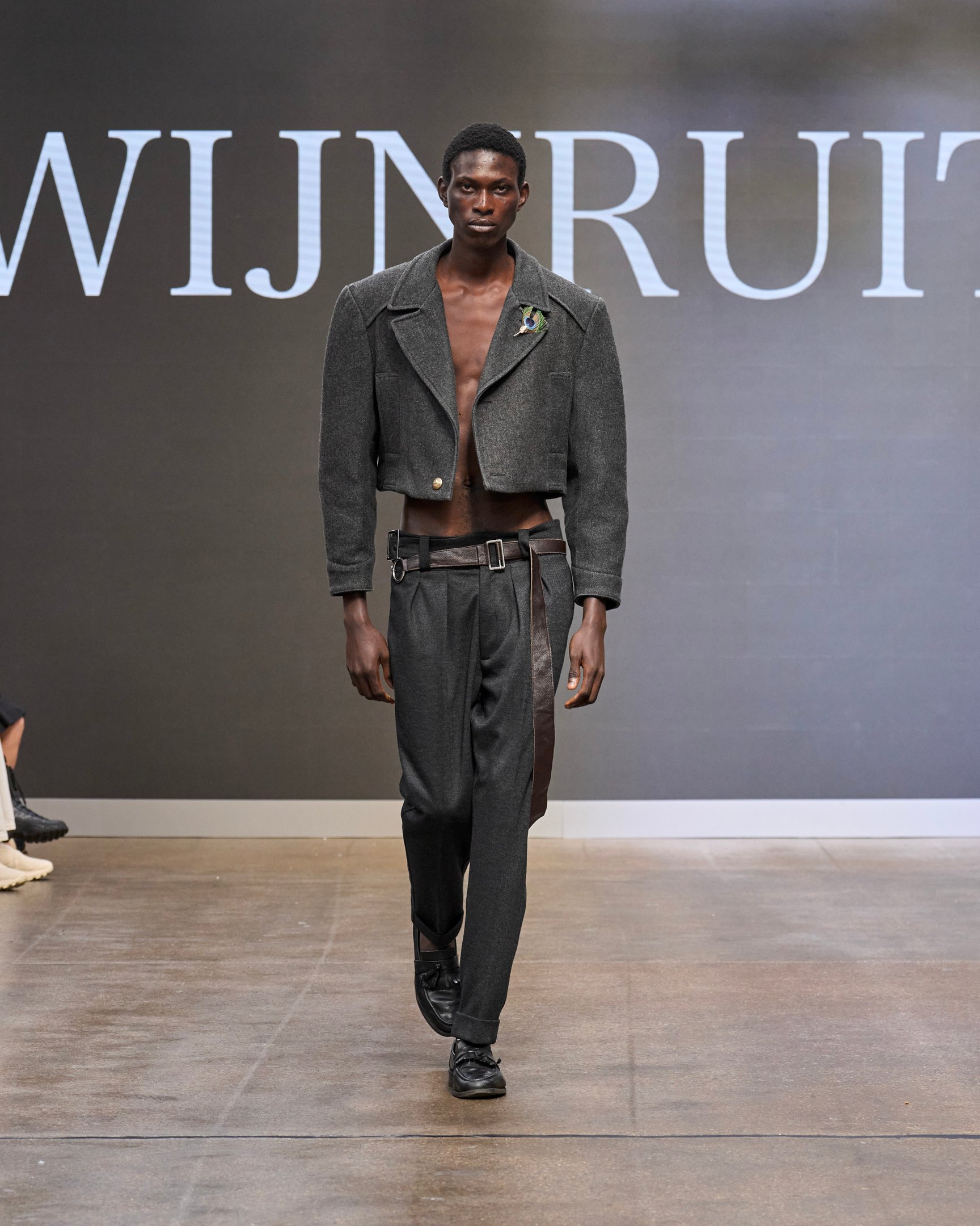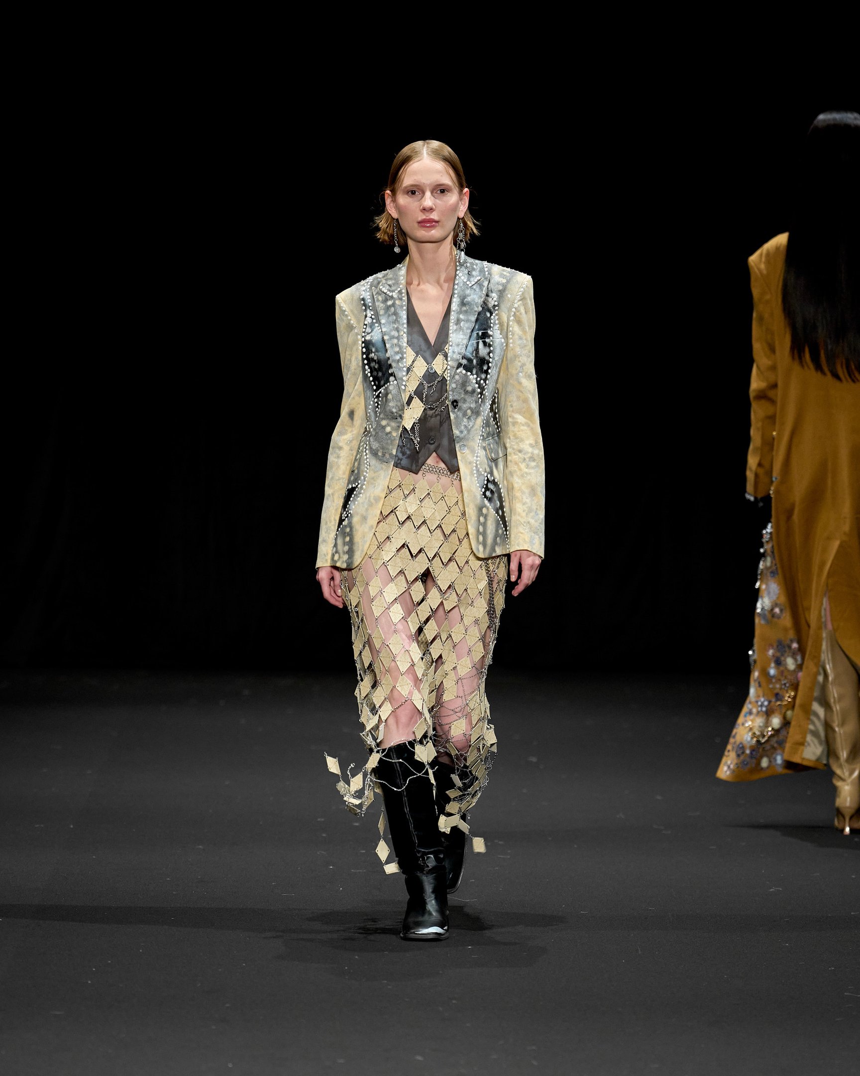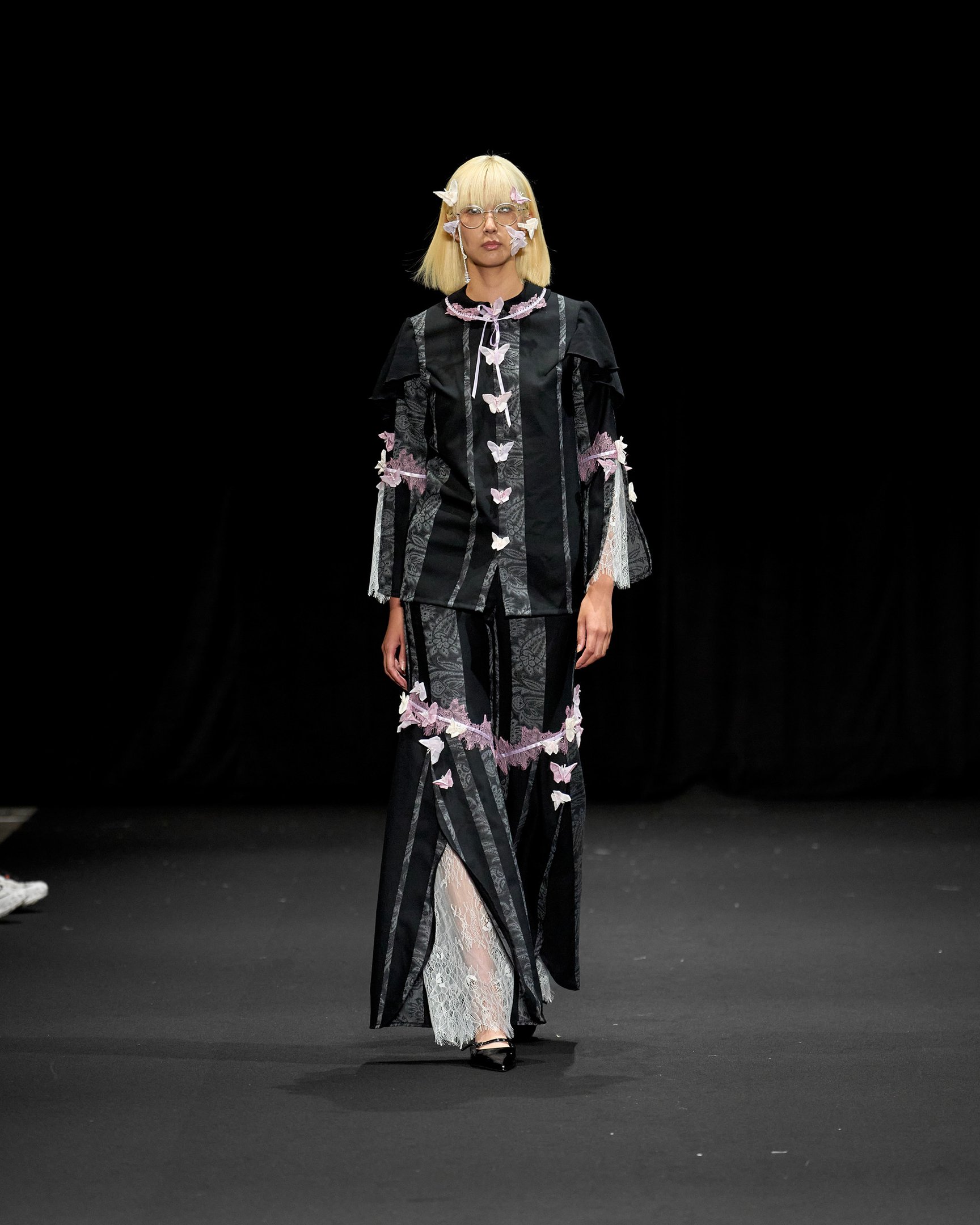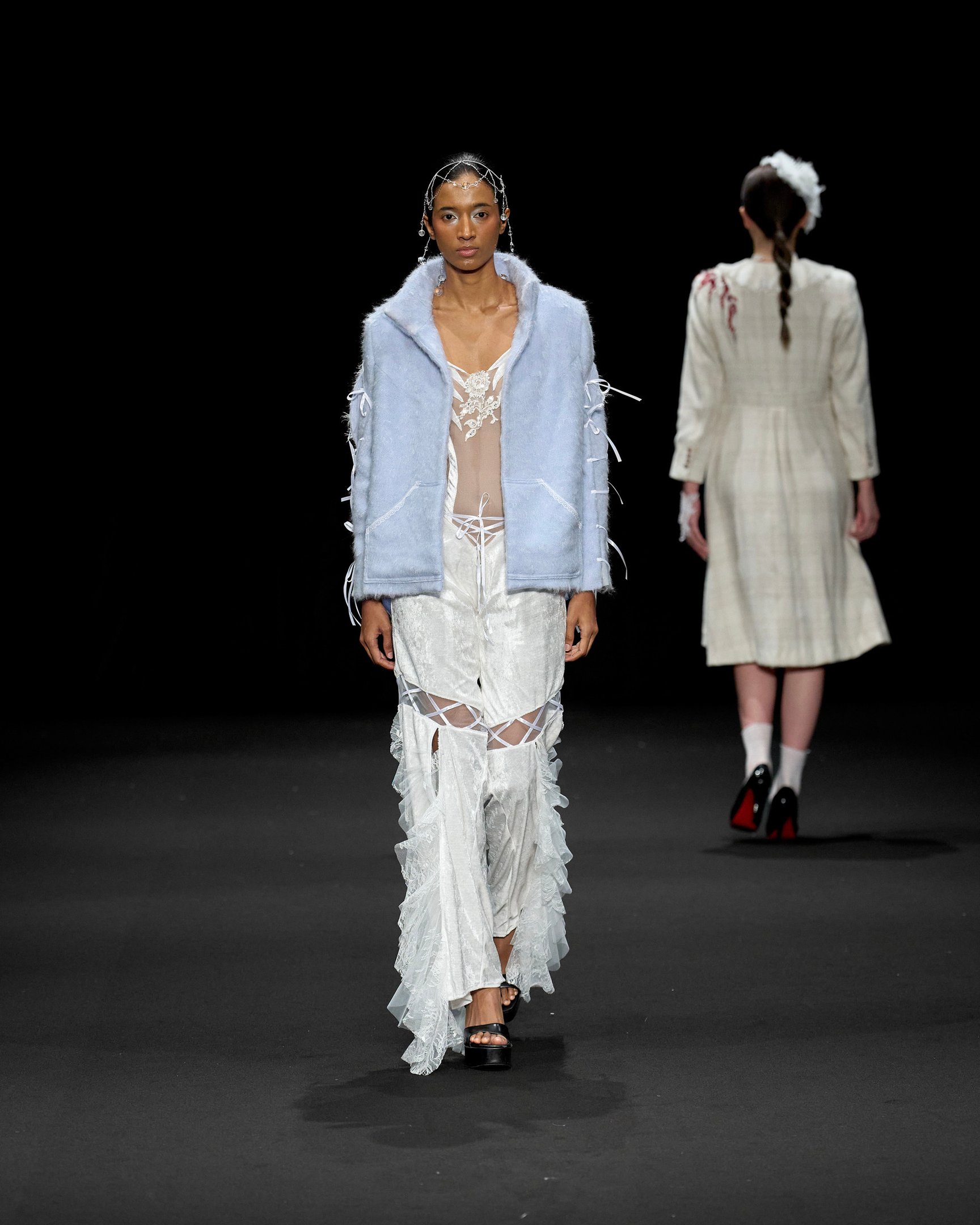 ロンドンを拠点に活動するジュエル・ケイが手掛けるウィンルートは今季、“崩壊から生成へ”という変容のプロセスをテーマに設定。シャープなテーラリングに、サテンやレースといった異なる質感を融合し、硬質さと流動性、緊張と緩和が交差するフォルムを構築。着崩しのニュアンスがストイックな造形にしなやかな動きを生み出し、相反する要素を融解させている。ロンドンらしい実験精神のもと、均整を崩した美しさで新たな表現を切り拓いた。