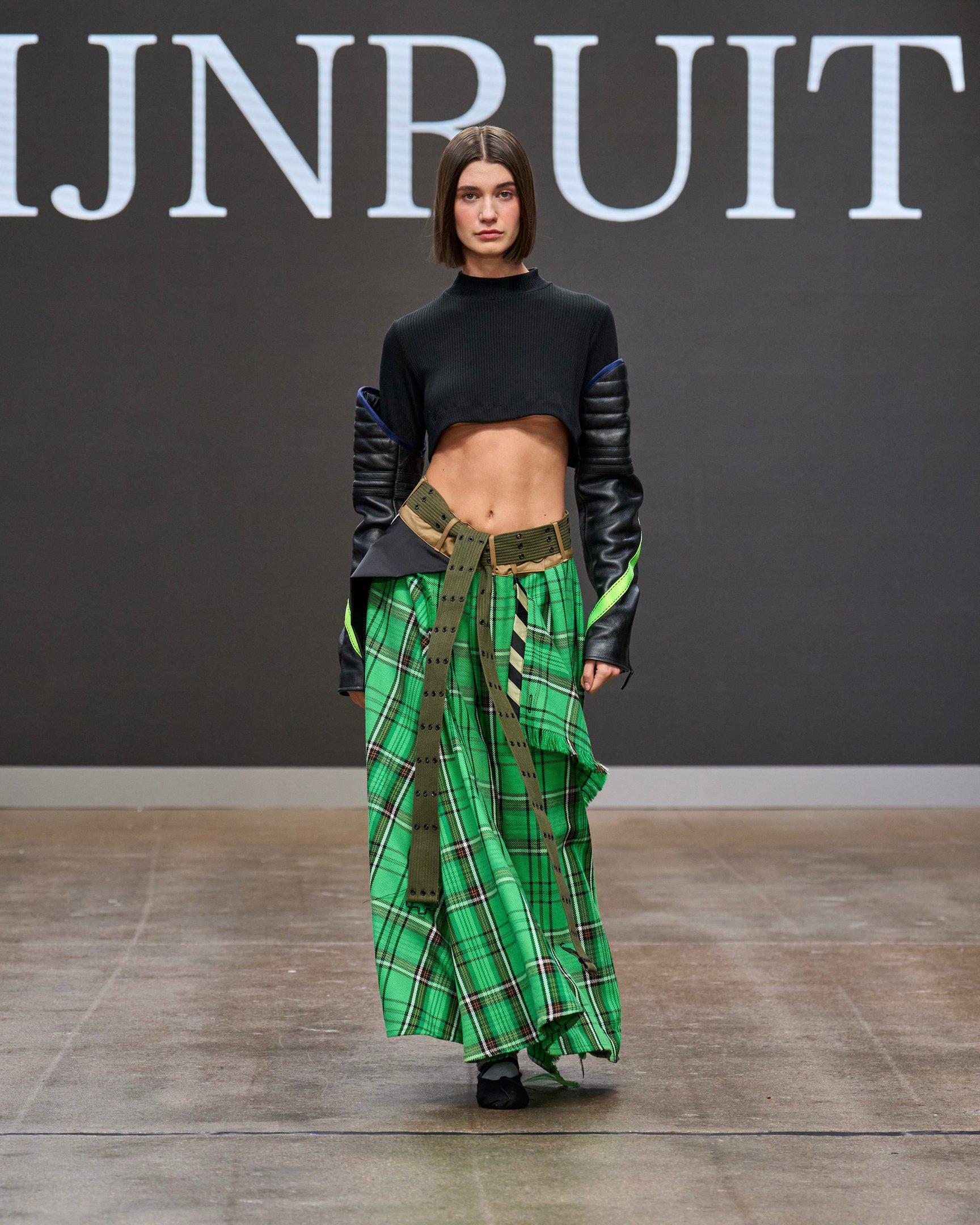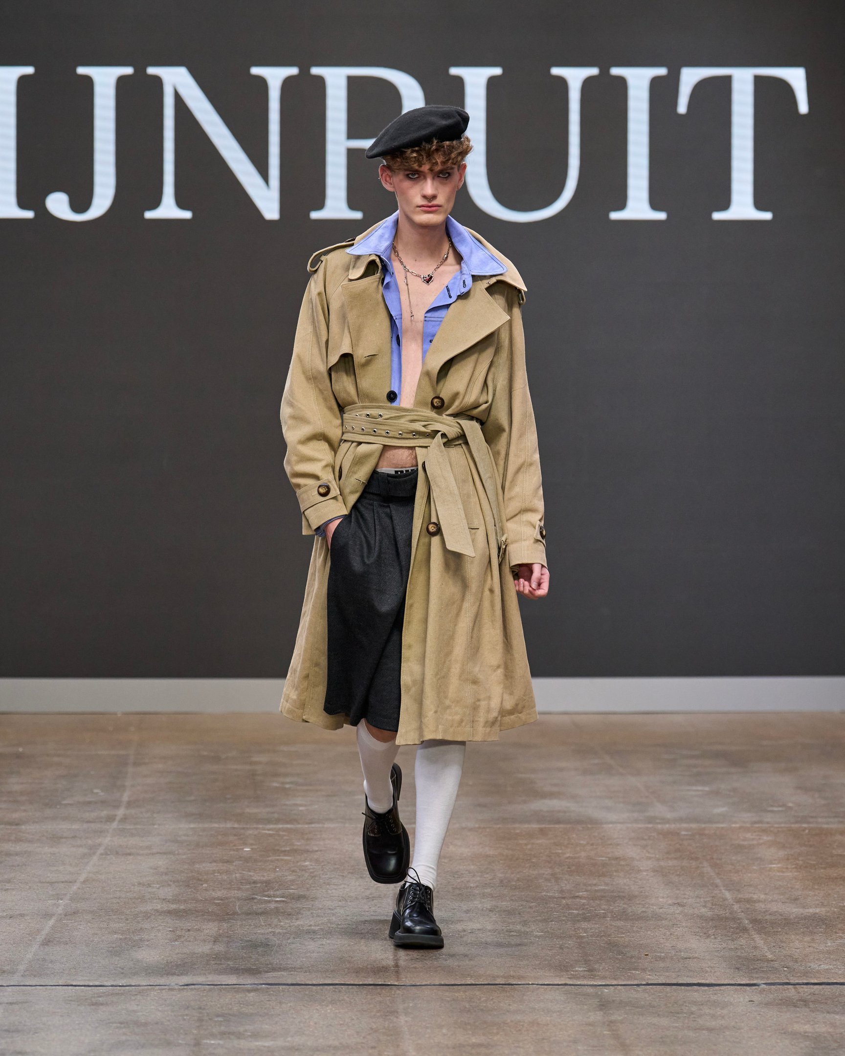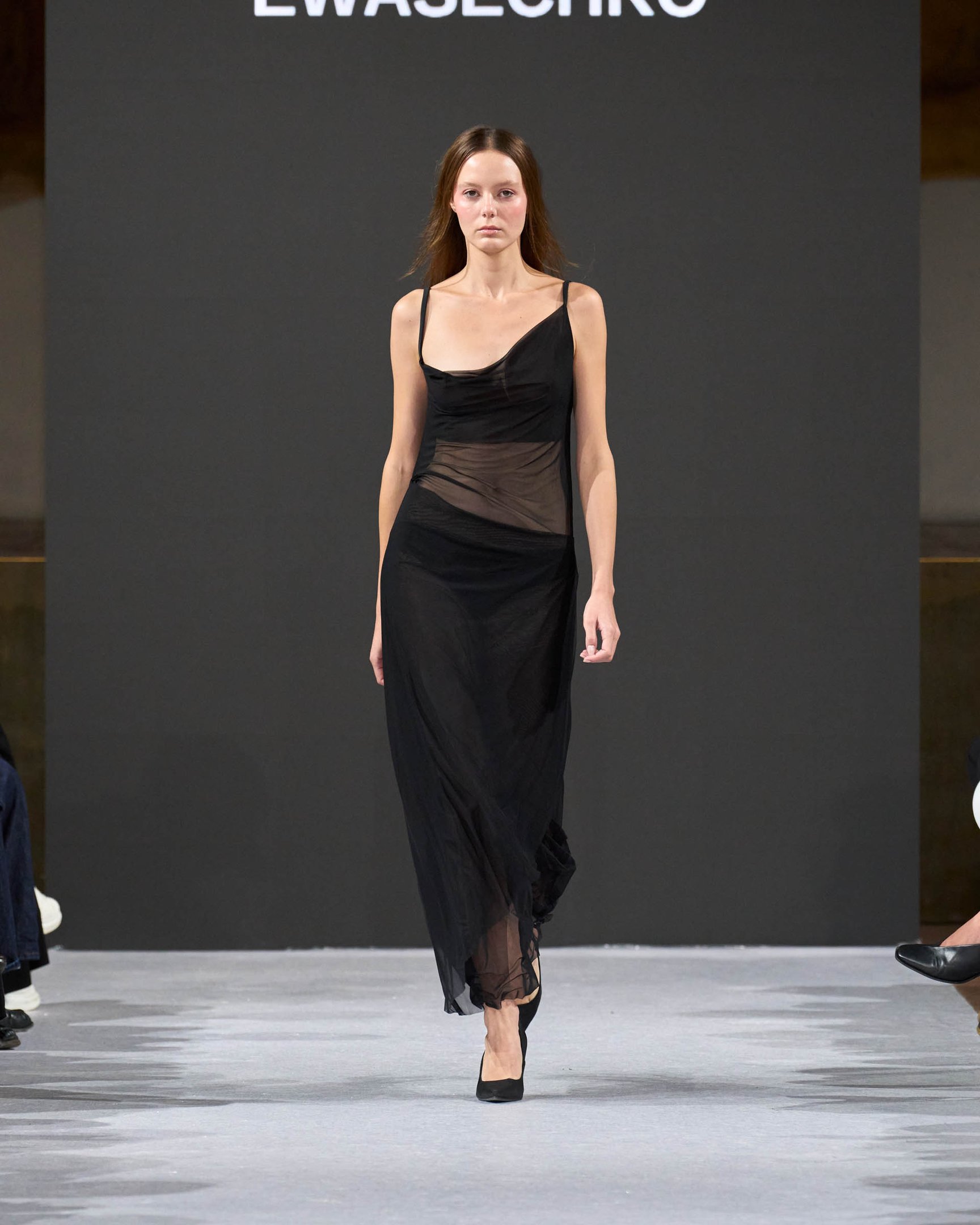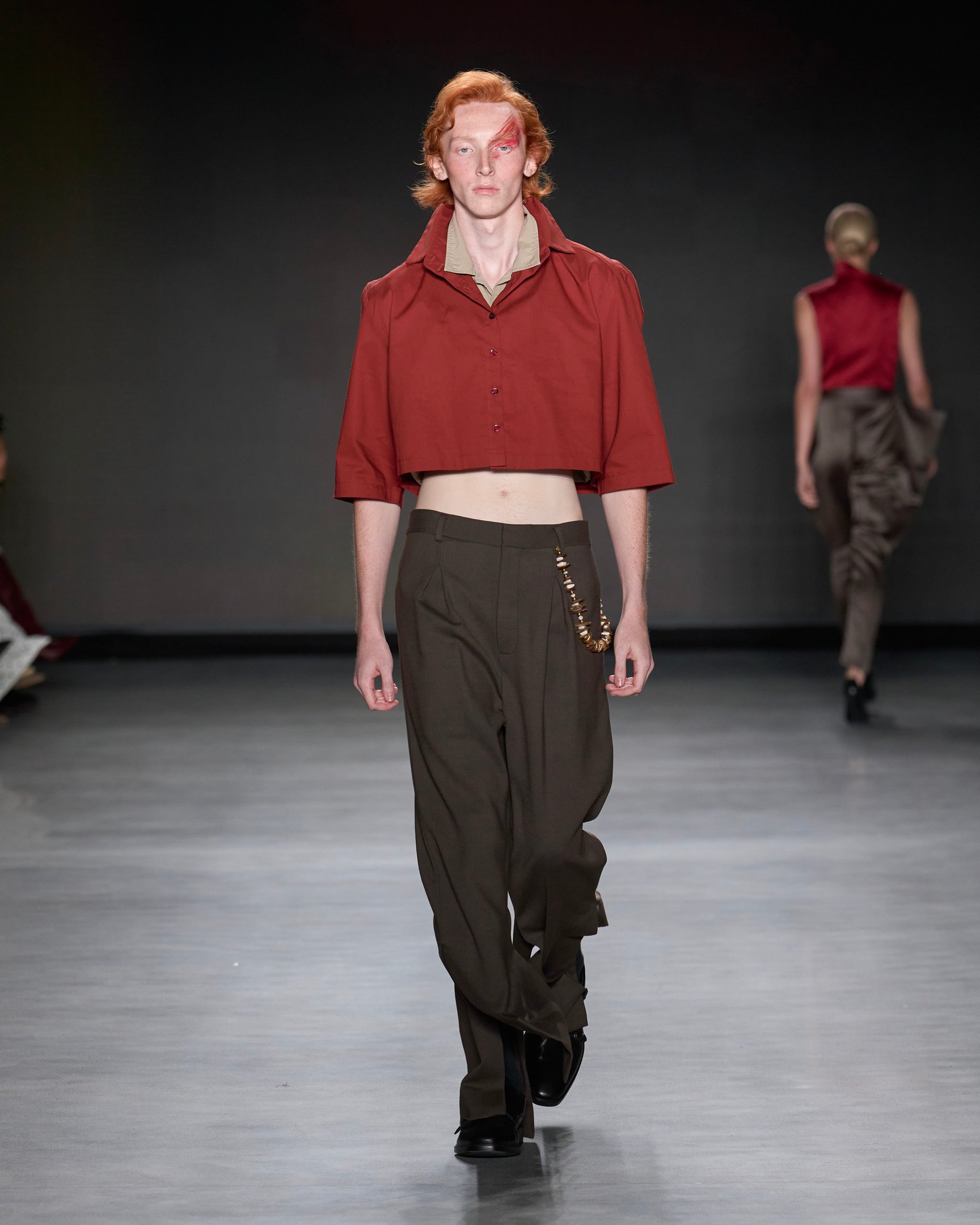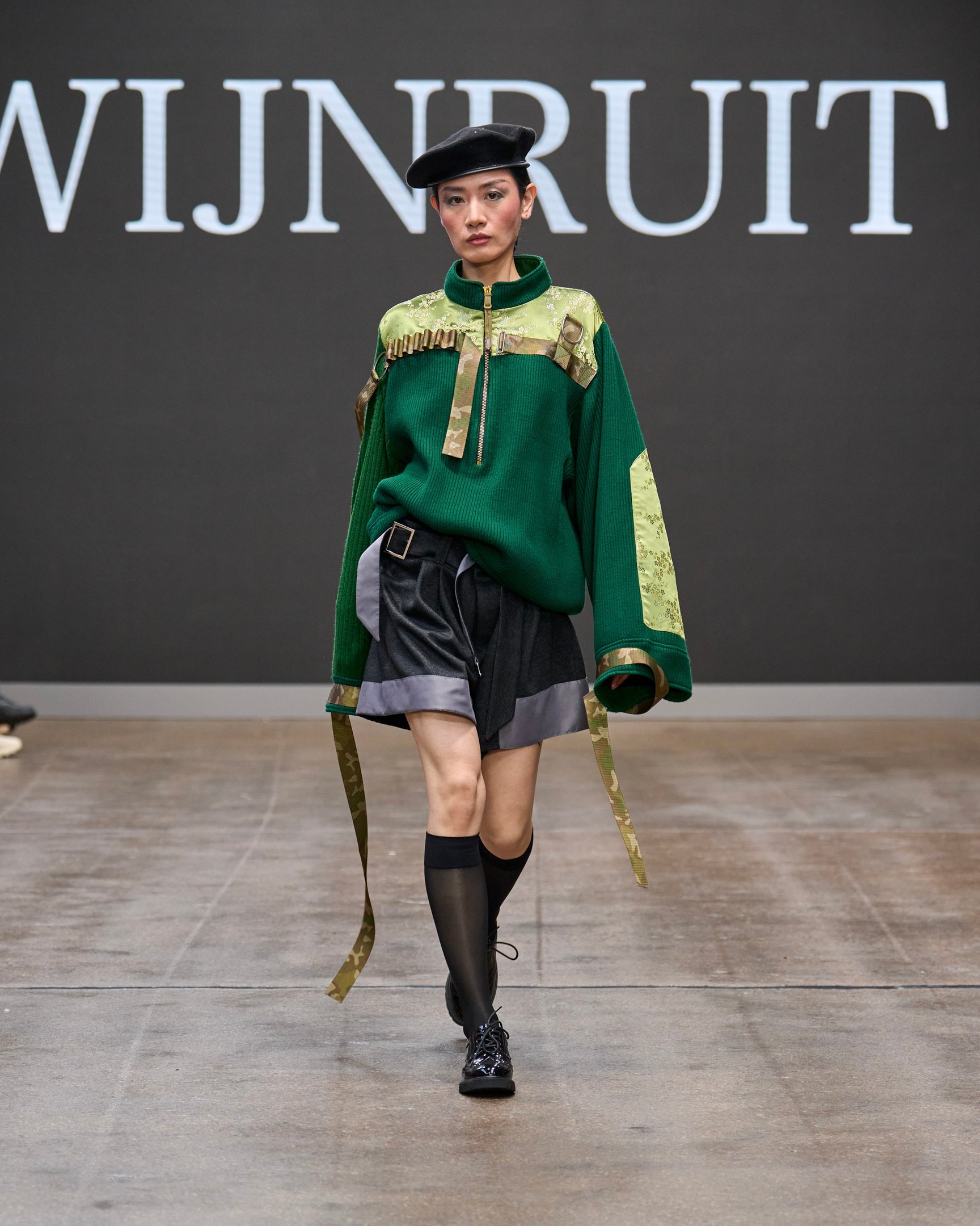 ロンドンを拠点に活動するジュエル・ケイが手掛けるウィンルートは今季、“崩壊から生成へ”という変容のプロセスをテーマに設定。シャープなテーラリングに、サテンやレースといった異なる質感を融合し、硬質さと流動性、緊張と緩和が交差するフォルムを構築。着崩しのニュアンスがストイックな造形にしなやかな動きを生み出し、相反する要素を融解させている。ロンドンらしい実験精神のもと、均整を崩した美しさで新たな表現を切り拓いた。