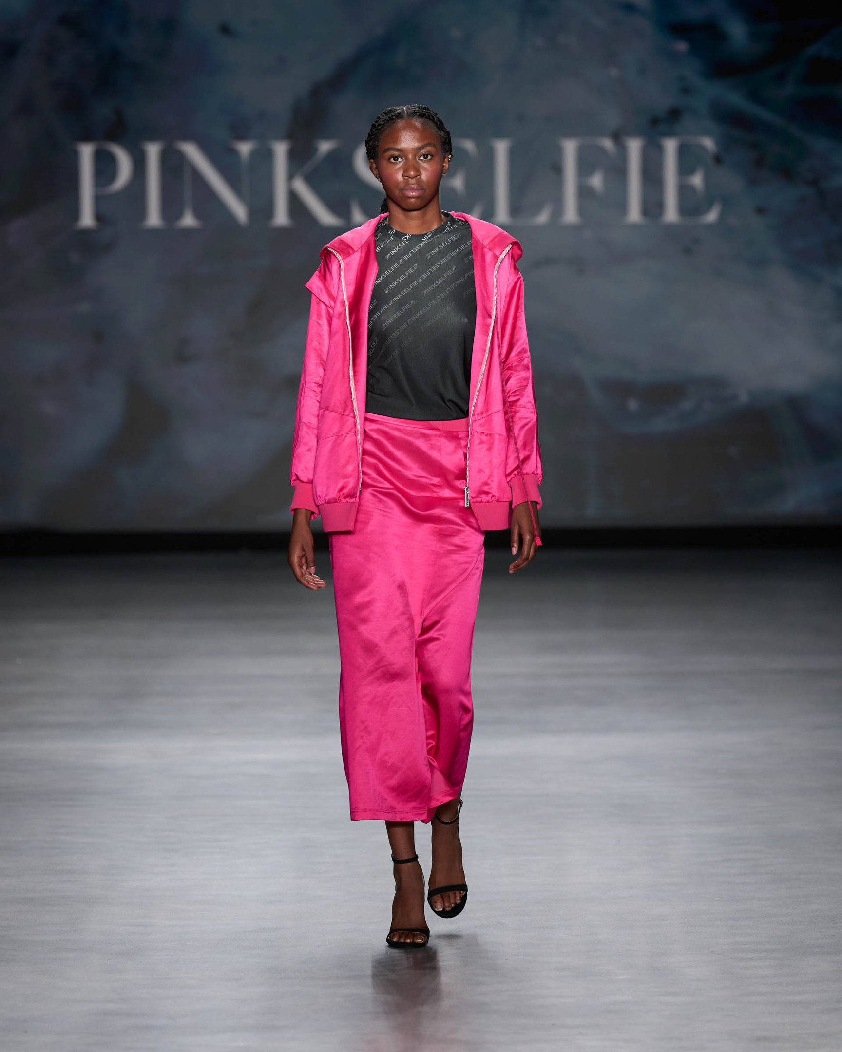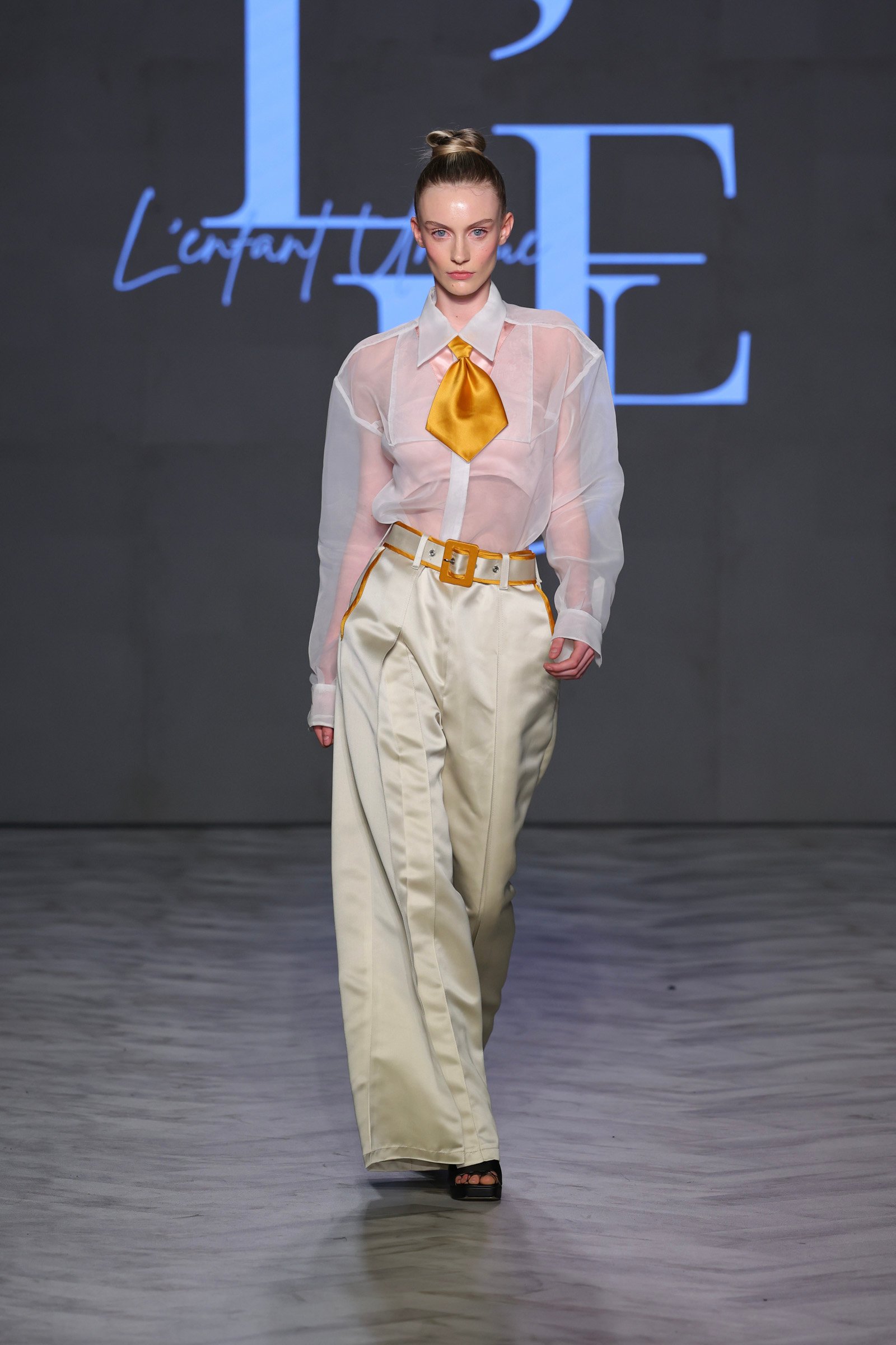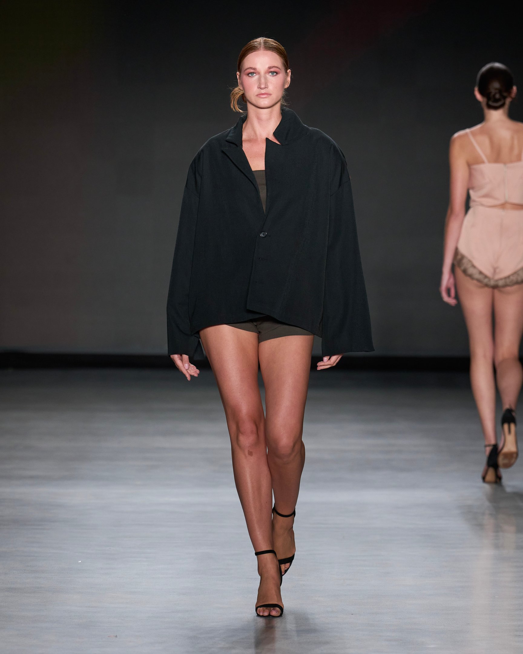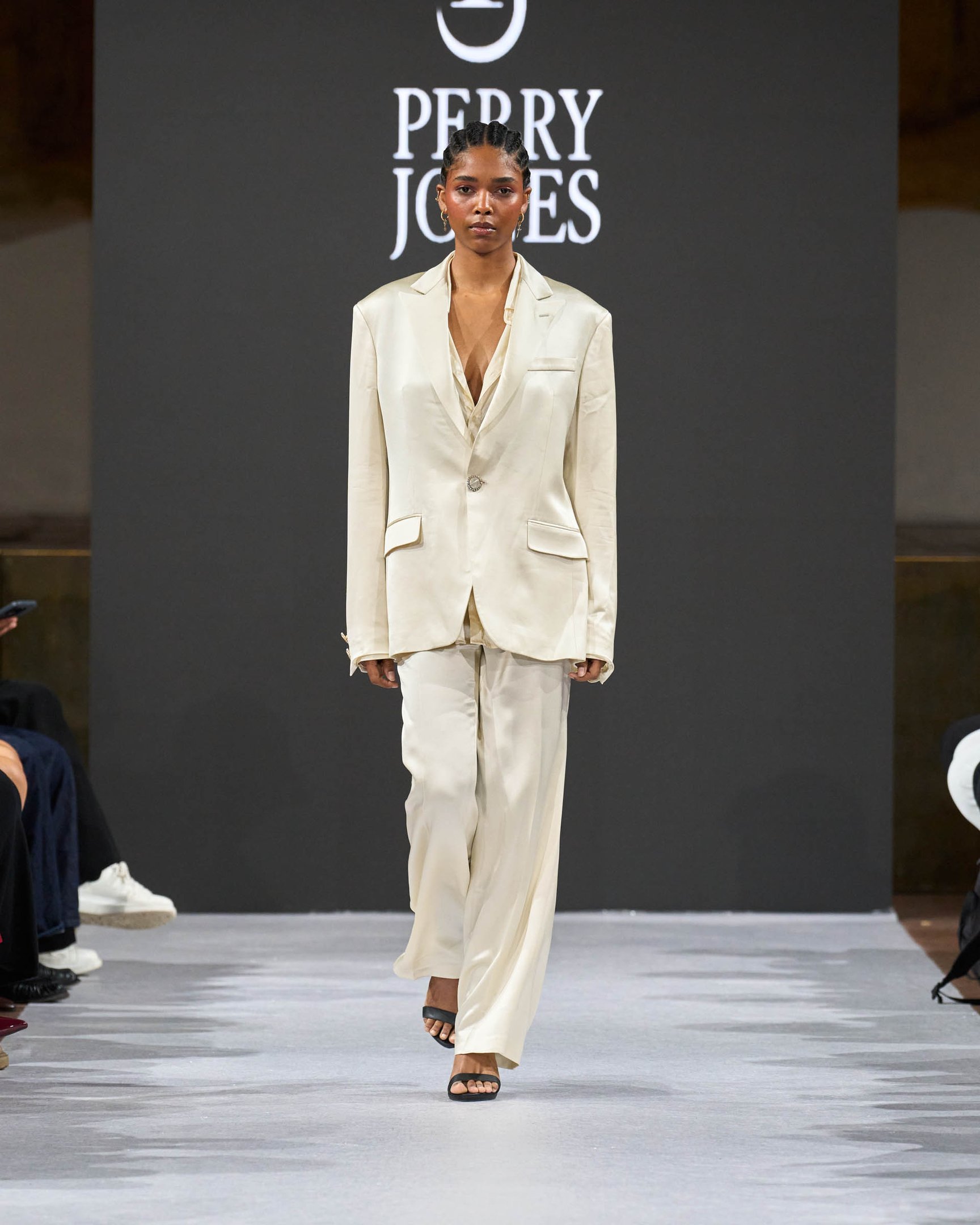 ロンドンを拠点に活動するジュエル・ケイが手掛けるウィンルートは今季、“崩壊から生成へ”という変容のプロセスをテーマに設定。シャープなテーラリングに、サテンやレースといった異なる質感を融合し、硬質さと流動性、緊張と緩和が交差するフォルムを構築。着崩しのニュアンスがストイックな造形にしなやかな動きを生み出し、相反する要素を融解させている。ロンドンらしい実験精神のもと、均整を崩した美しさで新たな表現を切り拓いた。
